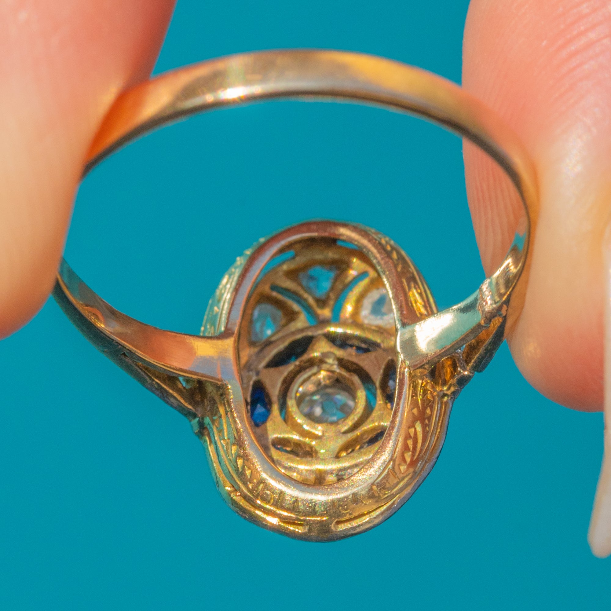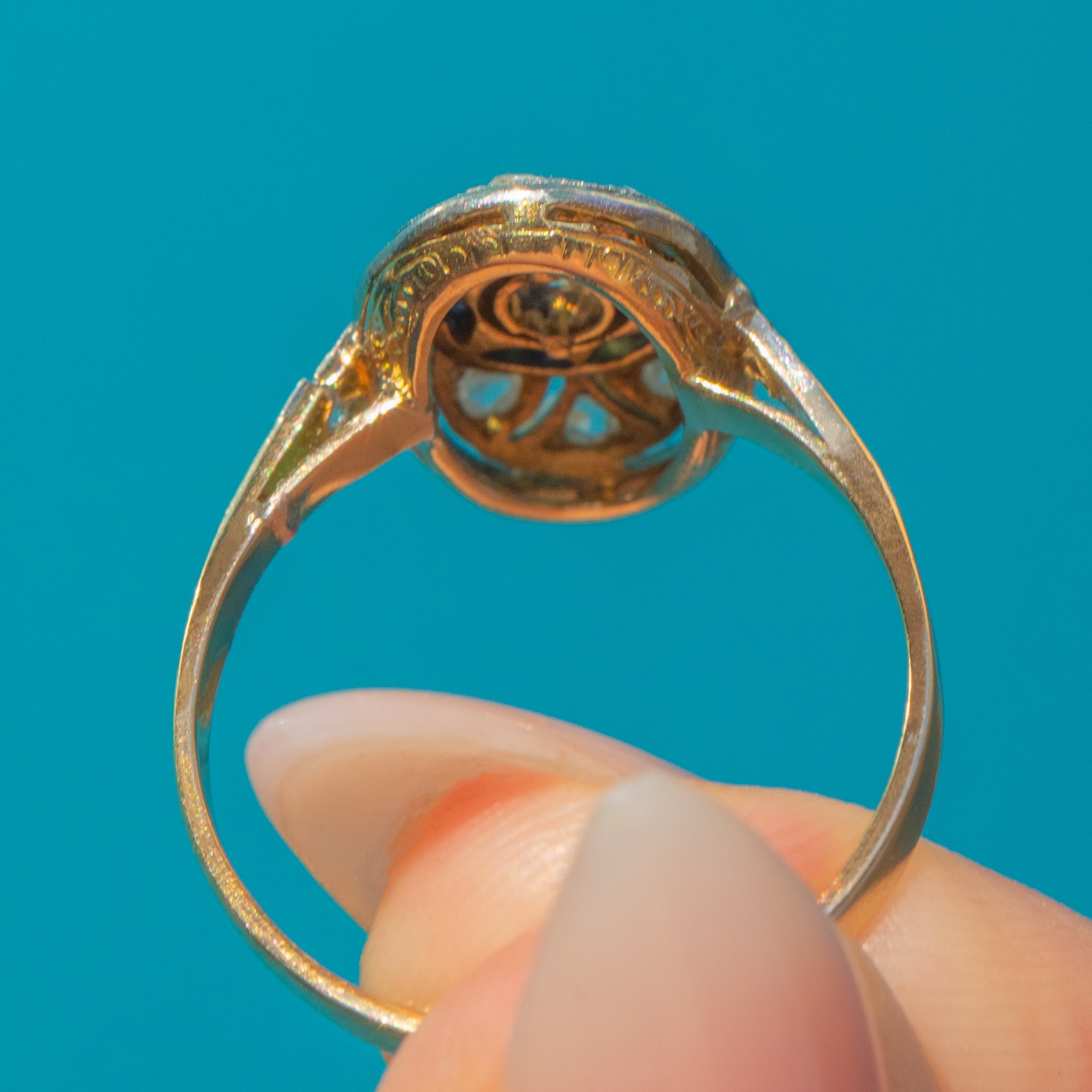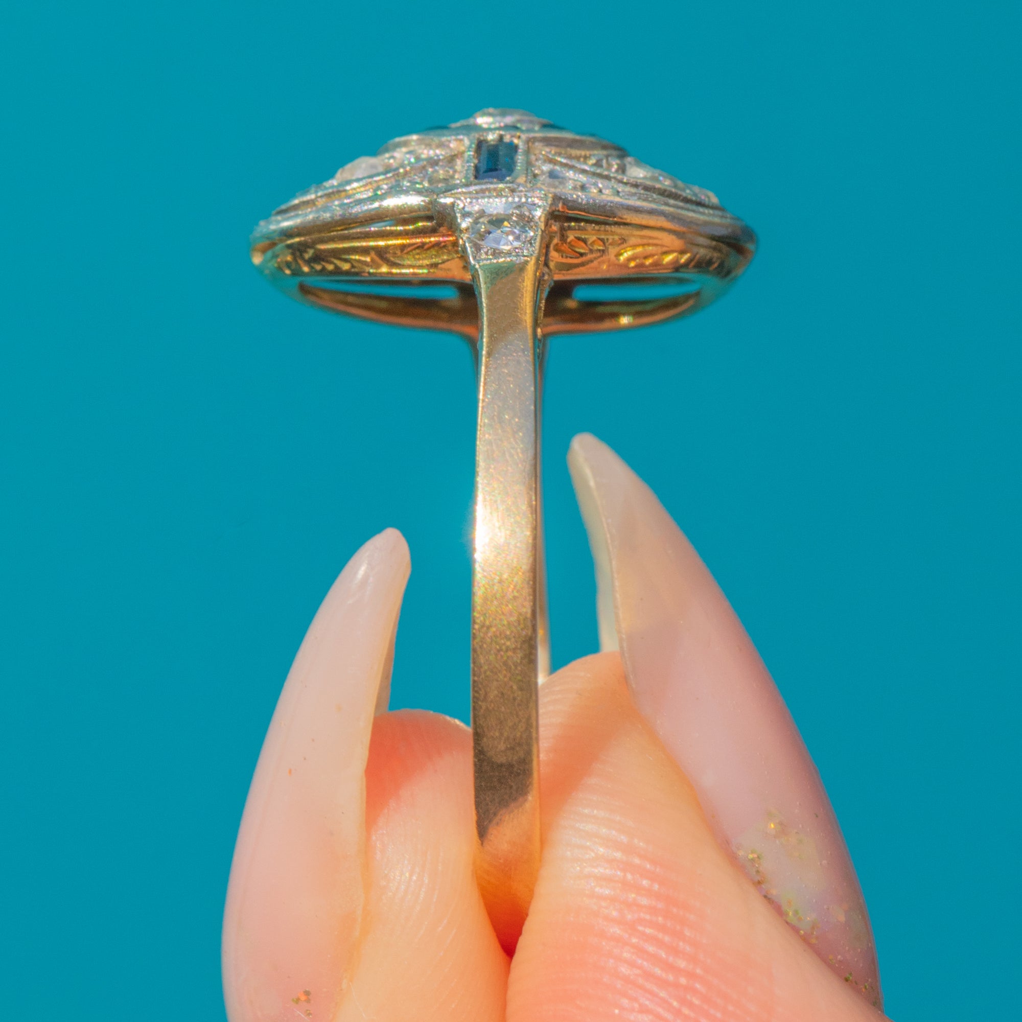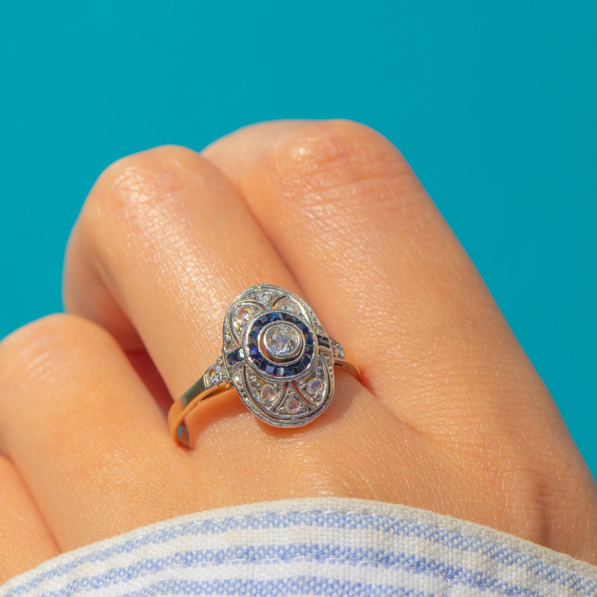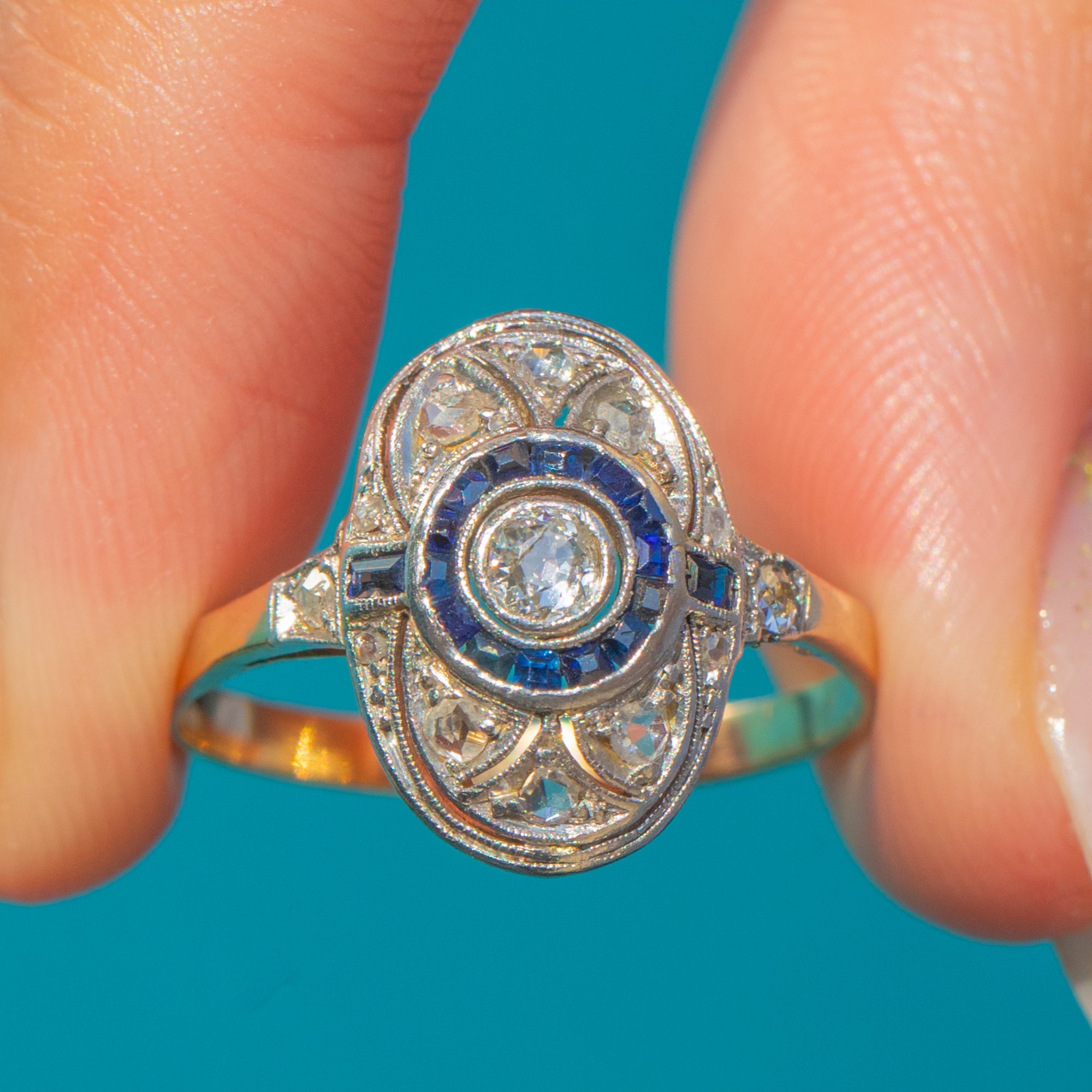 This beautiful Art Deco ring captures the glamour and precision of 1920s design. Crafted in 18ct Yellow Gold with a Platinum face, the ring showcases a sparkling Diamond at the centre, encircled by a halo of calibre-cut royal blue Sapphires. Surrounding the target cluster are additional old-cut Diamonds, set within a finely engraved profile typical of the era.