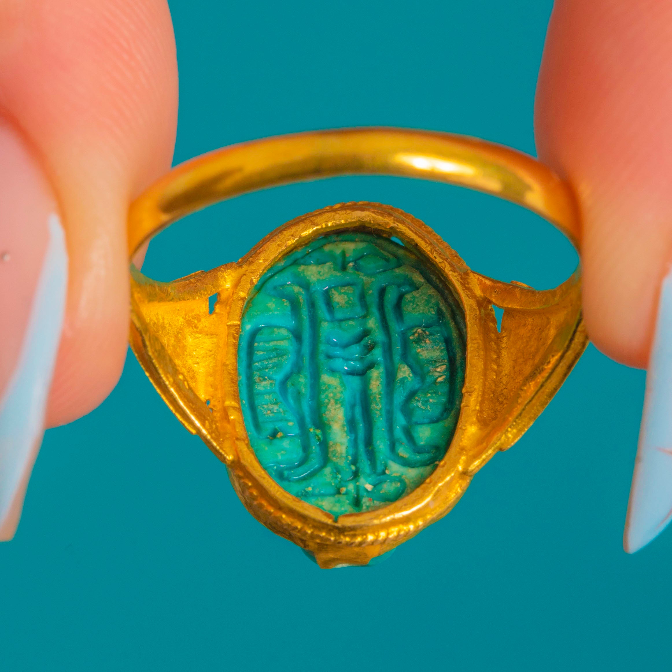 VERY GOOD: The faience scarab presents well, with movement in the original setting causing a slight wobble, but it remains secure in its mount. The 22ct Gold band and engraved shoulders are in lovely condition with light surface wear consistent with age. Due to the age and nature of the scarab setting, we recommend this ring is worn with care and not as an everyday piece.