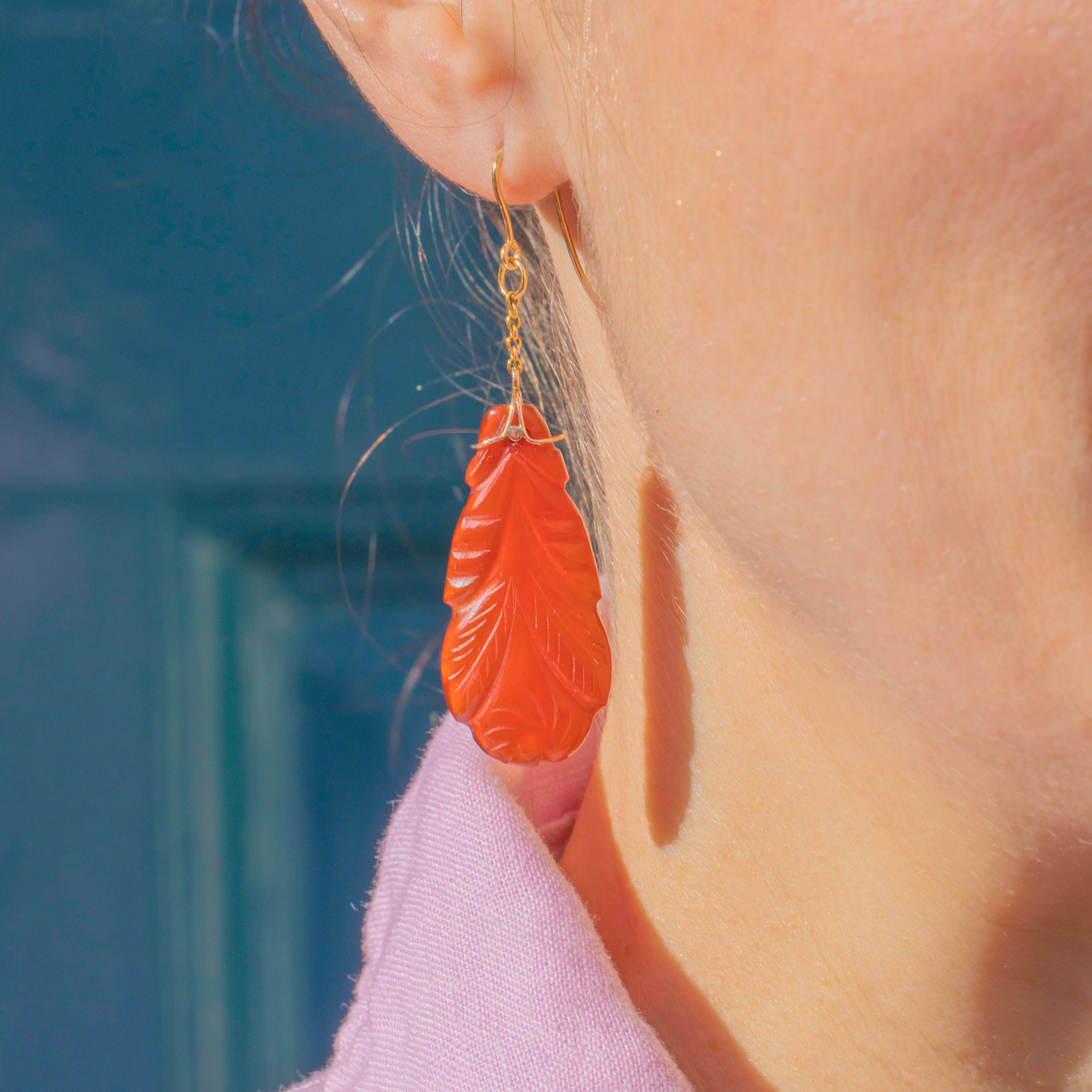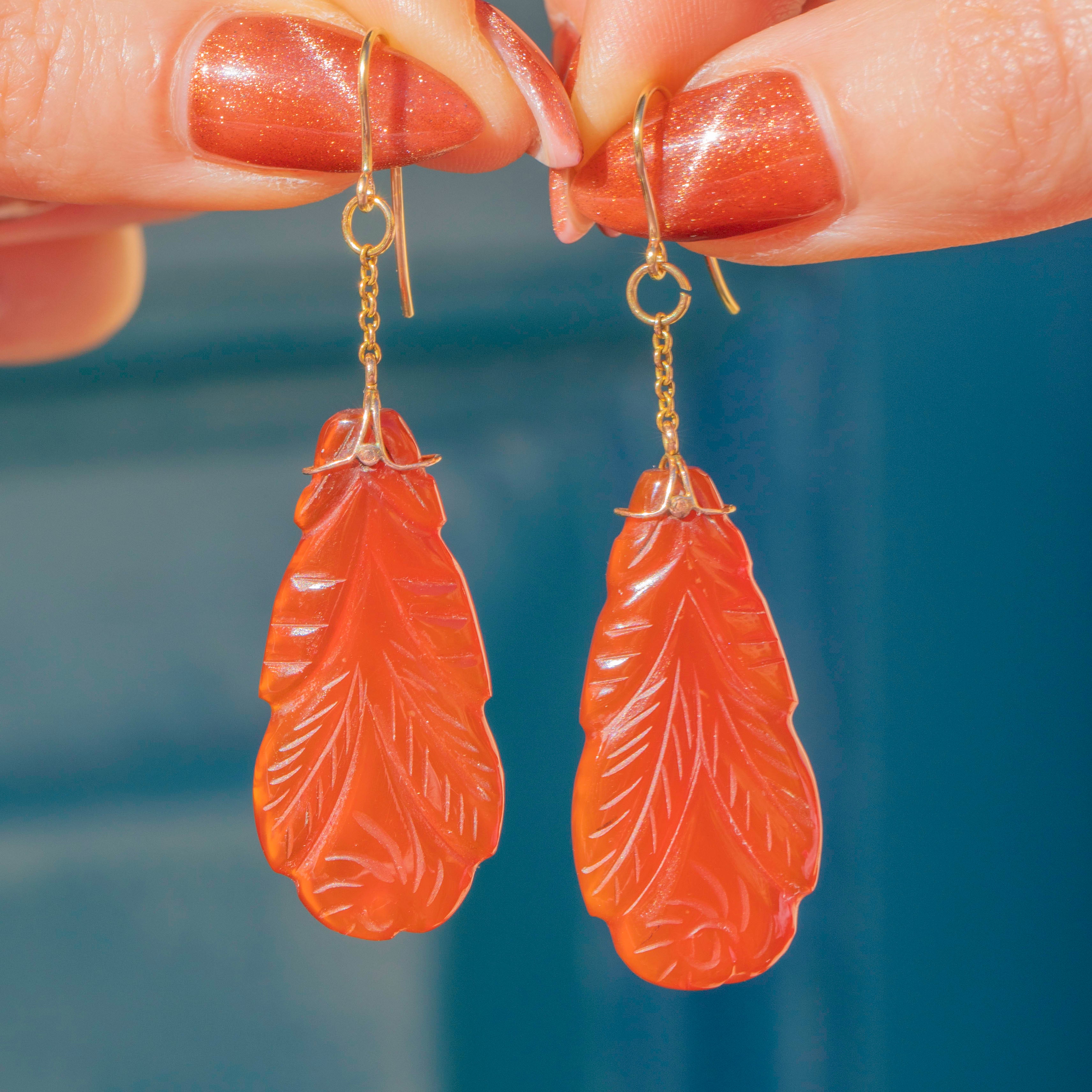 If you have a penchant for unique jewels, these Art Deco 9ct Gold carved Carnelian drop earrings are a must for your collection! Akin to falling autumn leaves, the Carnelian drops have been exquisitely hand-carved and catch the light magnificently as they suspend from your lobes.