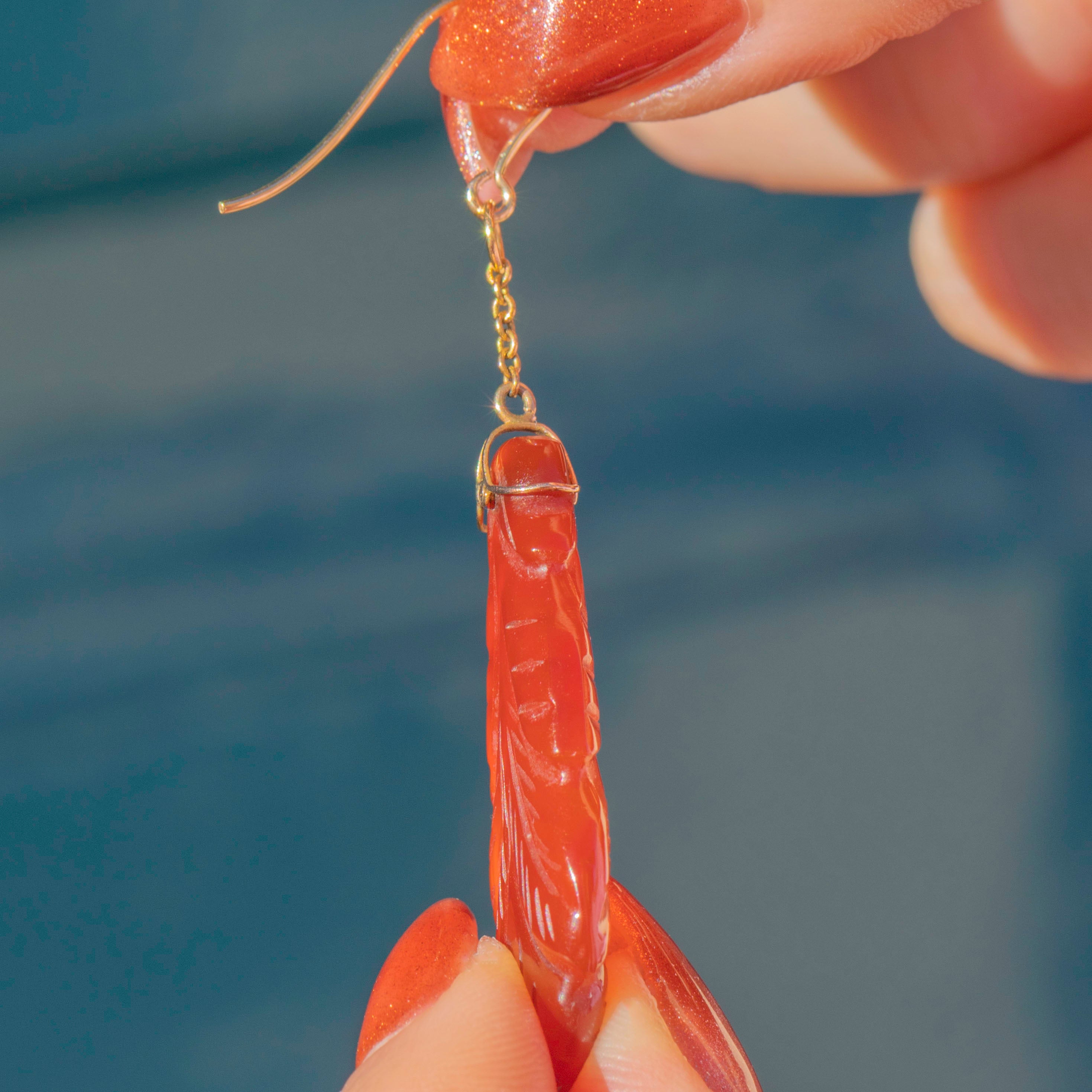EXCELLENT. These Art Deco 9ct Gold carved Carnelian drop earrings are in excellent condition. The Carnelian drops are free from chips or abrasions and their carved details are defined. The Gold is bright and hold the Carnelian in place, with their generously sized hooks providing confident wear!