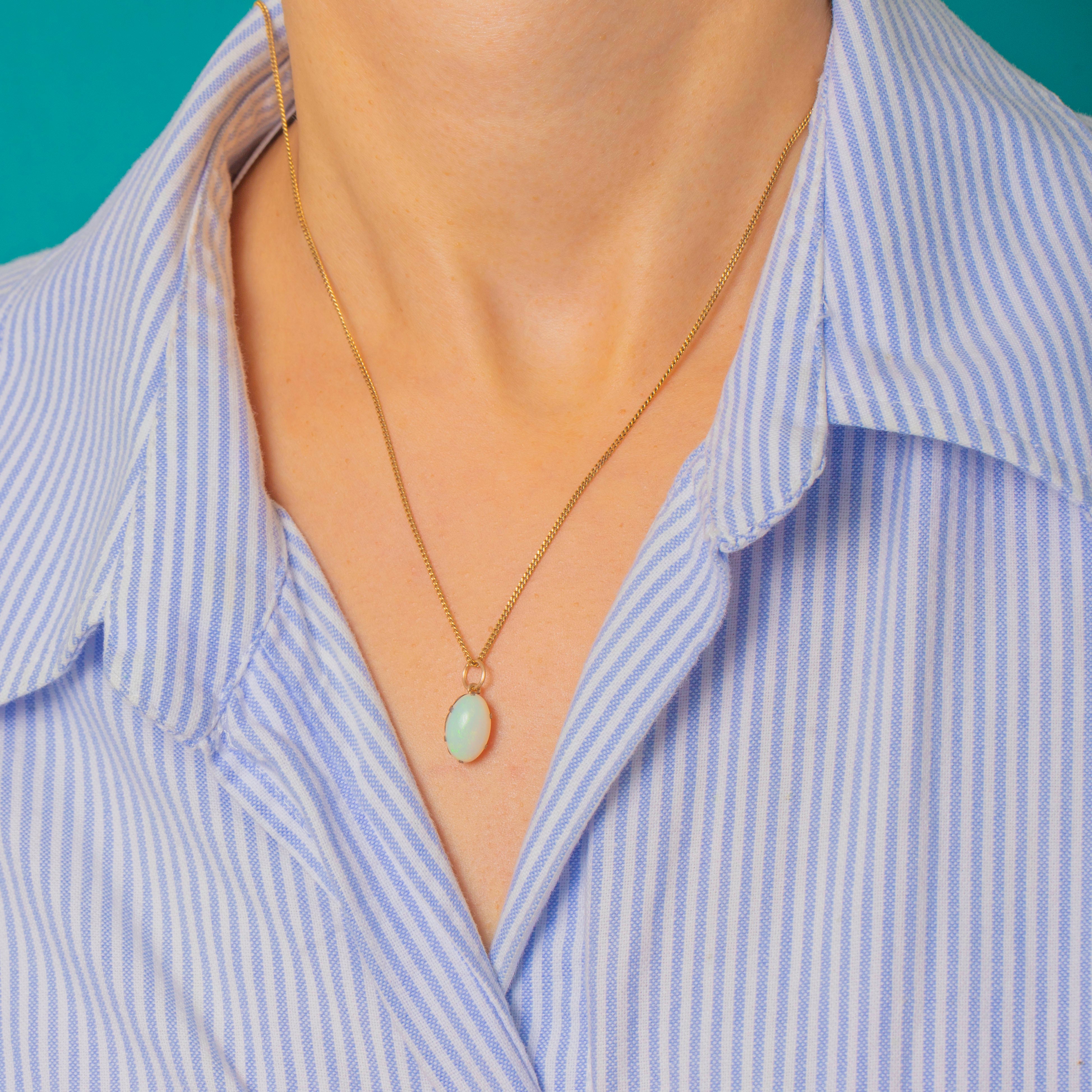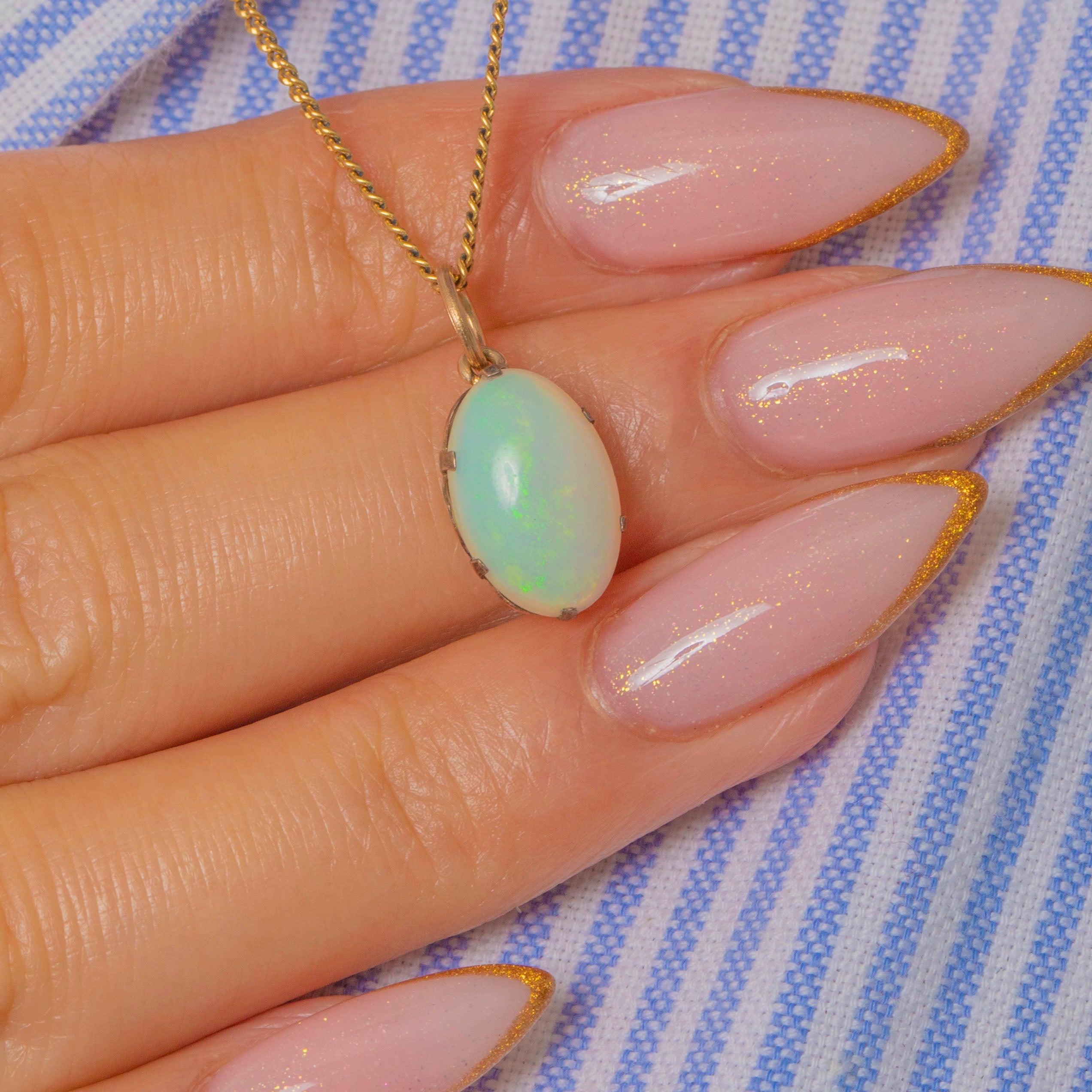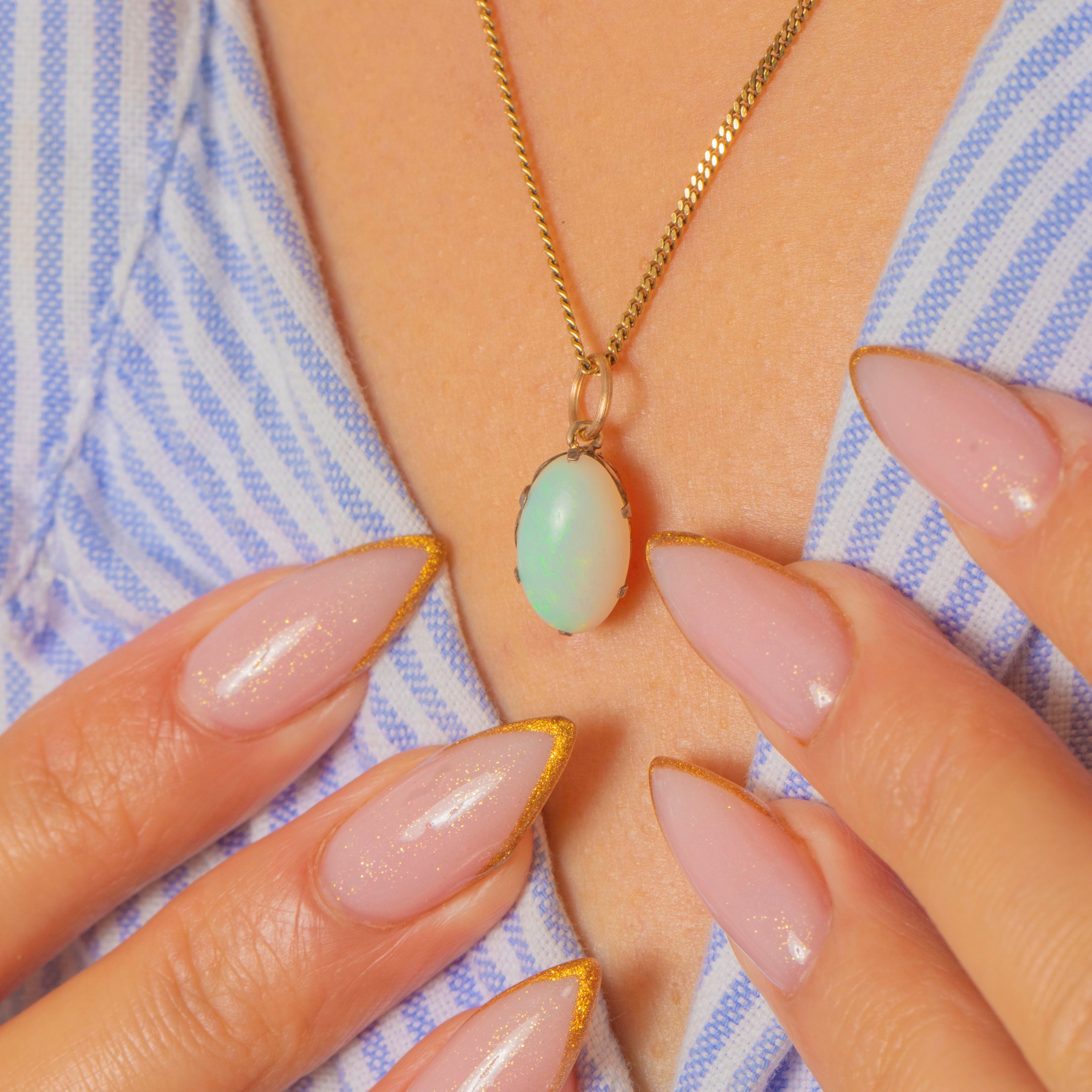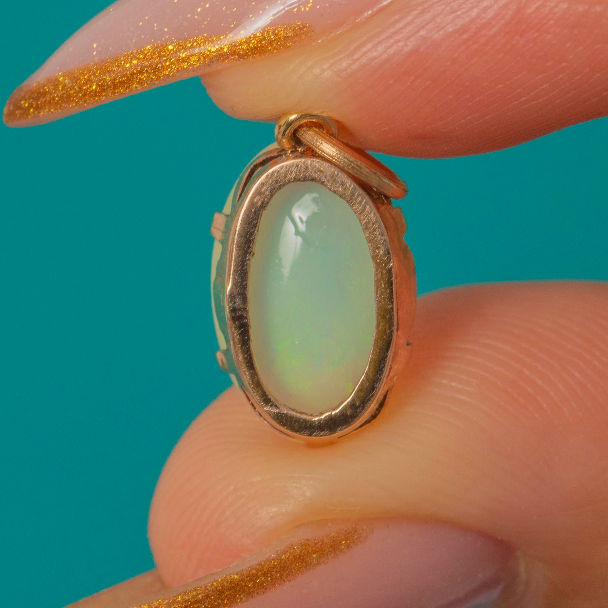 The natural solid Opal, weighing approximately 1.50ct, is beautifully set in elegant 9ct Gold claws, with a smooth, minimalist finish. A perfect piece to wear alone or layered with other antique charms for a touch of colour and light.