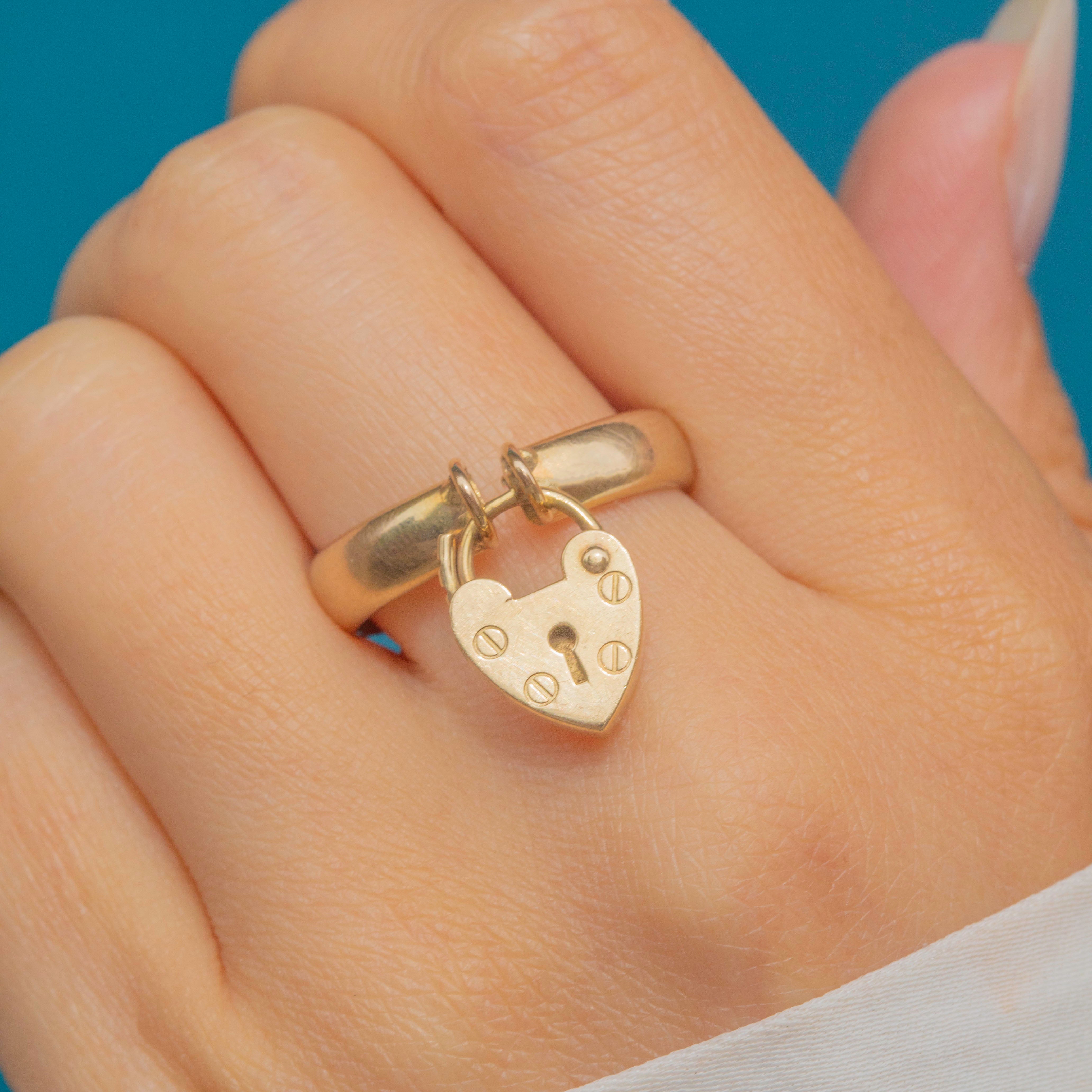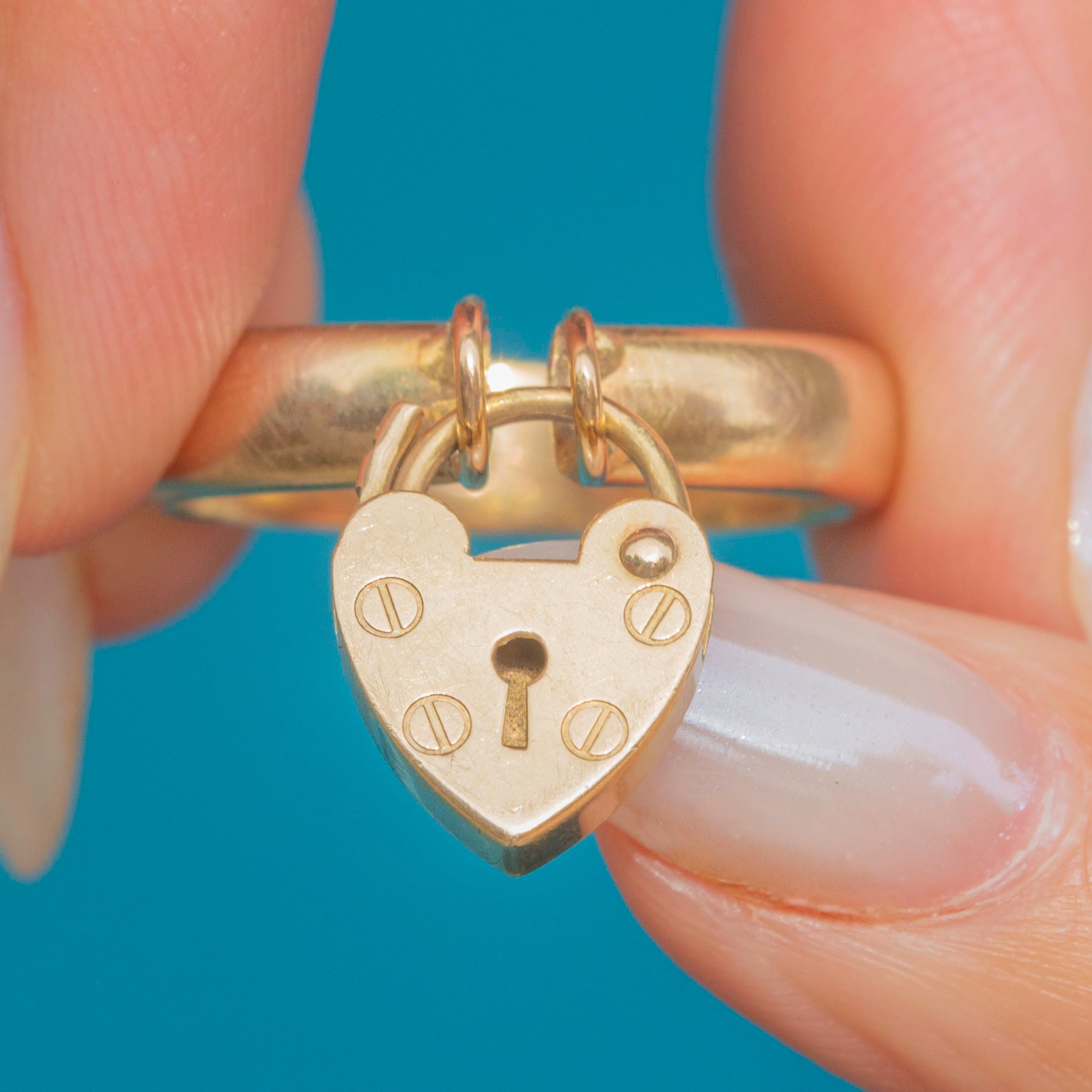 This Art Deco ring has been beautifully crafted from solid 9ct Gold and features a bold, curvaceous band with a charming heart padlock that hangs gracefully, with a full set of hallmarks that date to 1935.