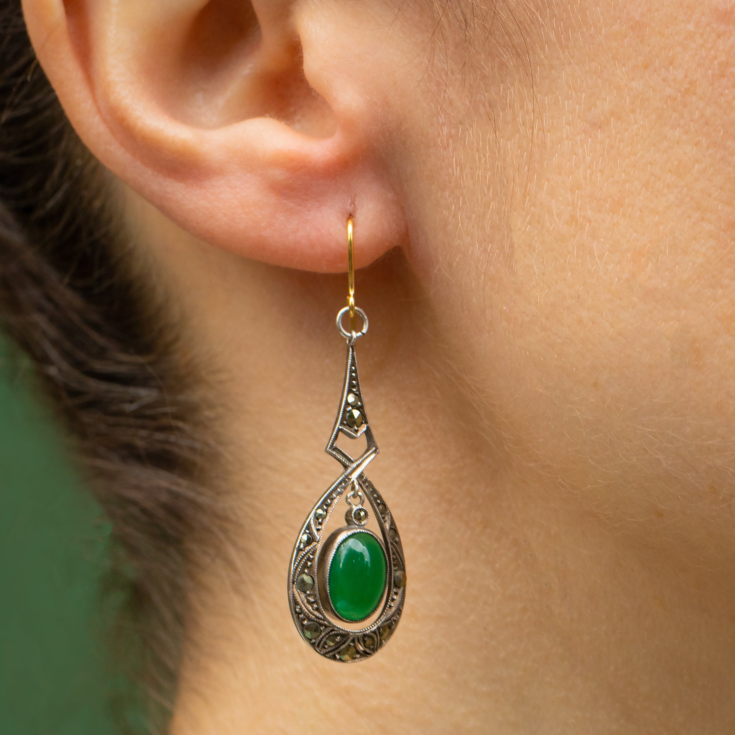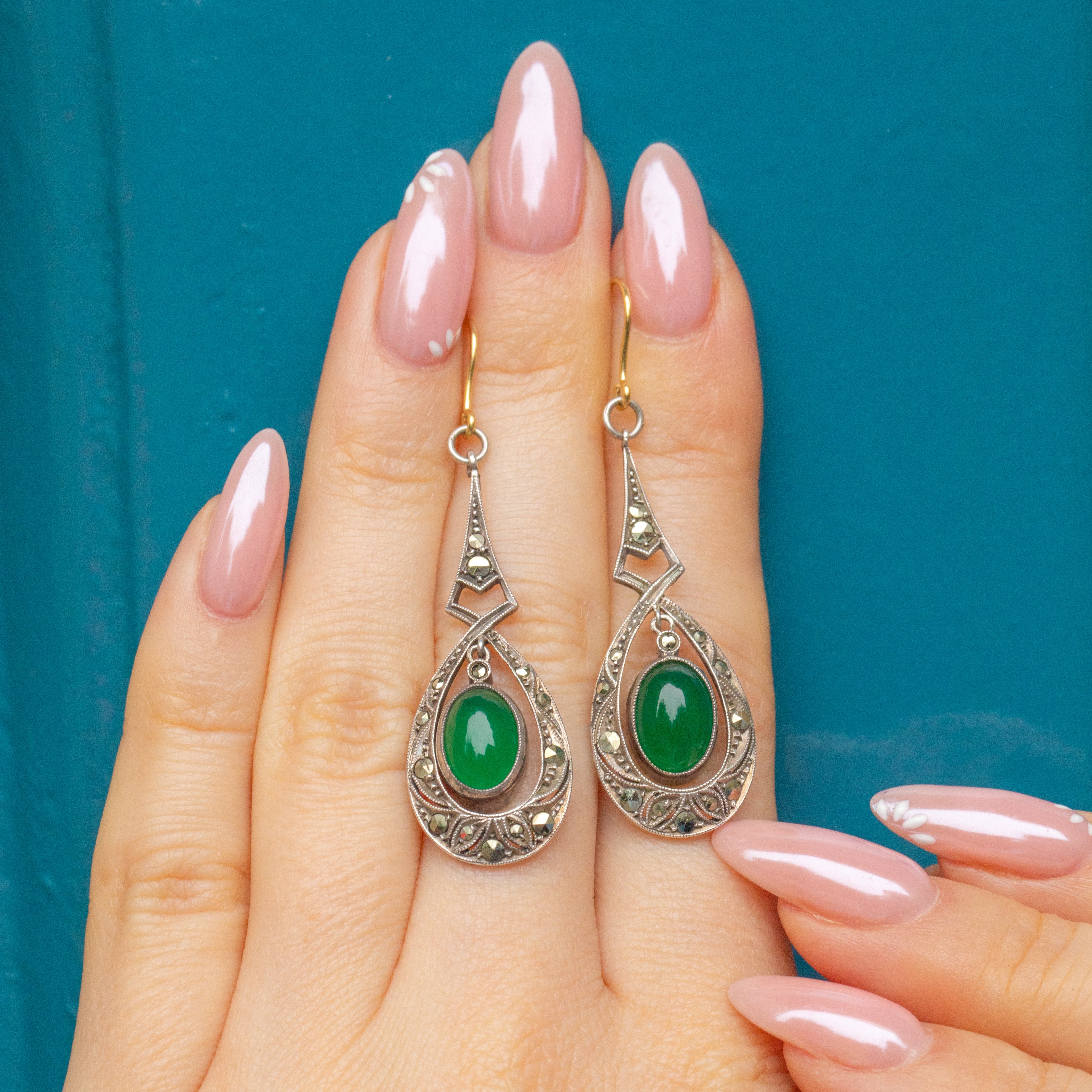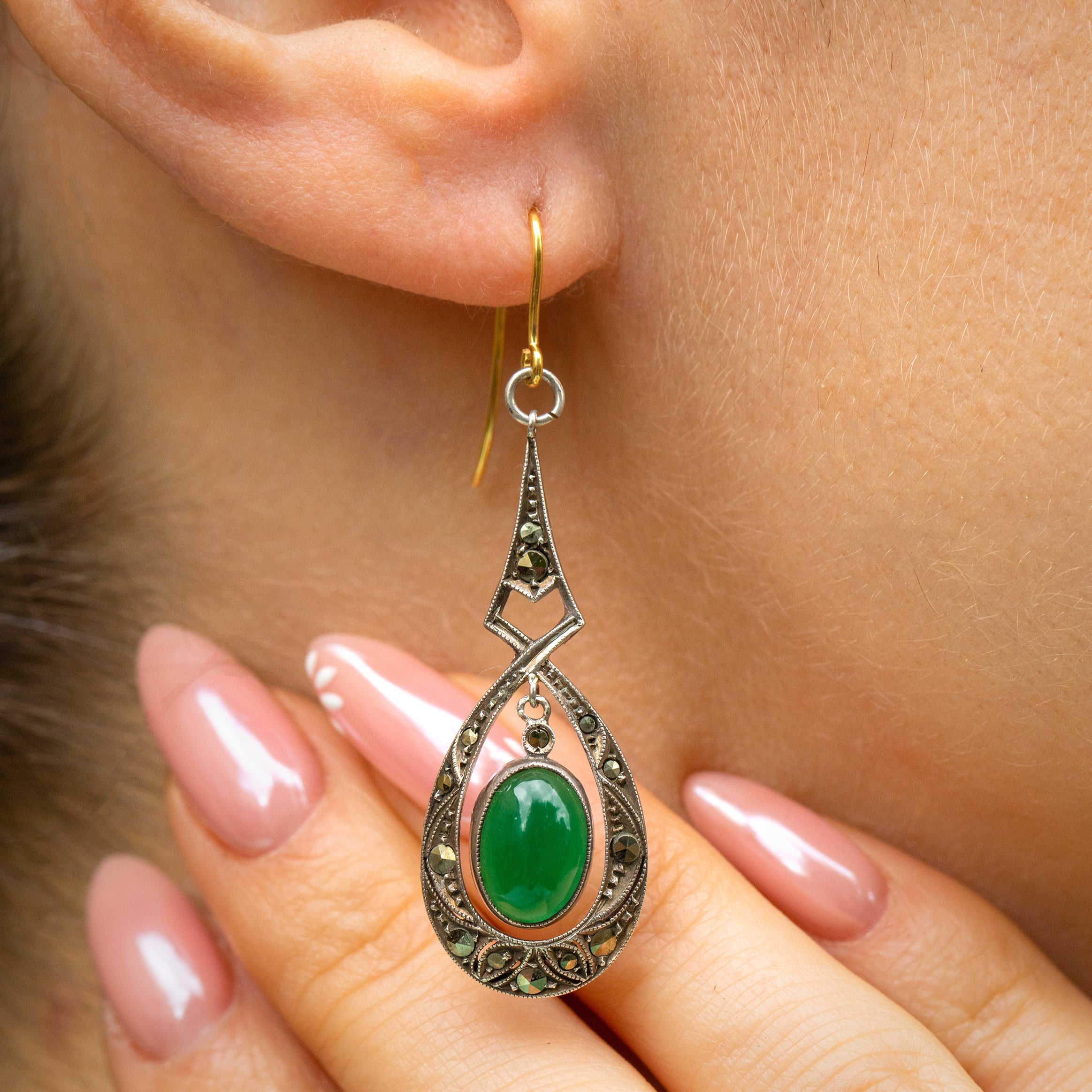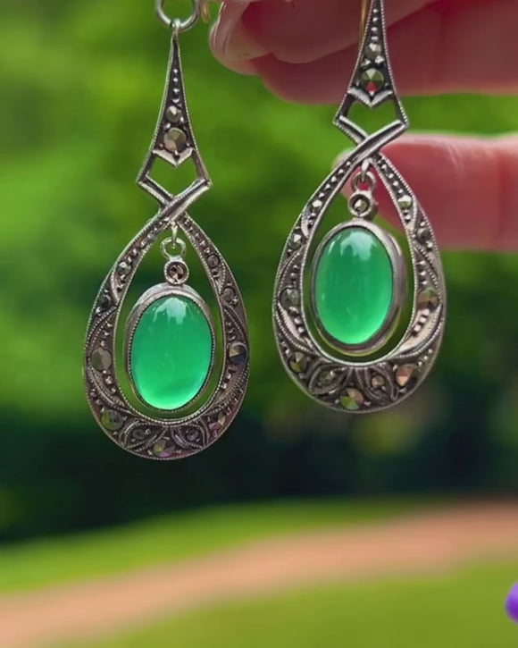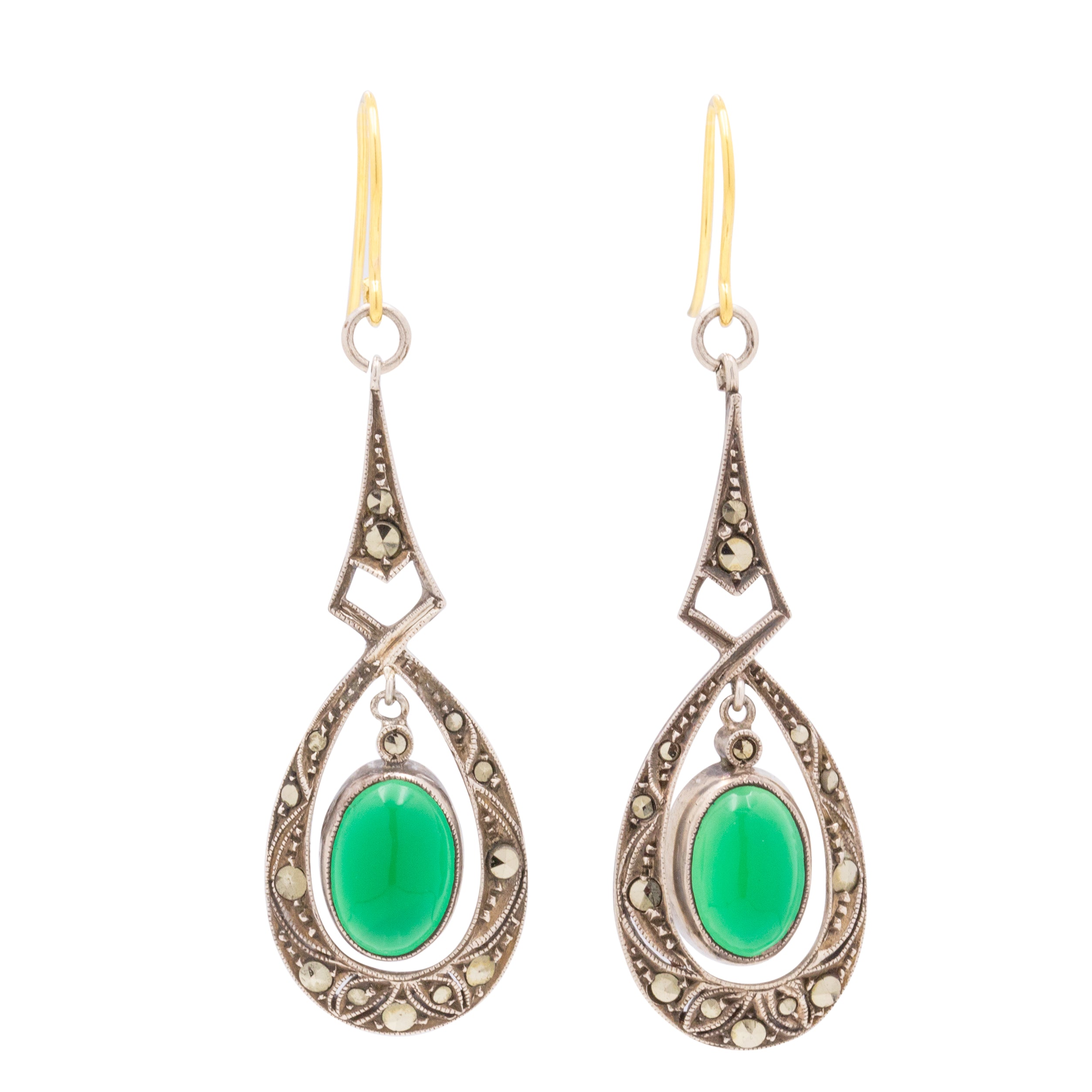 VERY GOOD-EXCELLENT. We are pleased to report that these Art Deco Chrysoprase drop earrings are in wonderful condition. The Chrysoprase cabochons are smoothly domed, securely set, and free from chips or abrasions. The Marcasite are all present and securely set and provide a subtle sparkle. The Silver is lustrous and has accrued a light patina, creating a dramatic finish to these striking Art Deco earrings! Complete with 9ct Gold hooks, you can wear these antique earrings with absolute confidence!