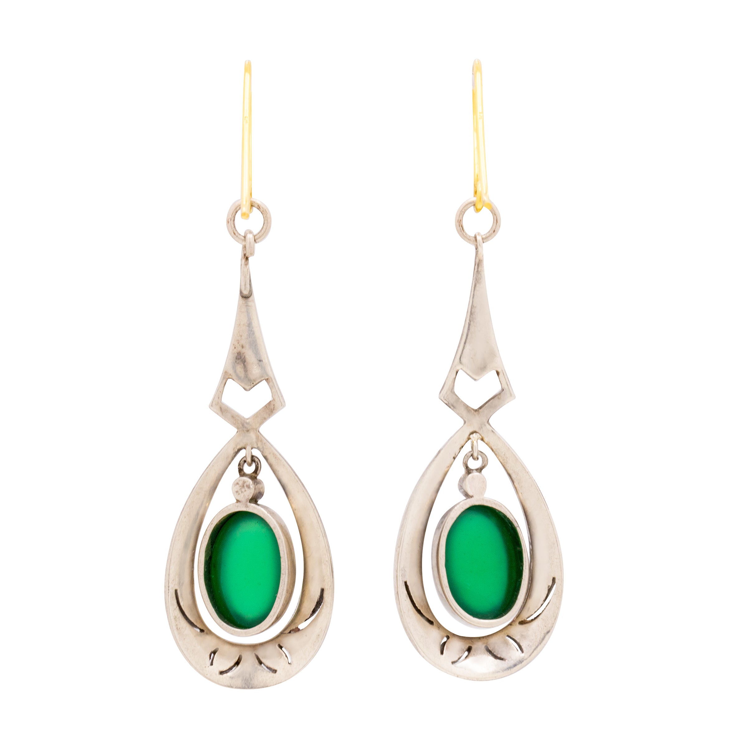 The focal point of the antique Silver earrings is the deep apple green splendour of the Chrysoprase which suspends from the centre, providing unmissable movement.  These Art Deco earrings sit neatly within the ear and her drops add a glitzy and sophisticated edge.