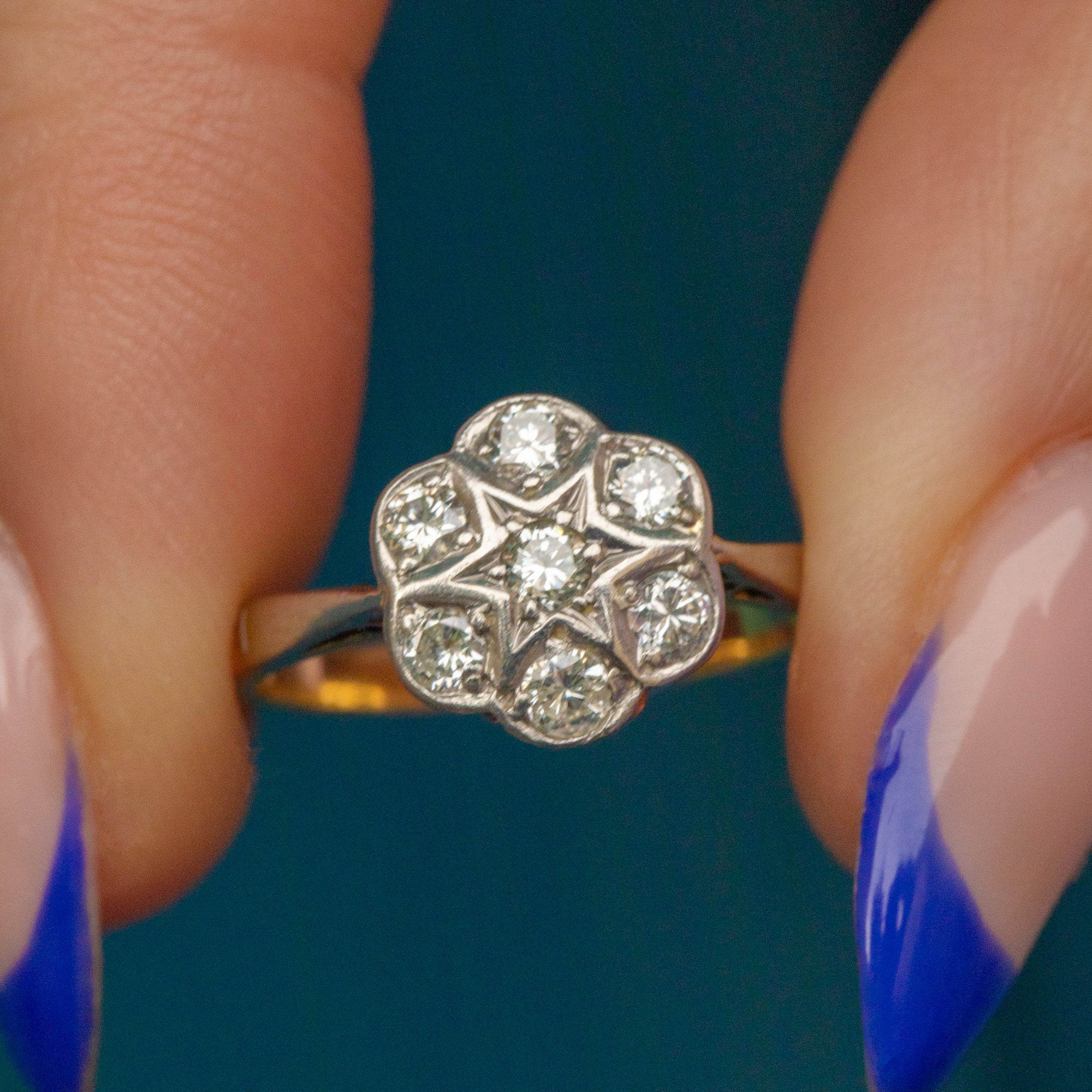 This 18ct Gold Art Deco Diamond daisy cluster ring is feminine and timeless. A pretty Diamond ring like this would be the perfect choice for a unique engagement ring, taking on a form of which you could never tire- a beautiful flower whose bloom will be everlasting!