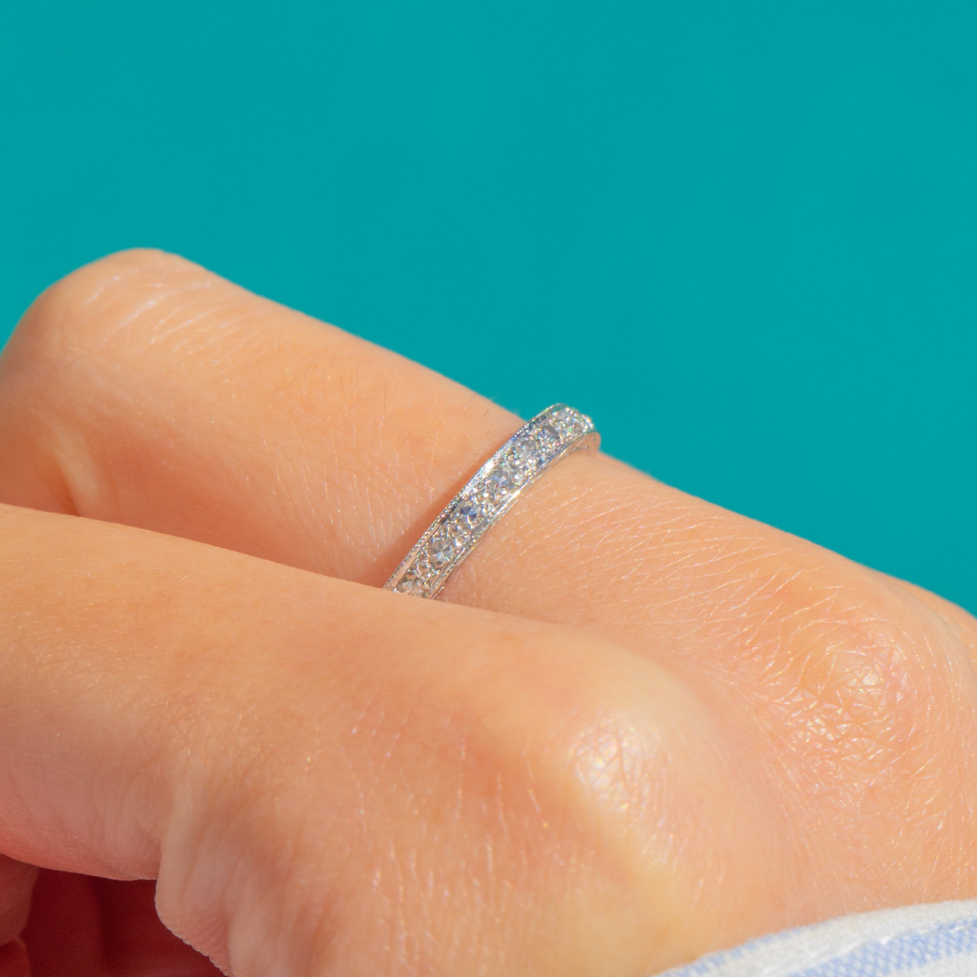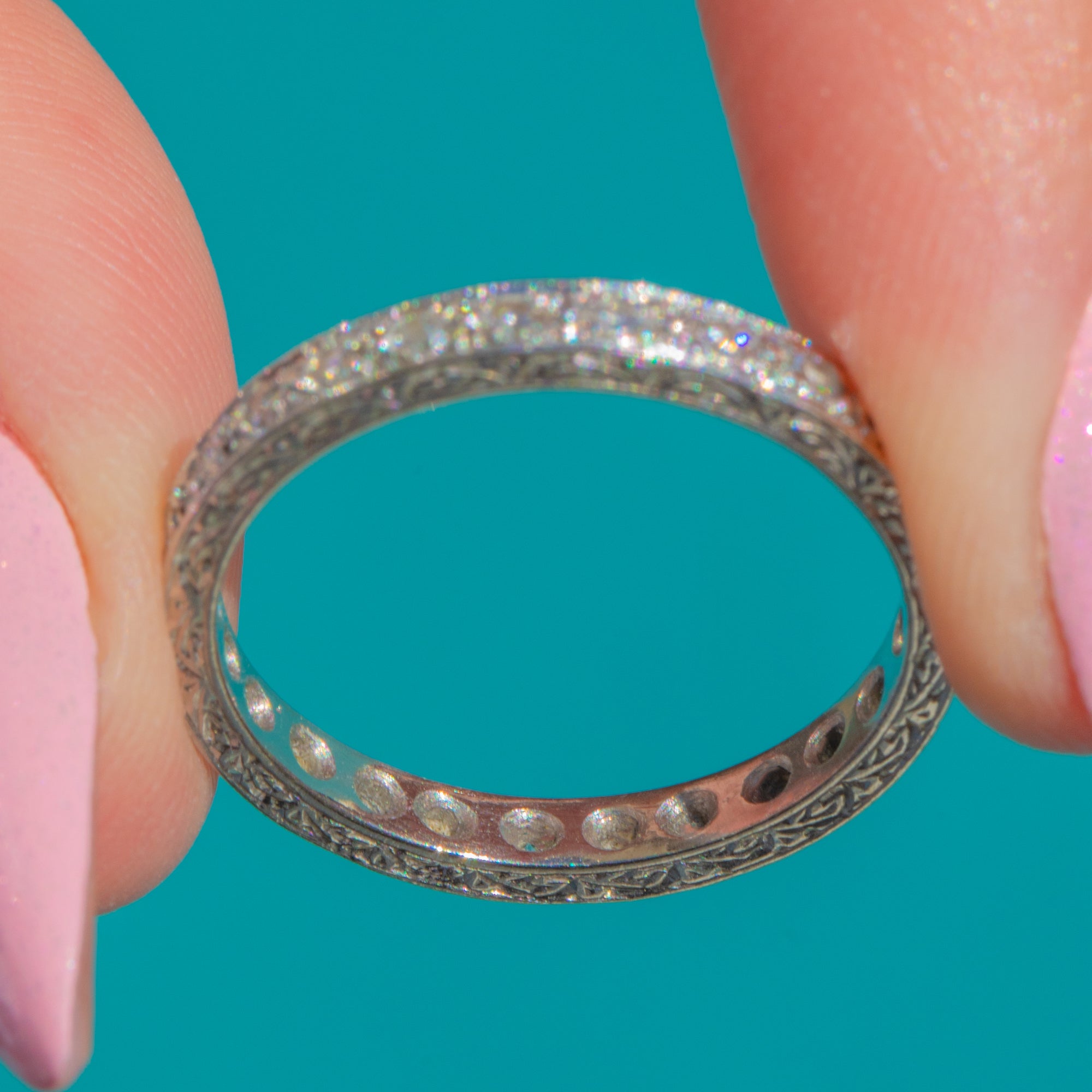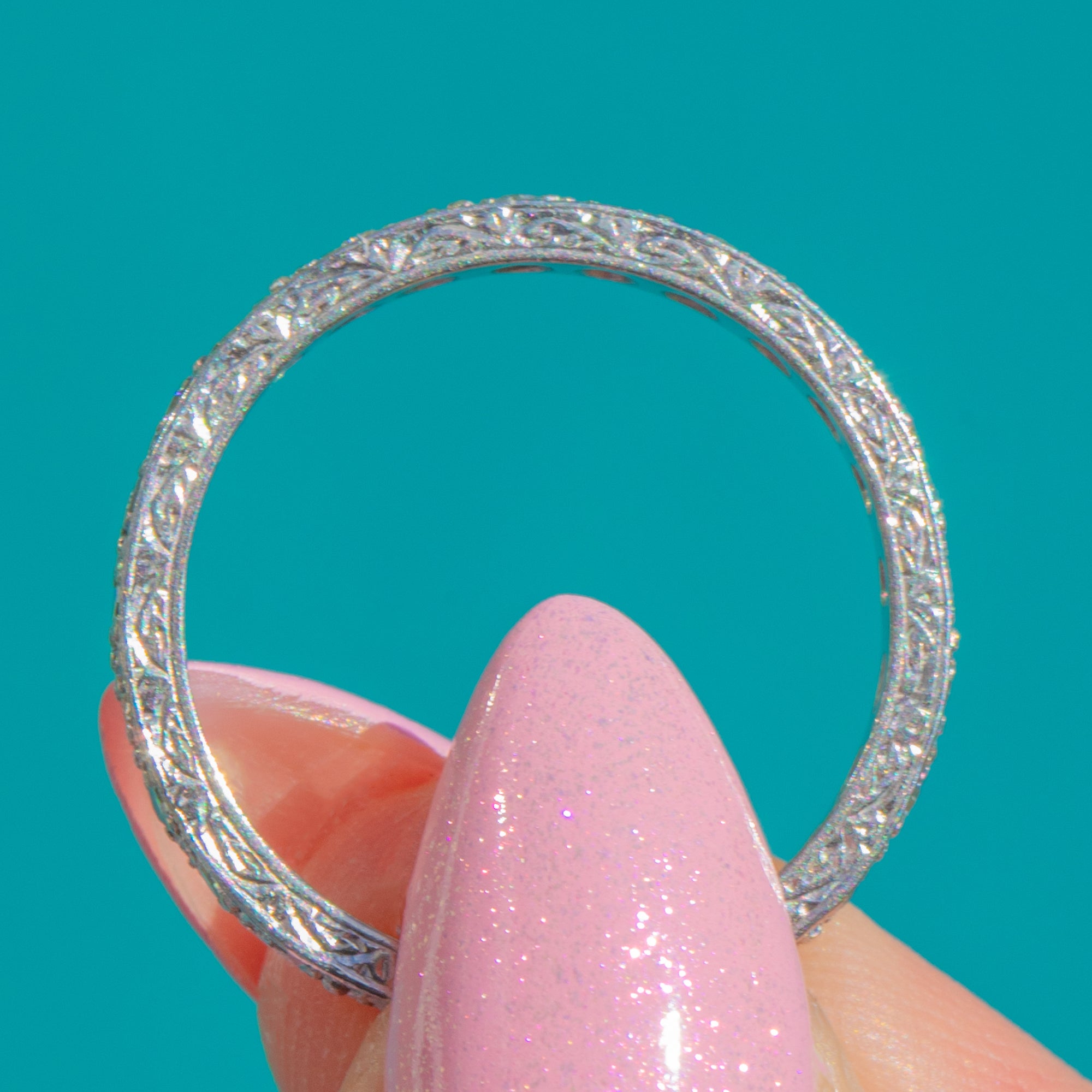 A classic Art Deco treasure, this finely wrought Platinum full-eternity band shimmers with a seamless halo of Diamonds. The delicate milgrain borders frame each tiny stone to elegant effect, while the hand-engraved foliate scrolls flow all the way around the shank for a beautiful, artisanal finish. A pierced under-gallery allows light to dance through the Diamonds, enhancing their lively sparkle.