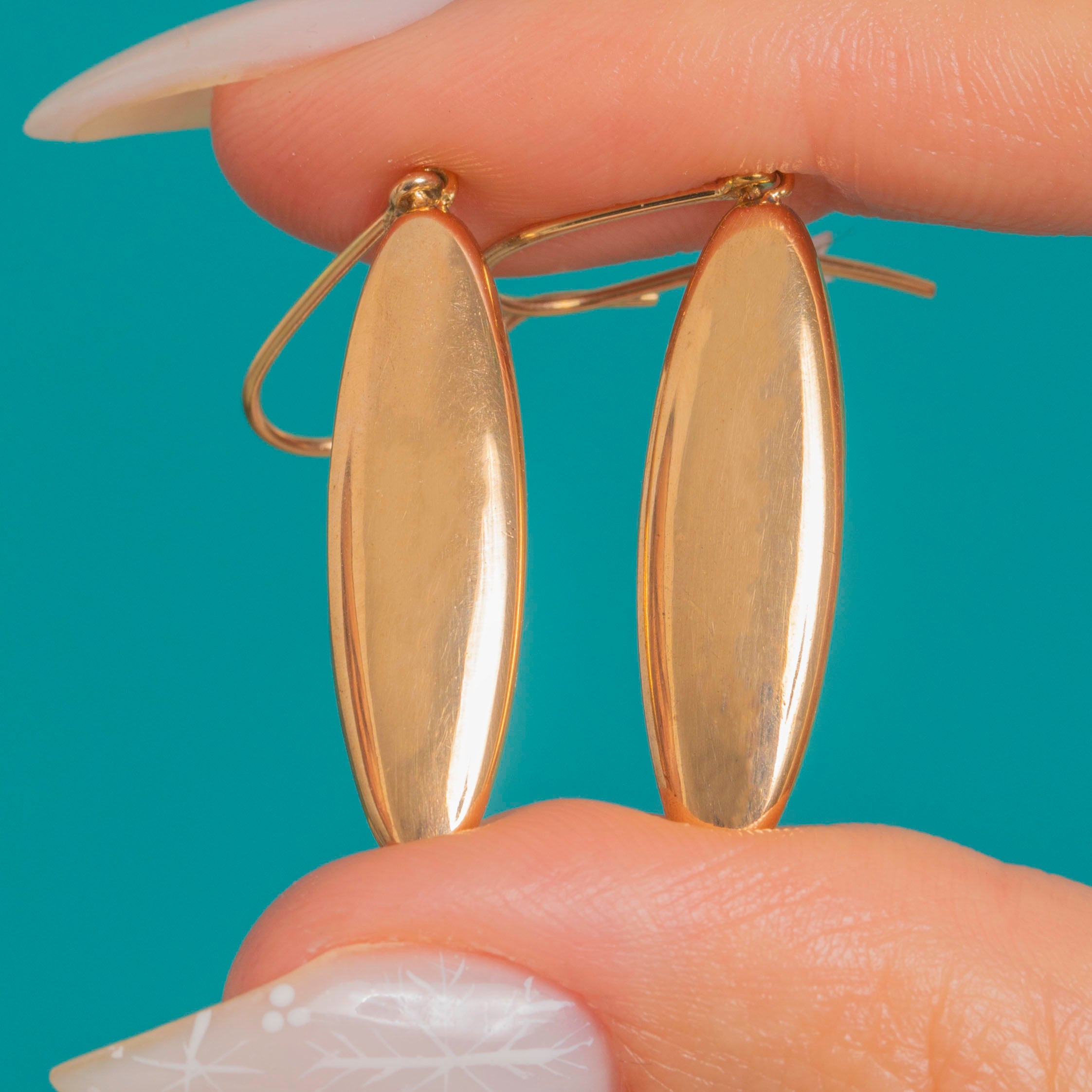 Sleek and streamlined, these elongated navette drop earrings distil Art Deco elegance to its purest form. The high-polish, mirror-like Gold-cased capsules are hollow, domed pressed shells with gently tapered tips, catching the light with every movement for a refined, minimalist glow.