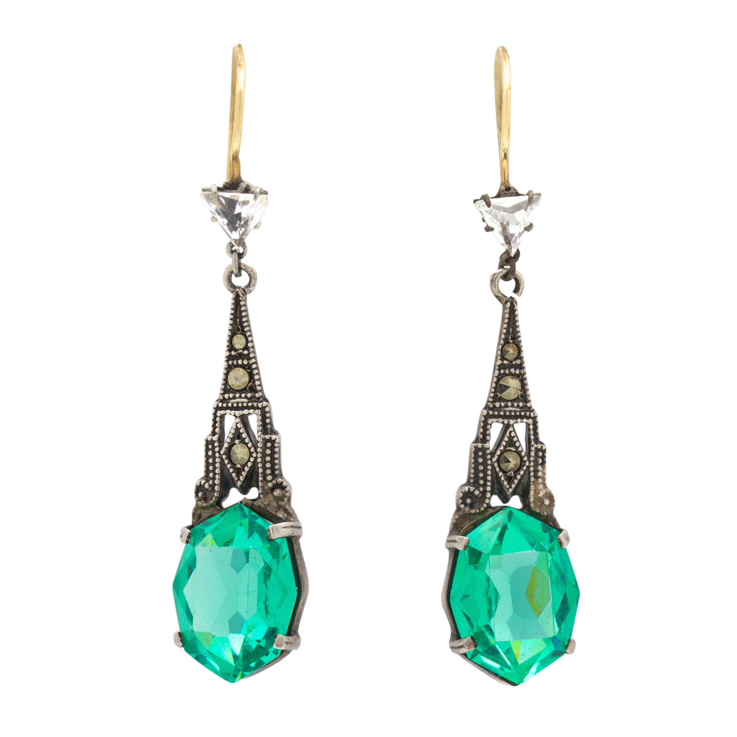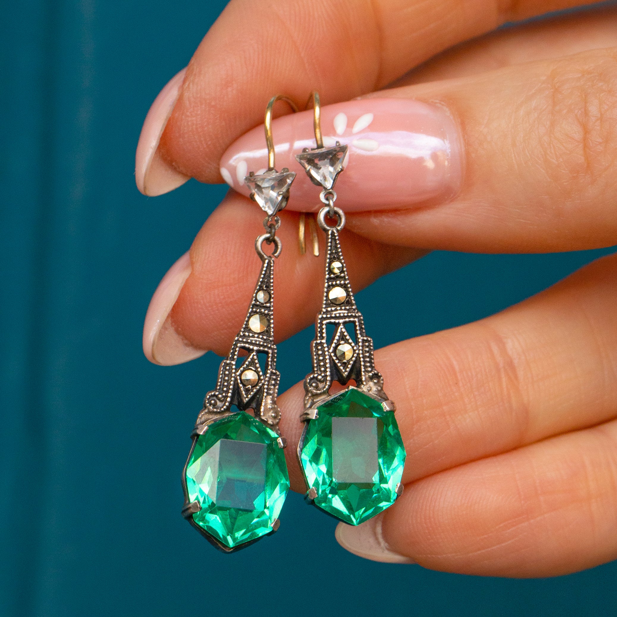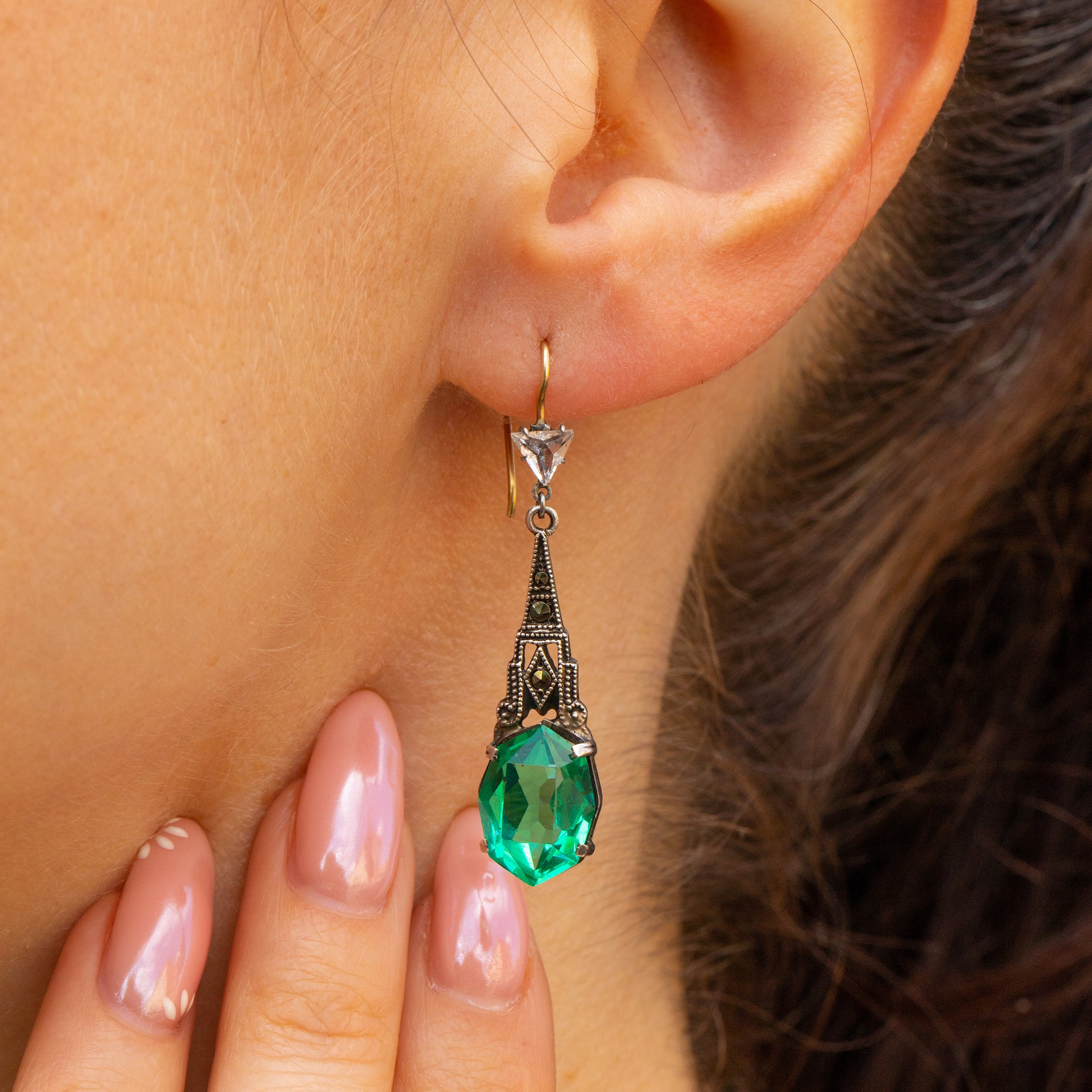EXCELLENT. These Art Deco Paste drop earrings are in excellent condition! The green Paste gems have a crisp set of facets and a luscious green hue, both are securely set and free from chips or abrasions. All the Marcasite gems are present and secure in their settings, adding a subtle sparkle. The Silver has accrued a dramatic patina making the raised details pop! Complete with slender 9ct Gold hooks, you can wear these stand-out antique Paste earrings confidently and comfortably.