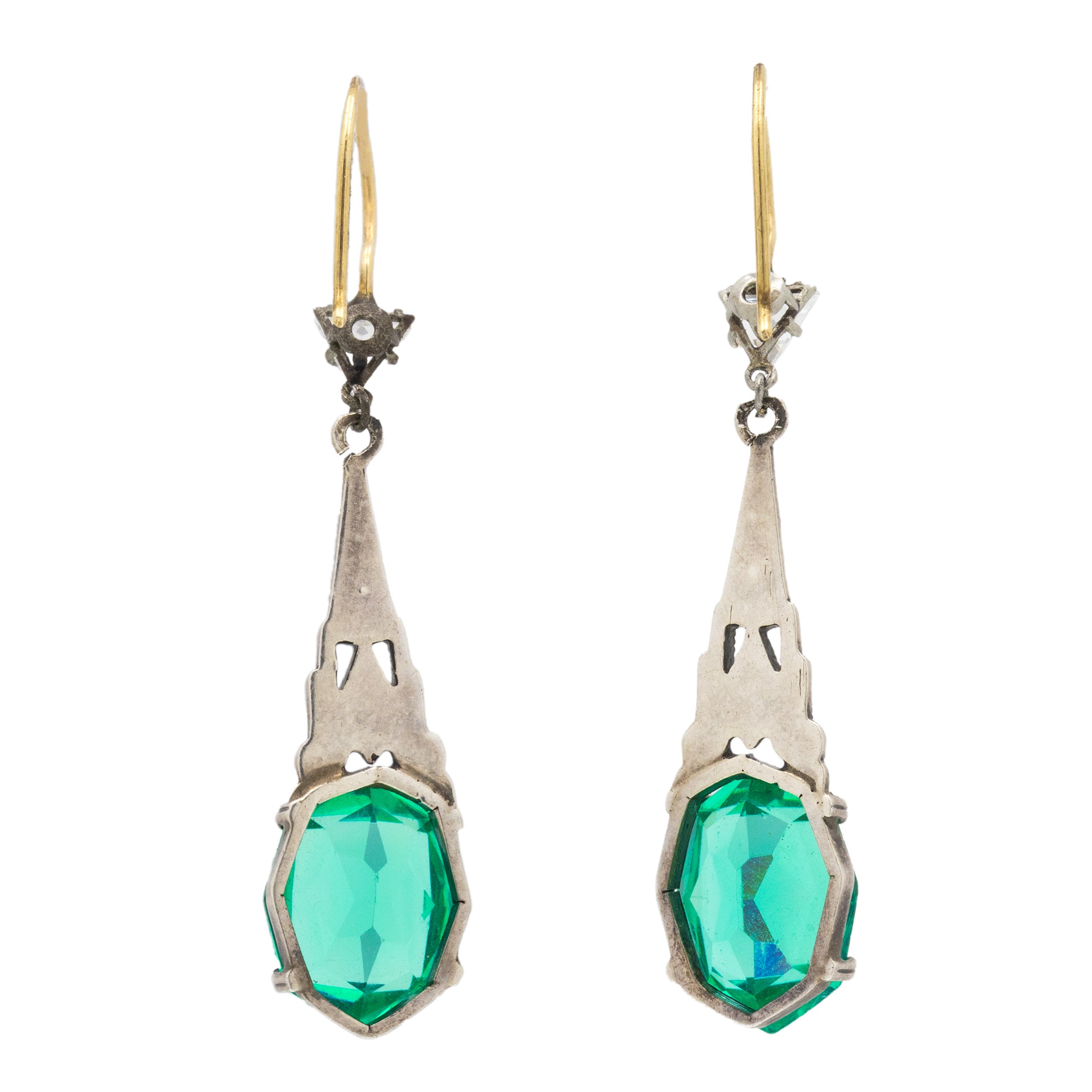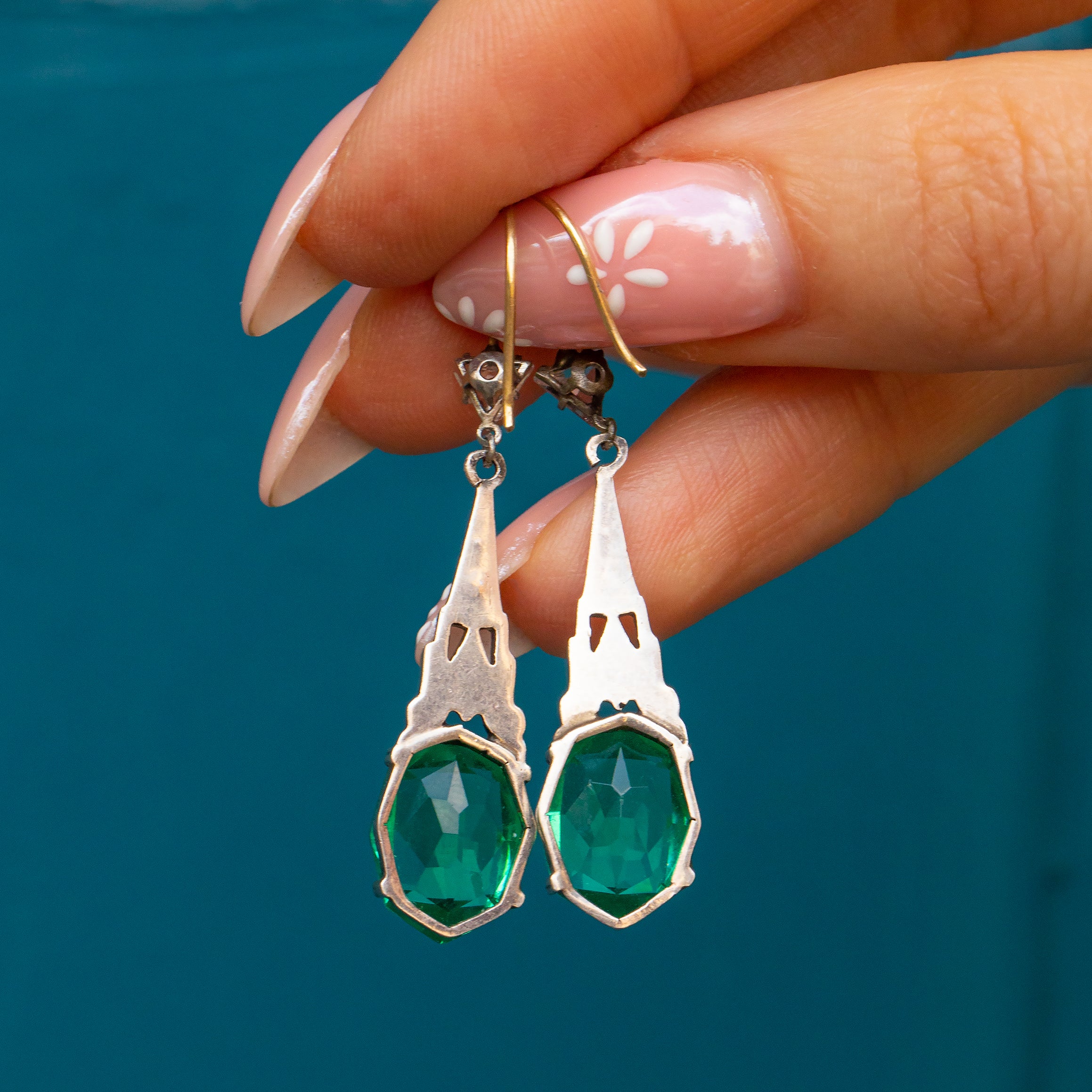These Art Deco green Paste drop earrings are the perfect way to incorporate a pop of colour into your collection! These pretties have been crafted from Sterling Silver with 9ct Gold hooks, giving them a lovely bi-colour effect.