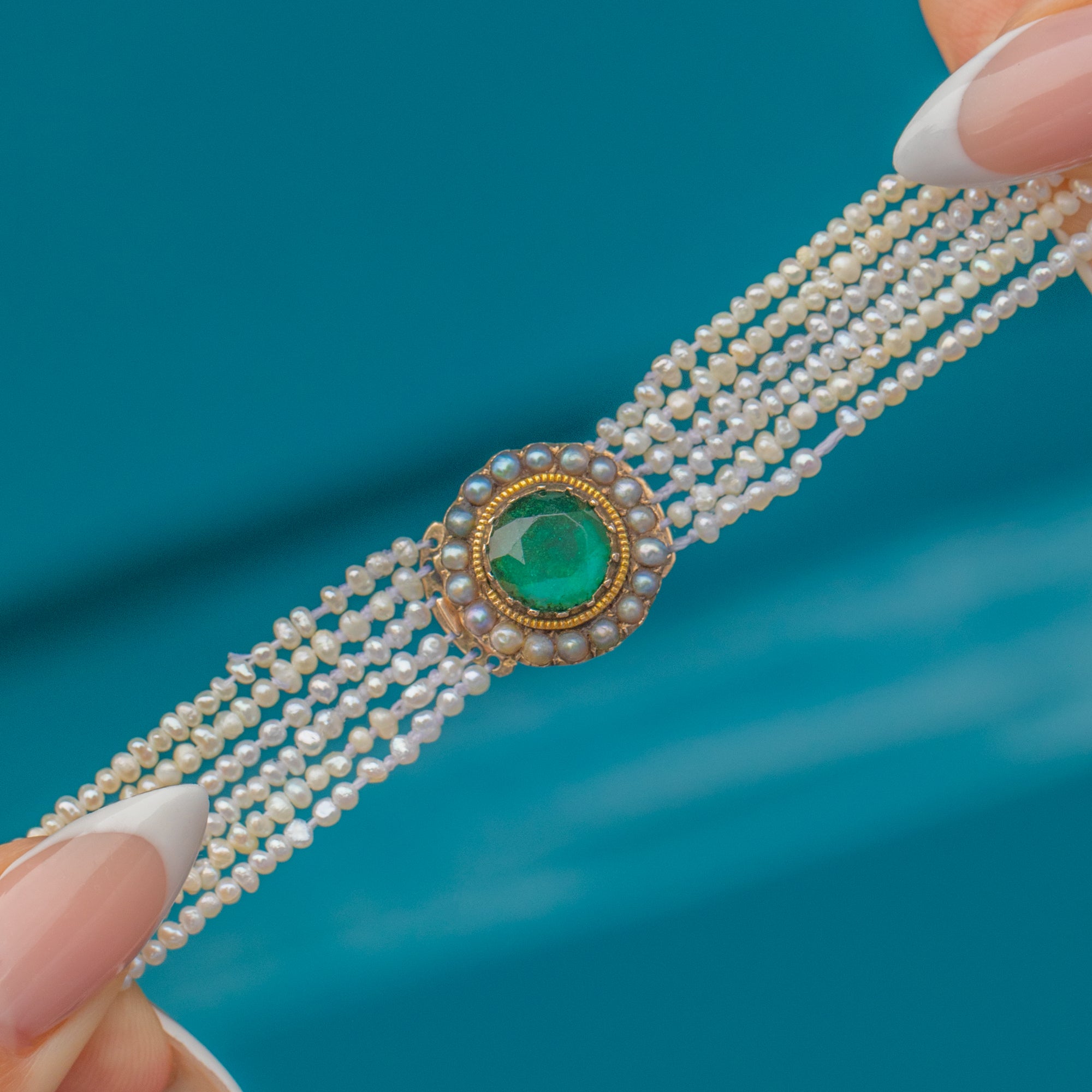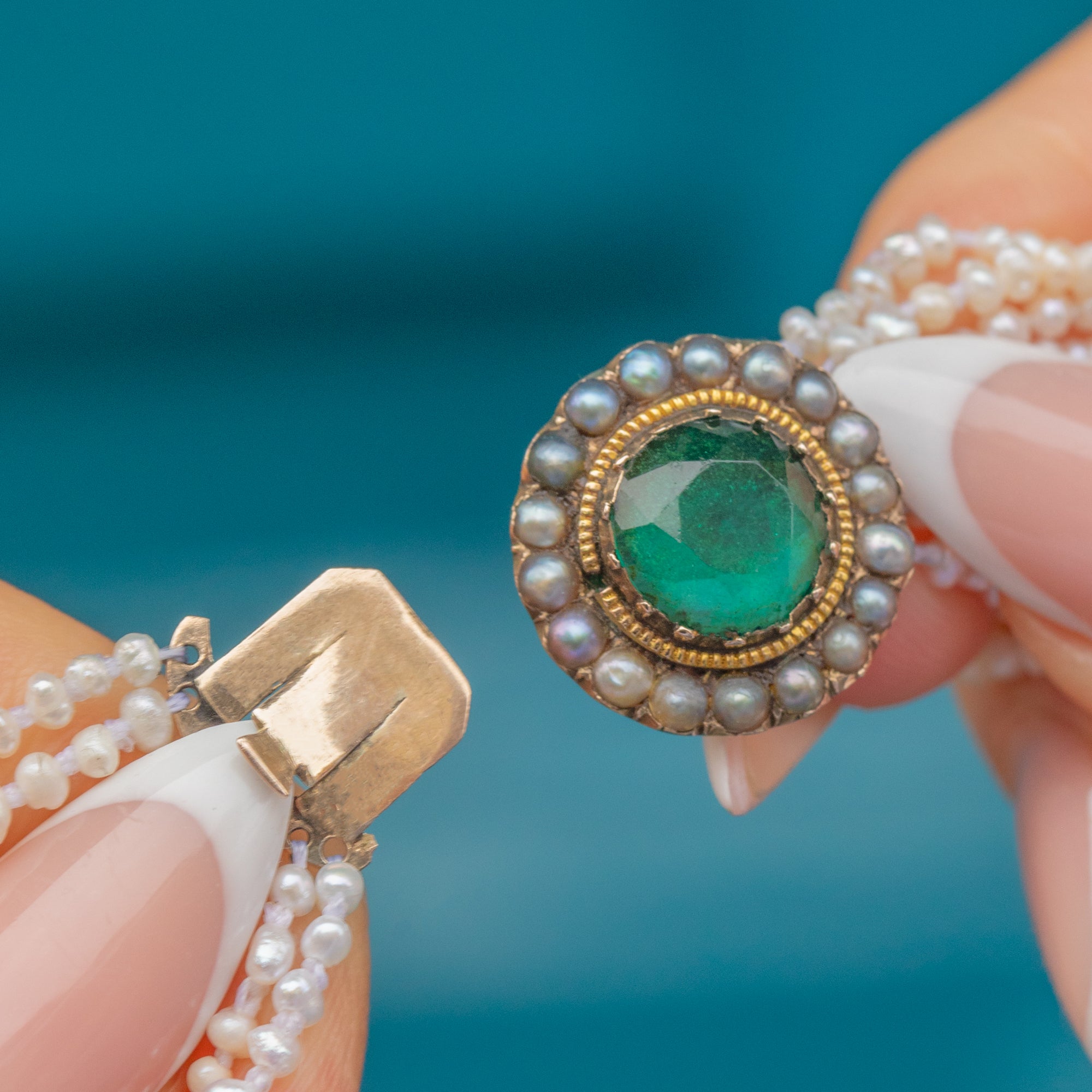 EXCELLENT: Pearls are well-matched with soft lustre, and the green Paste stone is bright and secure. The clasp is strong, and all strands remain intact with no repairs.