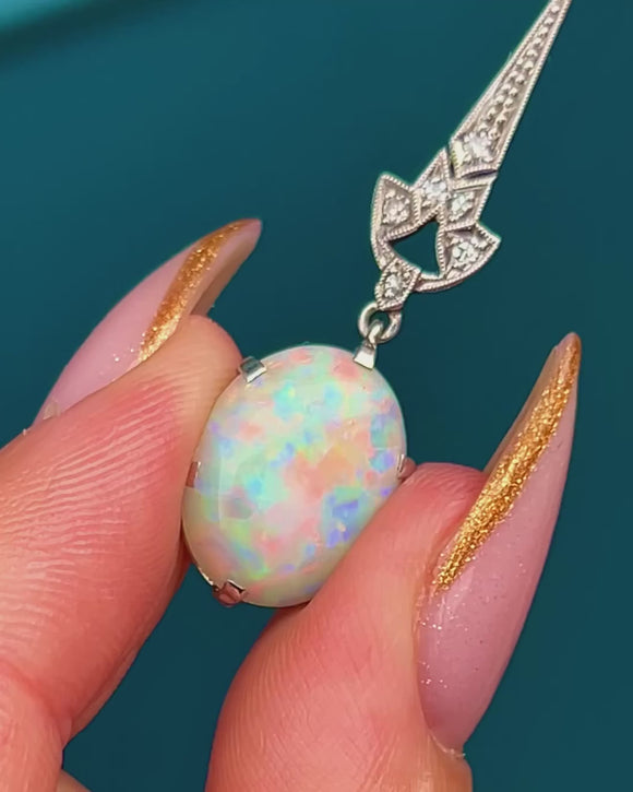 This stunning Art Deco Opal drop necklace is a perfect example of the elegance and refinement of the 1920s era. The shimmering Opal glows with soft pastel hues of blue, green and pink, beautifully complemented by sparkling antique Diamonds above.