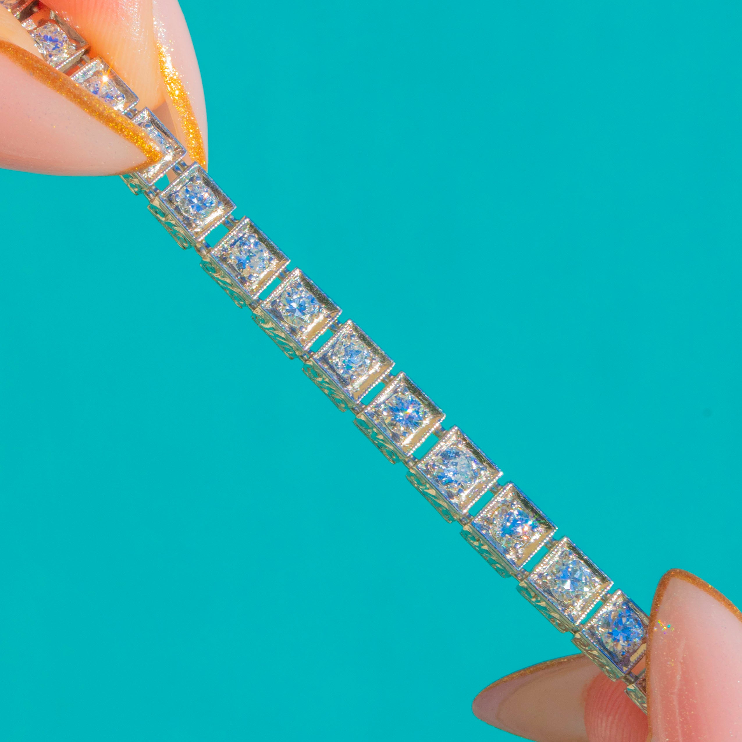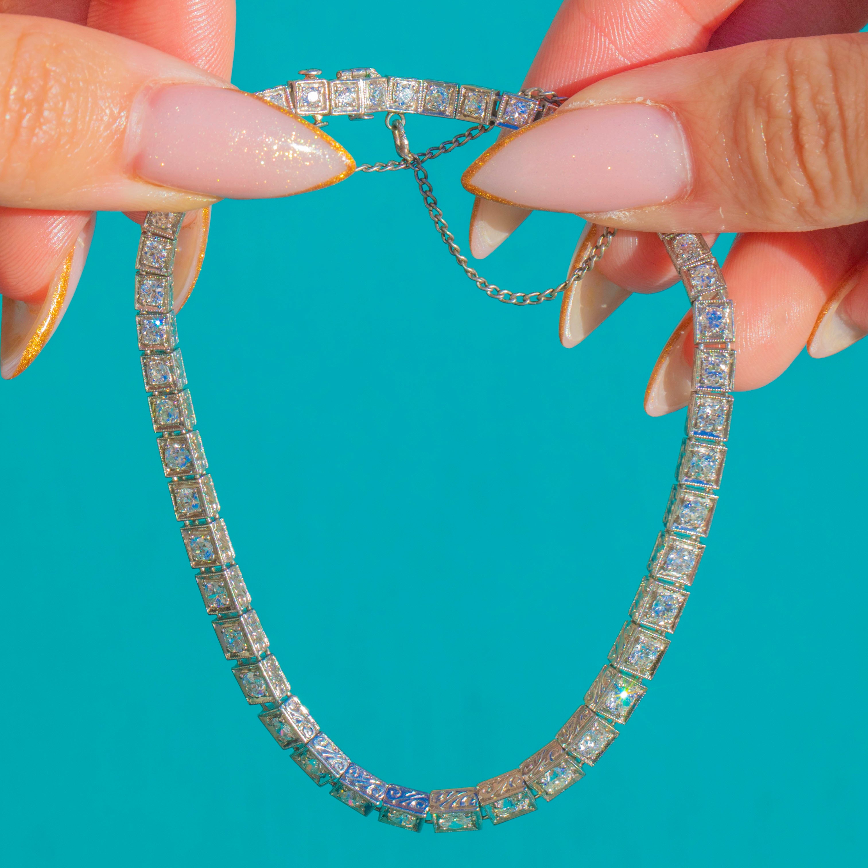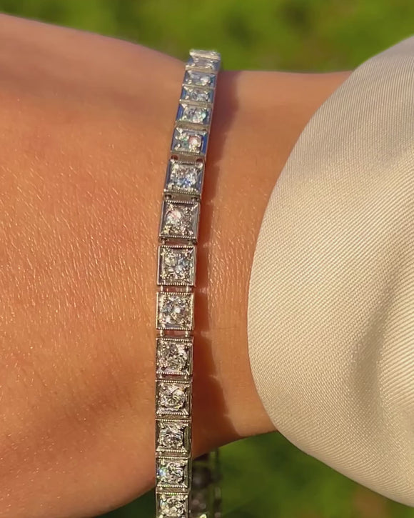 This spectacular Art Deco tennis bracelet showcases a glittering line of Old European Cut Diamonds, each one set in crisp millegrain-edged solid Platinum.