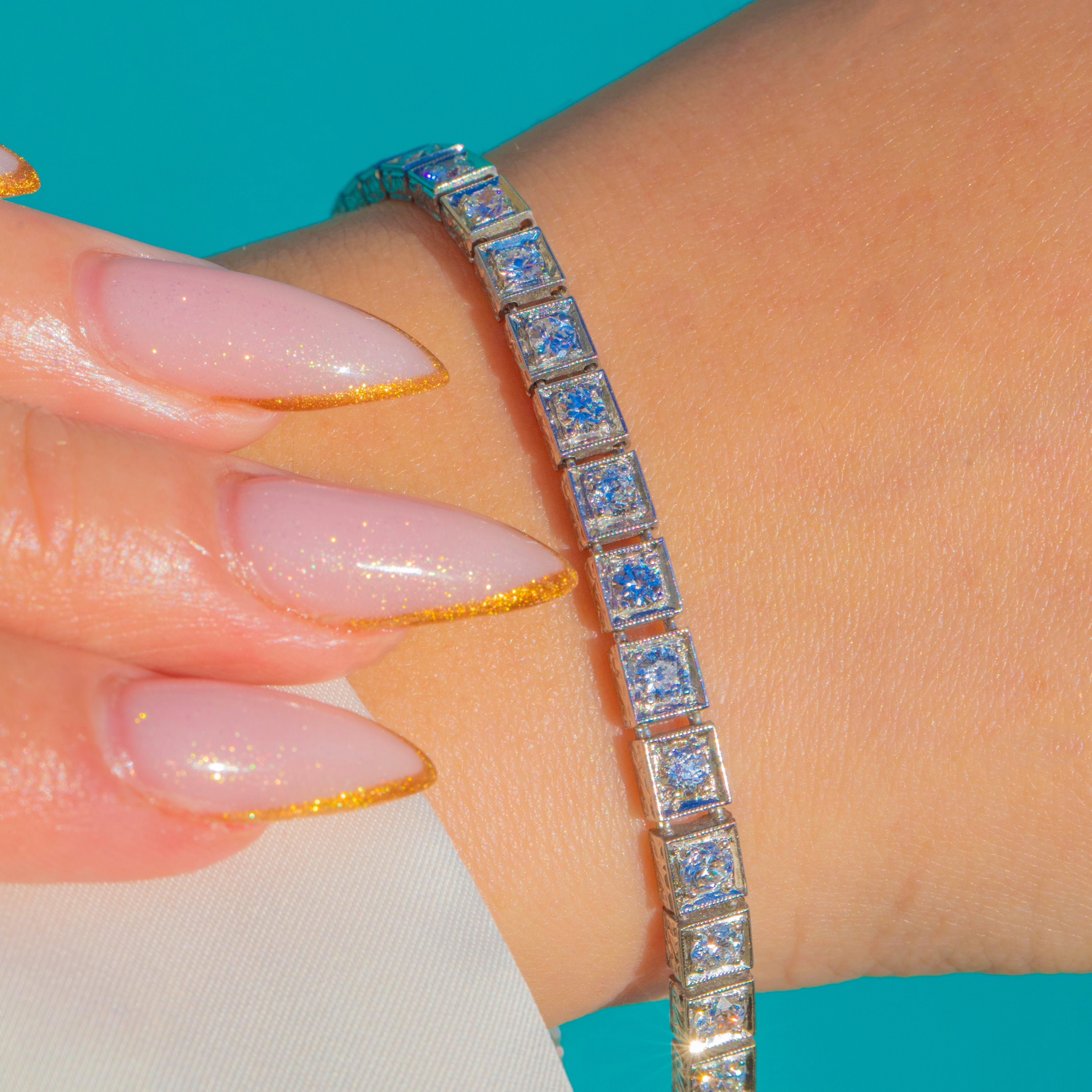 The Diamonds are bright & beautifully matched. Full of fire, giving the bracelet that iconic Deco sparkle from every angle. At 7 & 2/4" long, it drapes elegantly across the wrist with timeless sophistication. (Can be shortened if needed!)