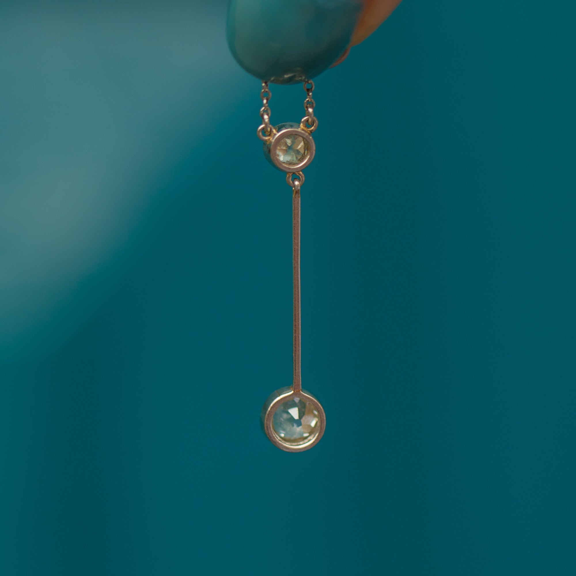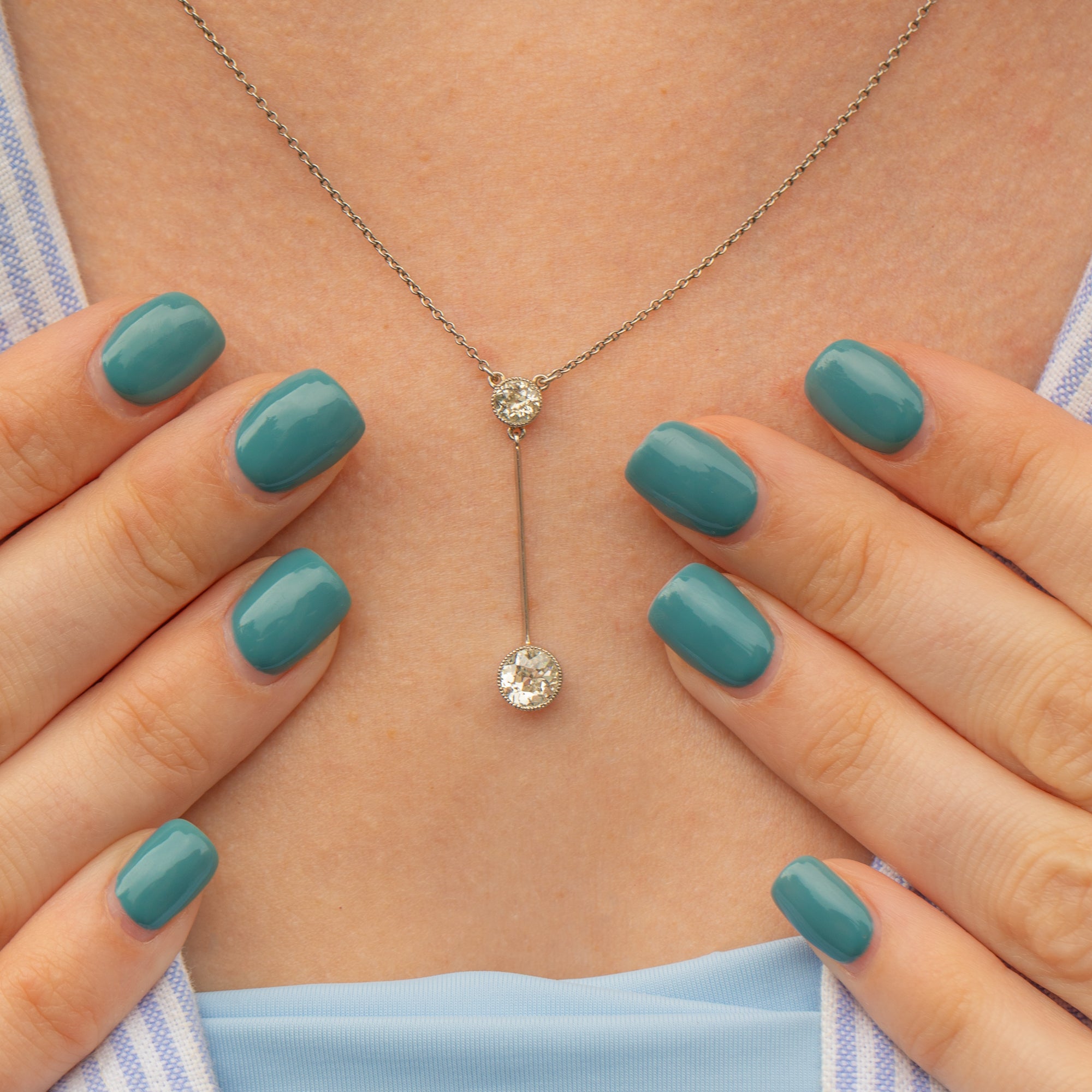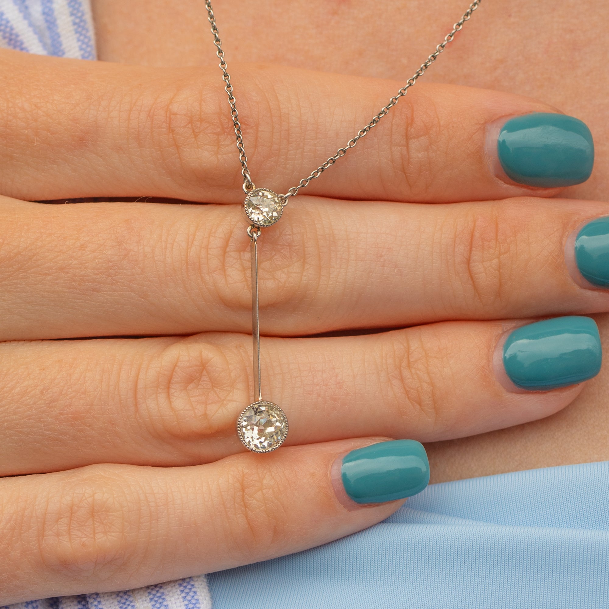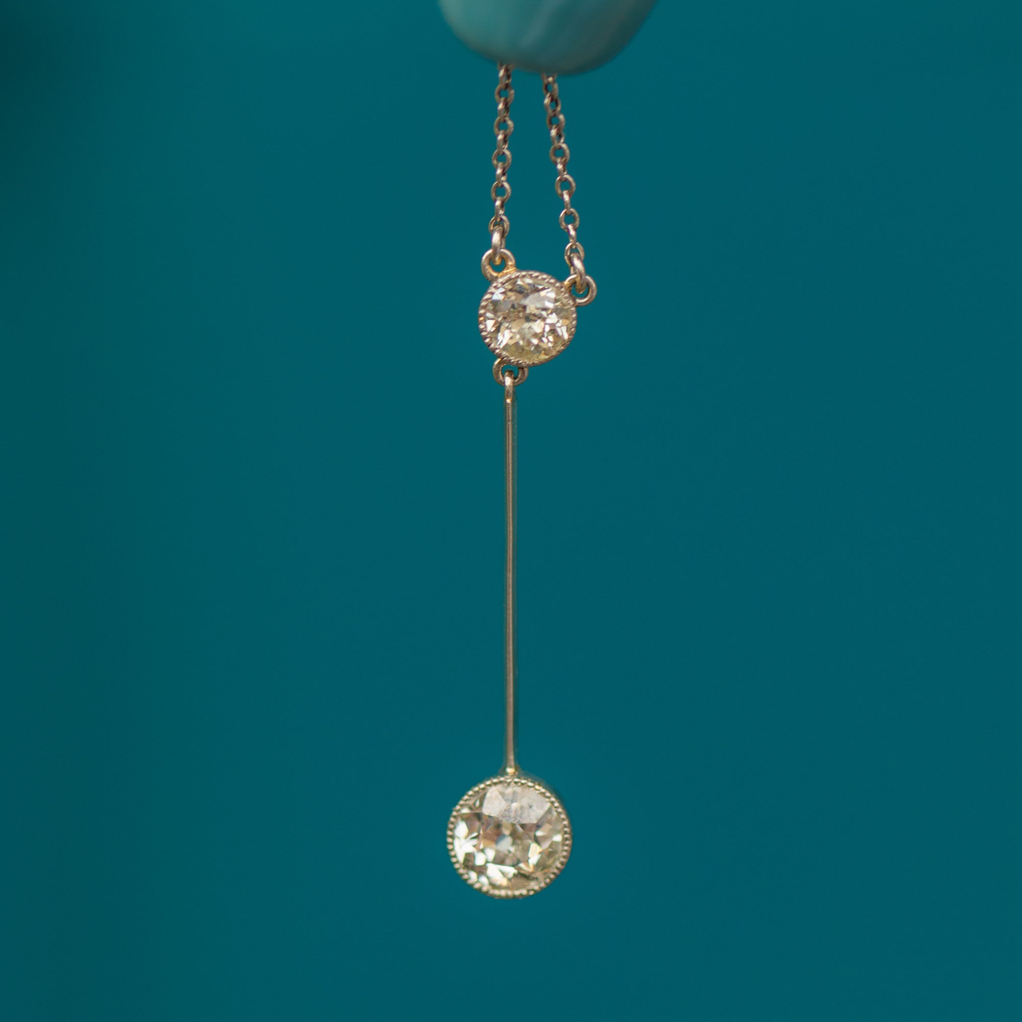 The beauty of this antique Diamond necklace is the attention to detail with the option to wear at both 16.5 or 19 inches, with a dainty 18ct Gold bolt-ring on the extension to fasten. On either end of her knife edge drop lie two sensational and rare Old European-cut Diamonds with a combined carat weight of 0.80ct, encased in a delicate millgrain border. This necklace provides a touch of glisten that will twinkle in the light as she rests across your décolletage!