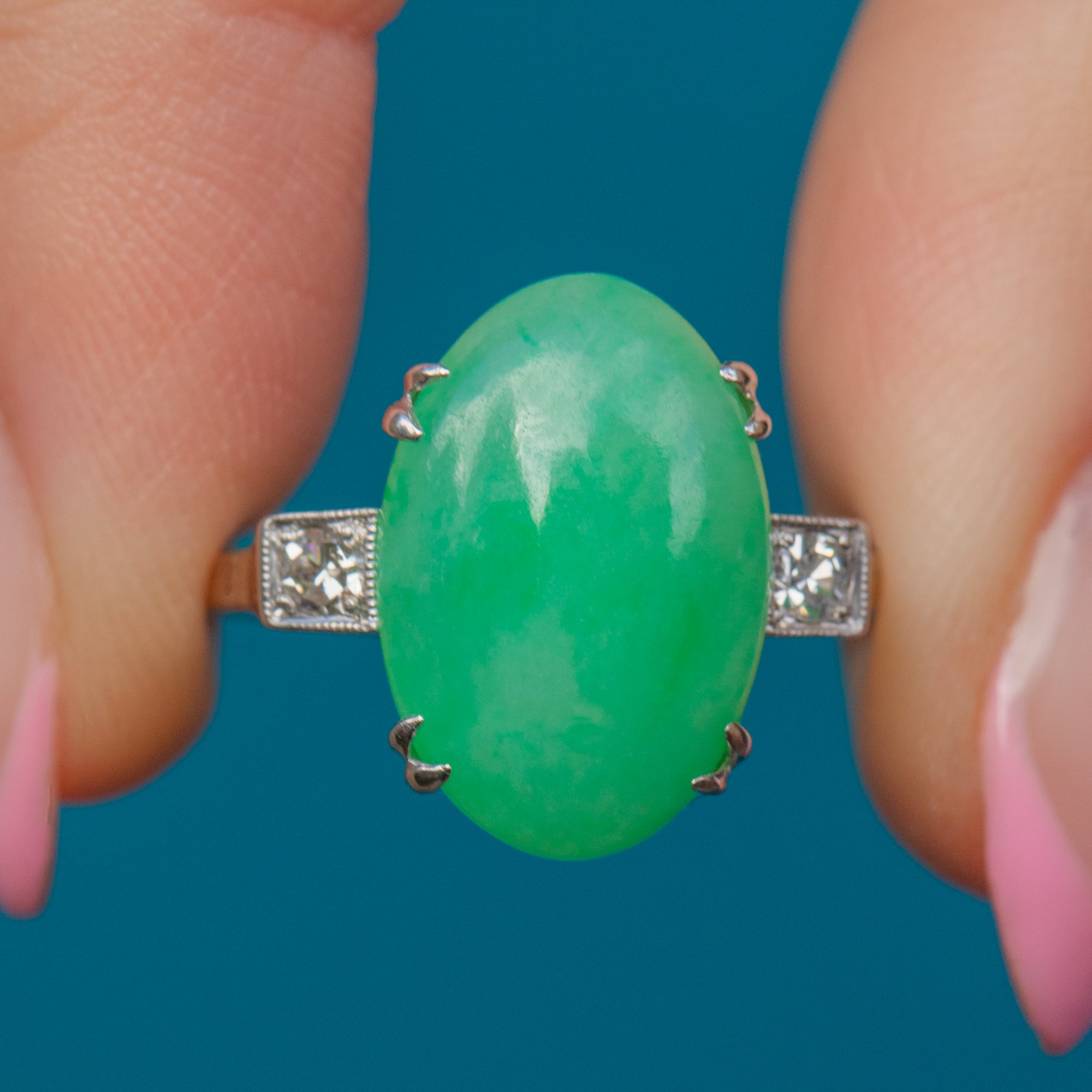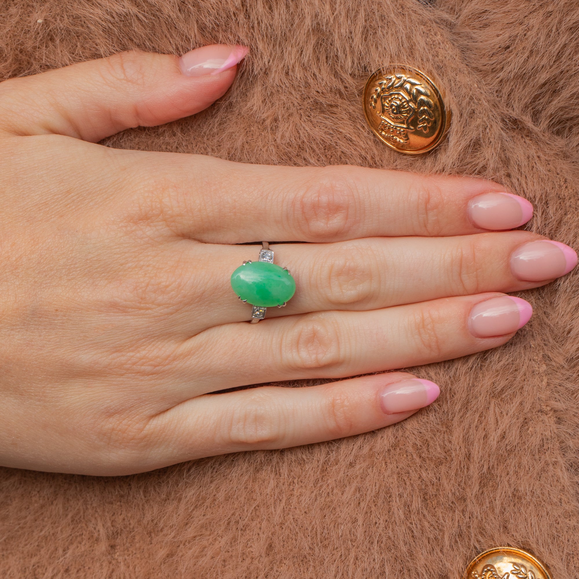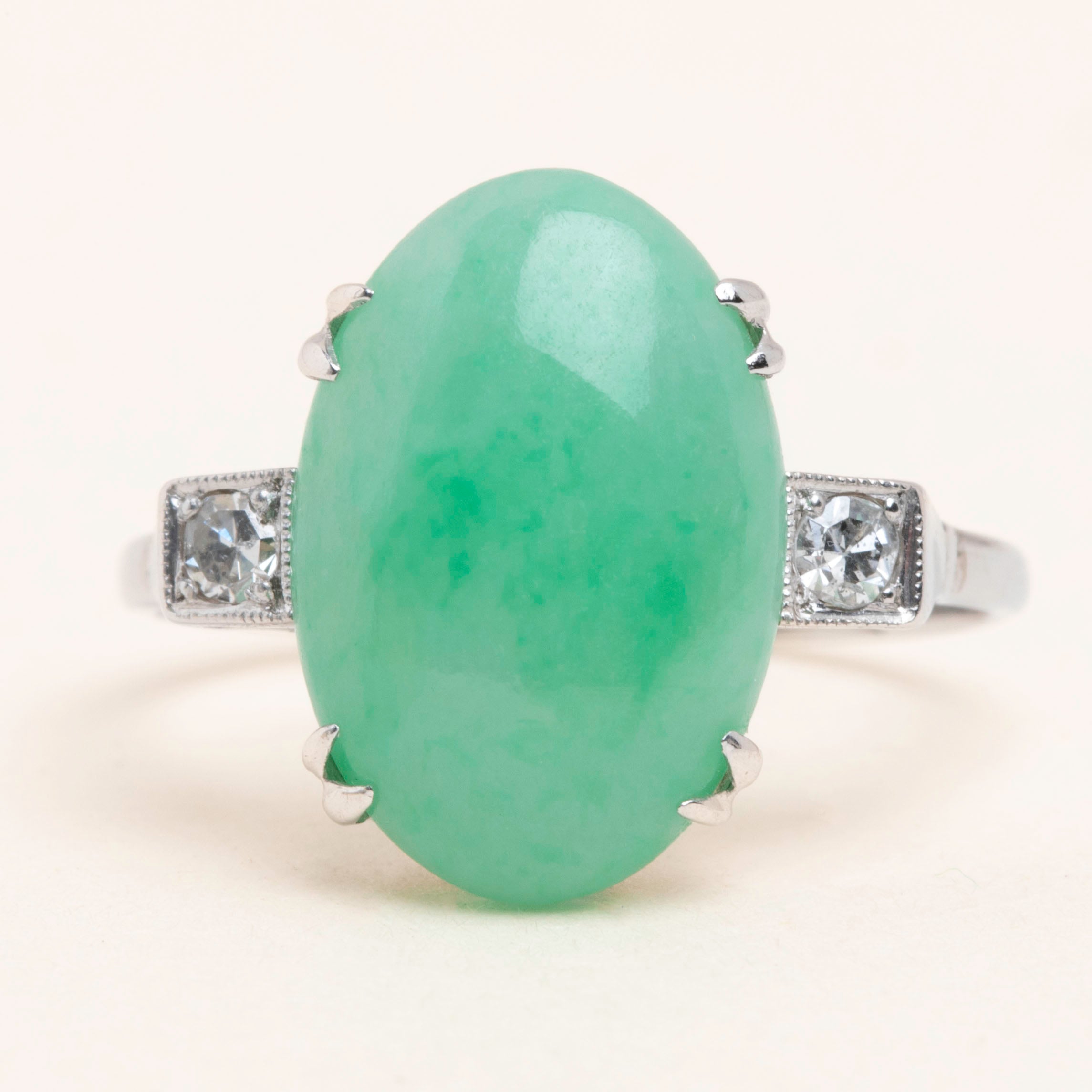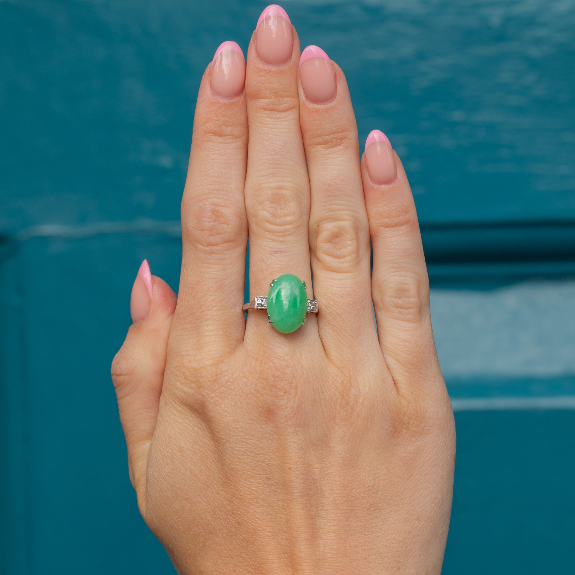 Soak up the sheer beauty of this Art Deco Platinum Jade Diamond ring! Perfect for lovers of pastels, her Jade is rich with mint green hues marbling across her smooth cabochon surface, flanked between two Diamond encrusted shoulders for the ultimate luxurious finish.