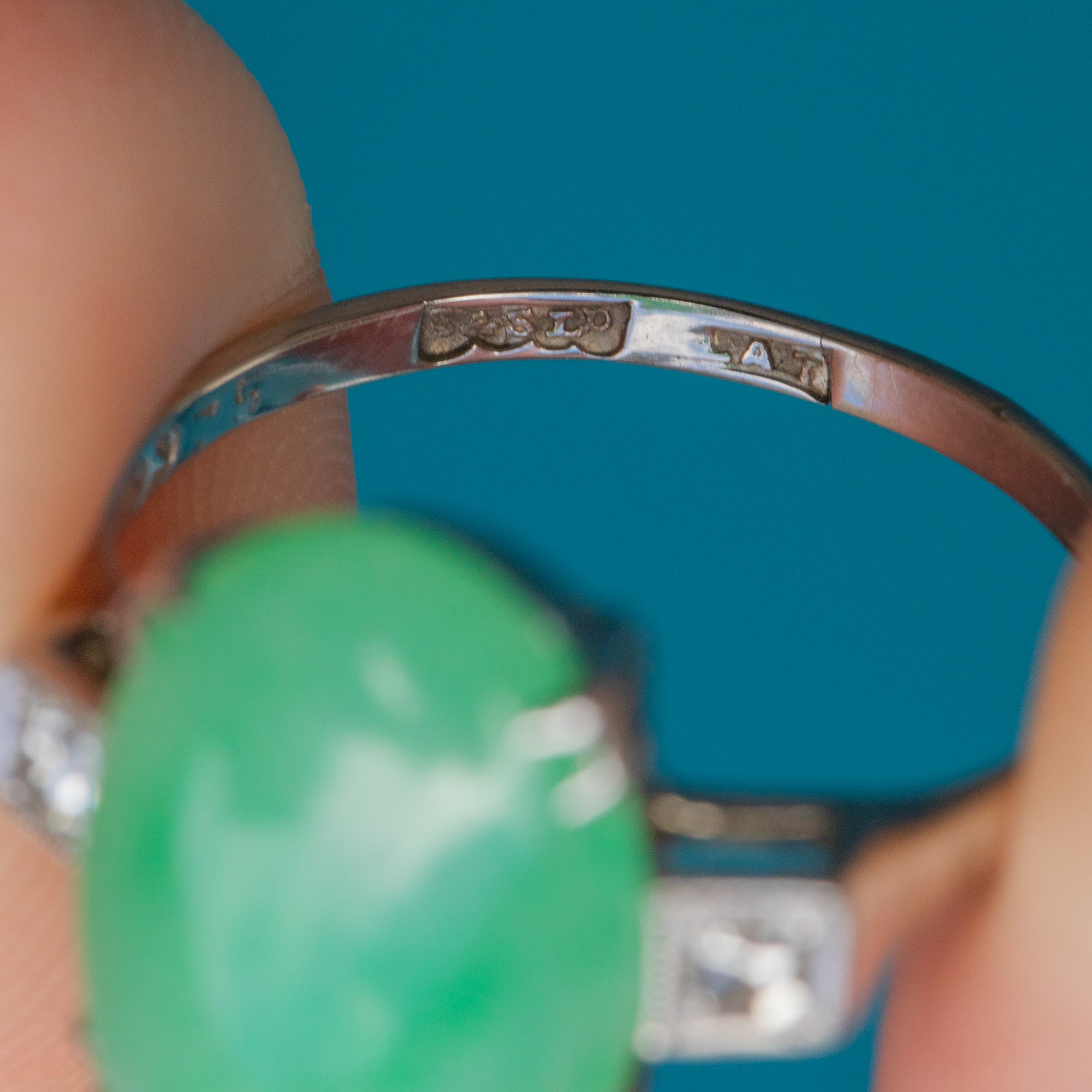 VERY GOOD. This Art Deco Platinum Jade Diamond ring is in very good condition! The Jade and two Diamonds are secure within their settings, with the Jade offering a gorgeous green colour palette, married perfectly against the two twinkling Diamonds. The Platinum is robust and has a wonderful lustre throughout, formed perfect to offer maximum comfort. There is evidence of the ring having been resized once upon a time, visible on the shoulders on both sides of the band, but the band is smooth and can be worn confidently. This Art Deco ring is truly irresistible.