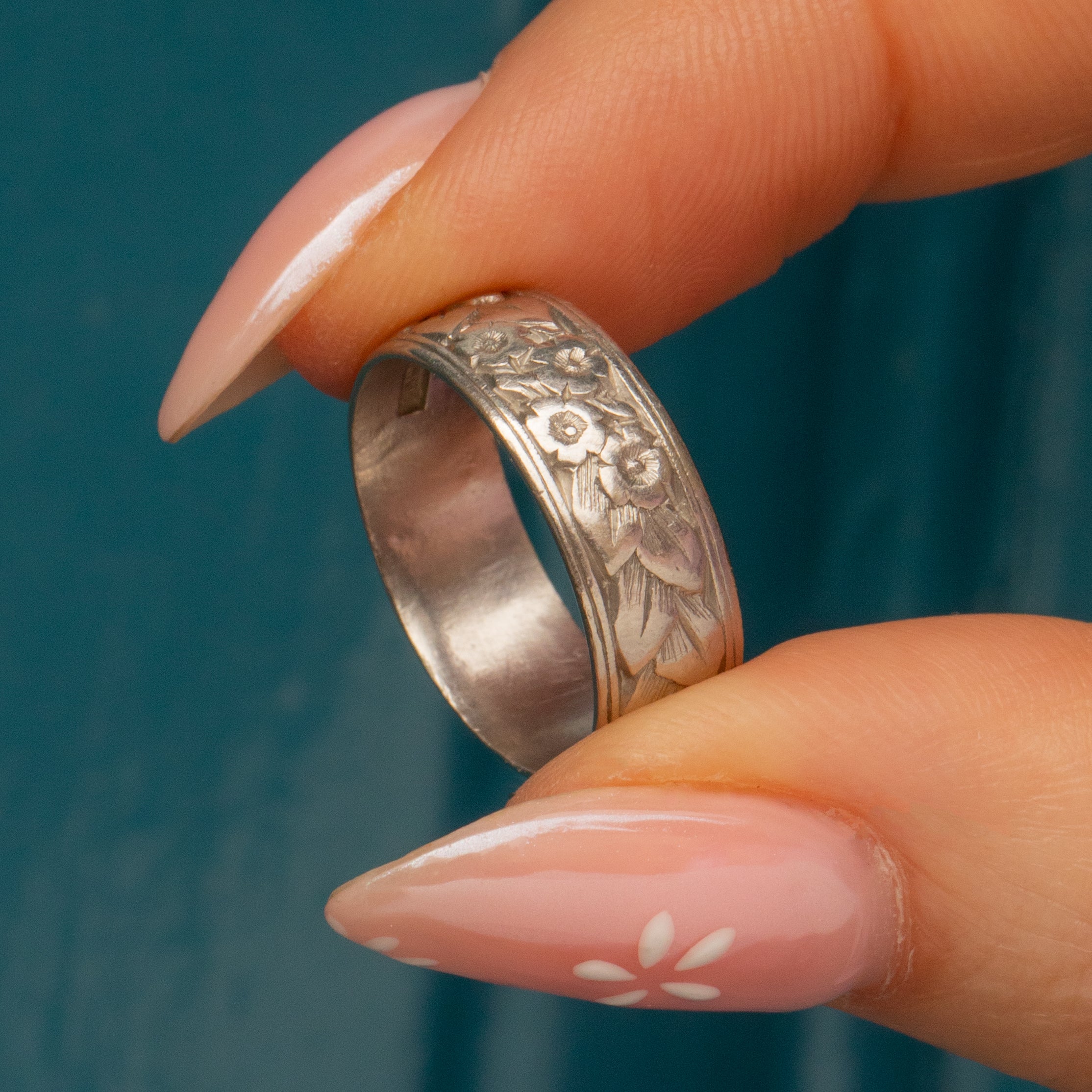 This antique Platinum orange blossom engraved ring is quite the statement piece! Measuring 6mm wide, every inch of her bright, chunky Platinum band is adorned with delicate orange blossom engravings.