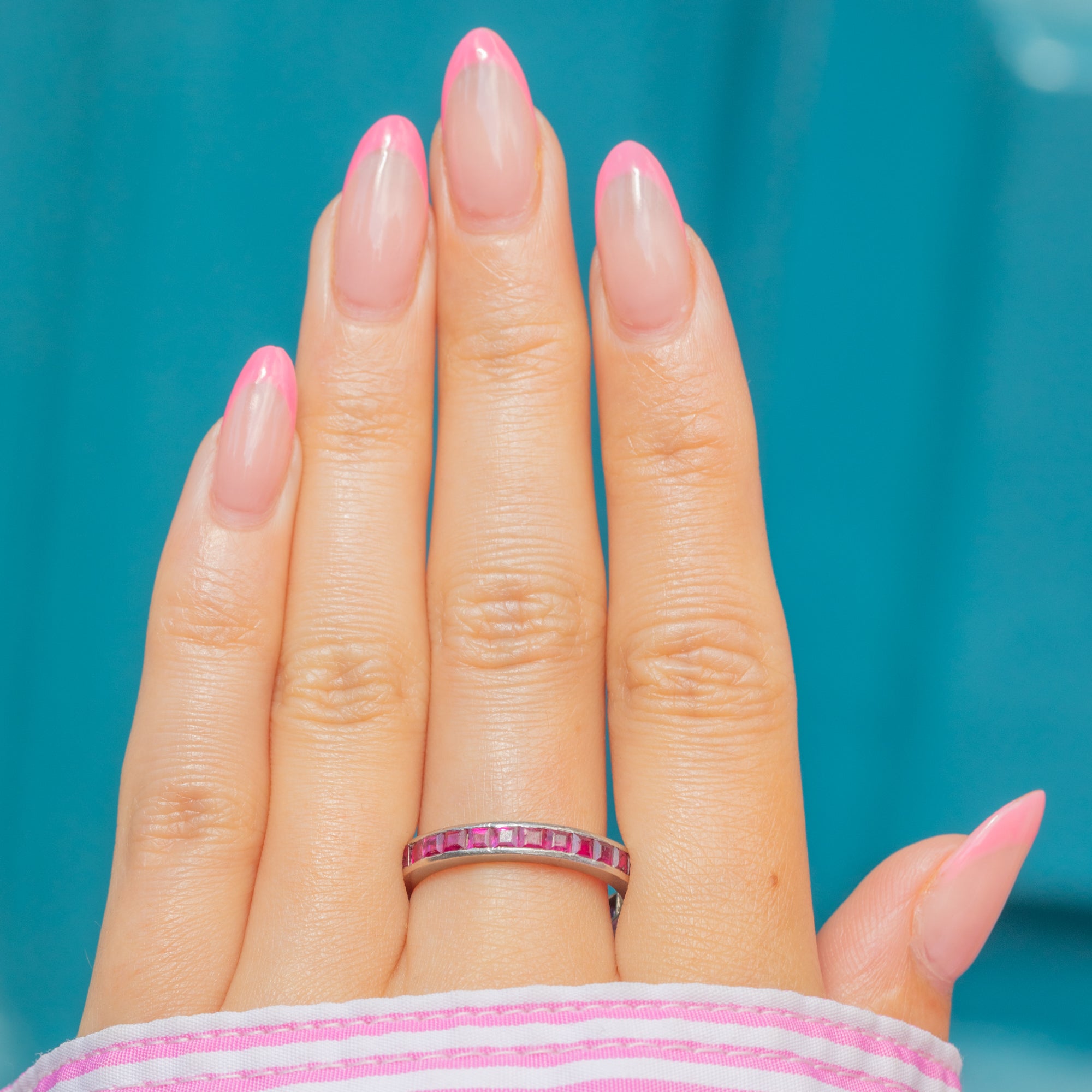 This Art Deco Platinum Ruby eternity ring is a hot pink vision! With Rubies believed to symbolise passion, protection and wealth, this eternity ring is the perfect piece to mark an important milestone in your relationship.