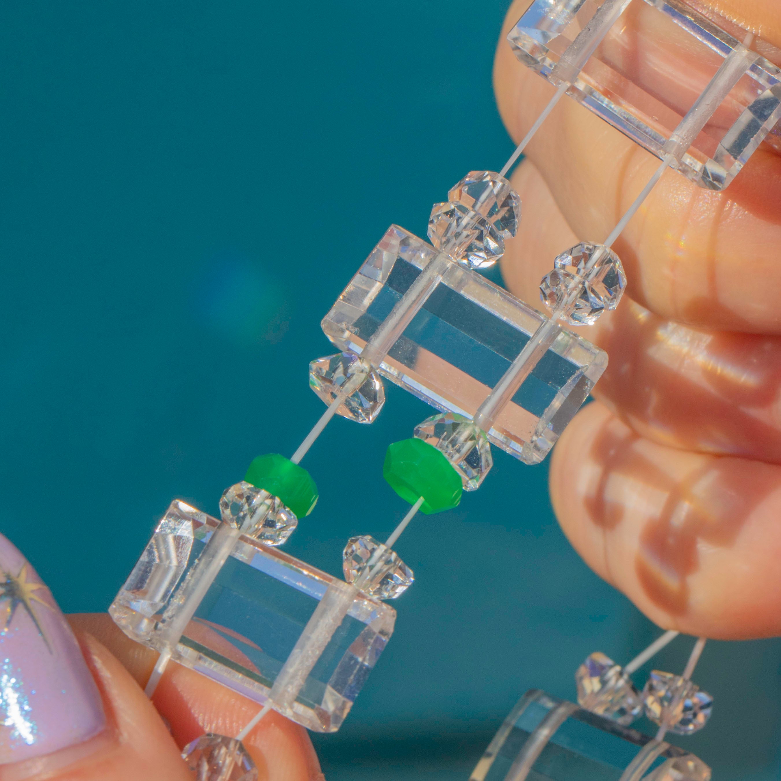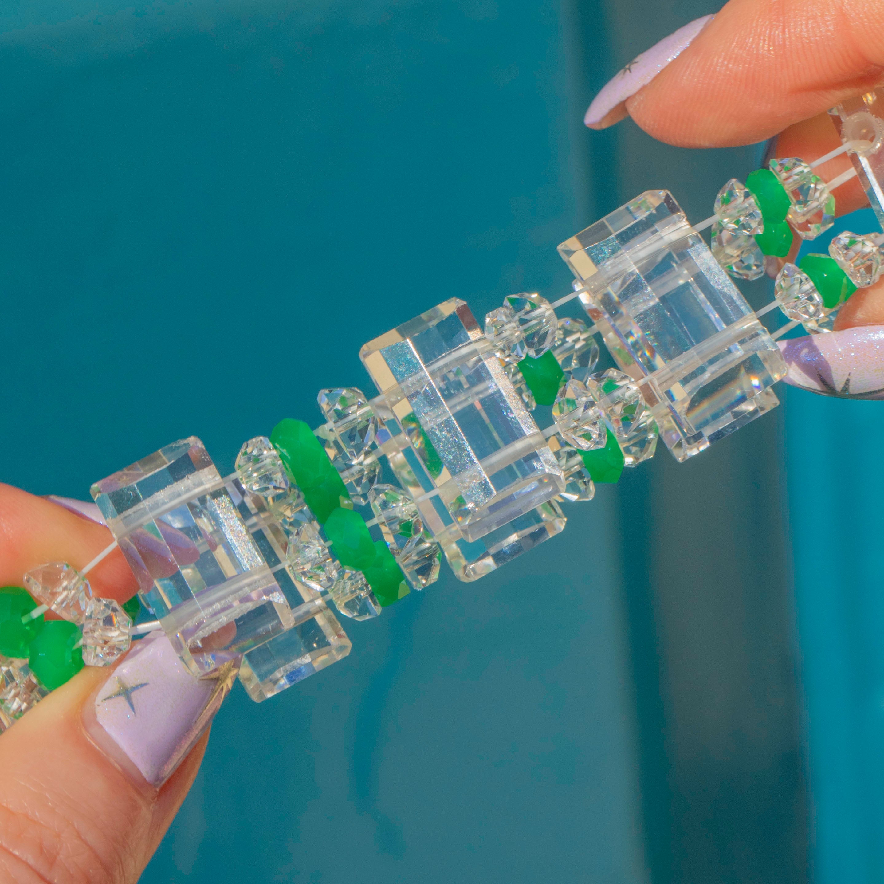 Quintessentially Art Deco in design, this bracelet boasts faceted geometric Rock Crystals that catch the light beautifully, interspersed with vibrant green Chrysoprase providing a lovely pop of colour.