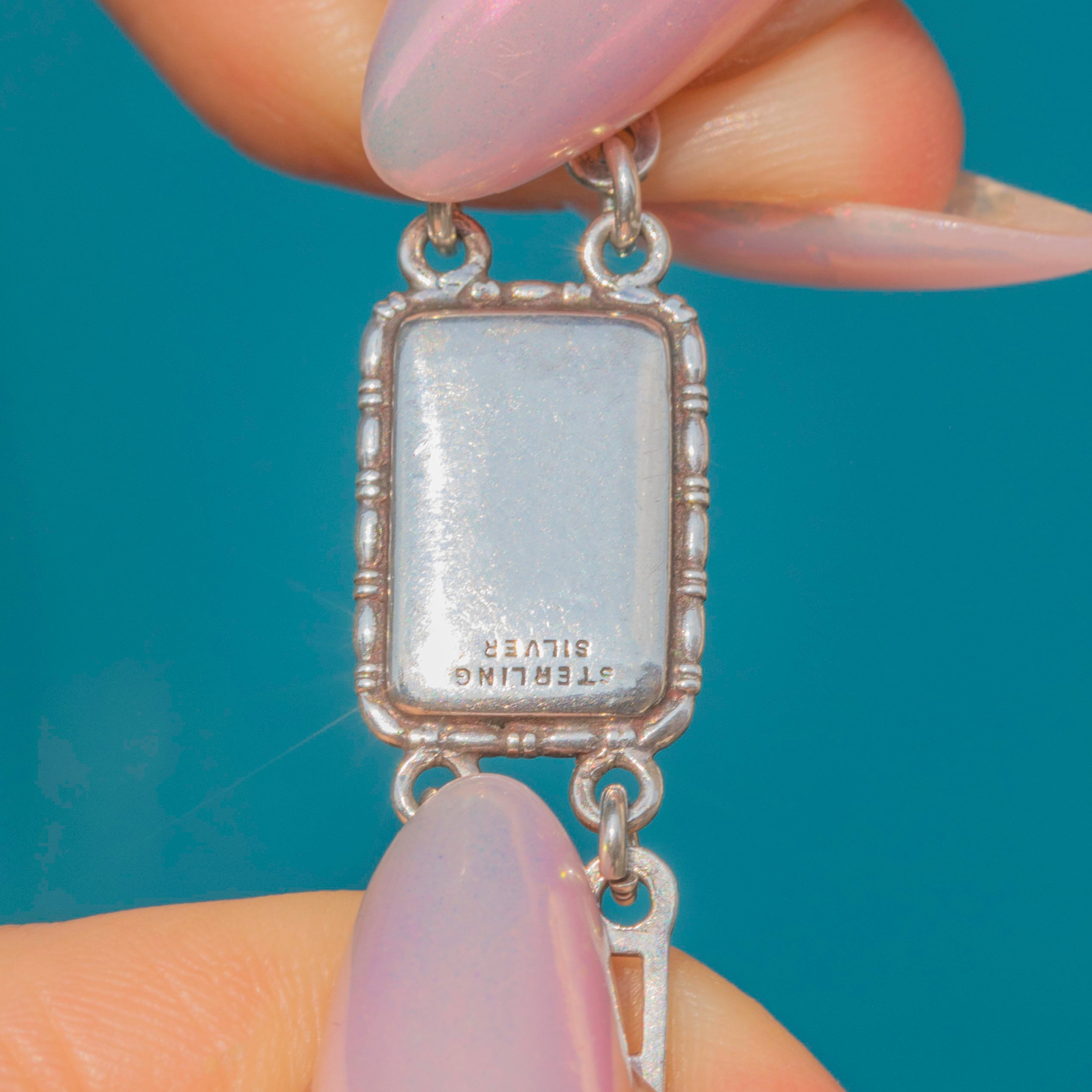 She is crafted from lustrous Sterling Silver and complete with Art Deco style square links which provide a lovely fluid movement as she adorns your wrist. This antique bracelet is a wonderful example of the character and glamour that Art Deco jewellery boasts, and is sure to liven up any outfit!