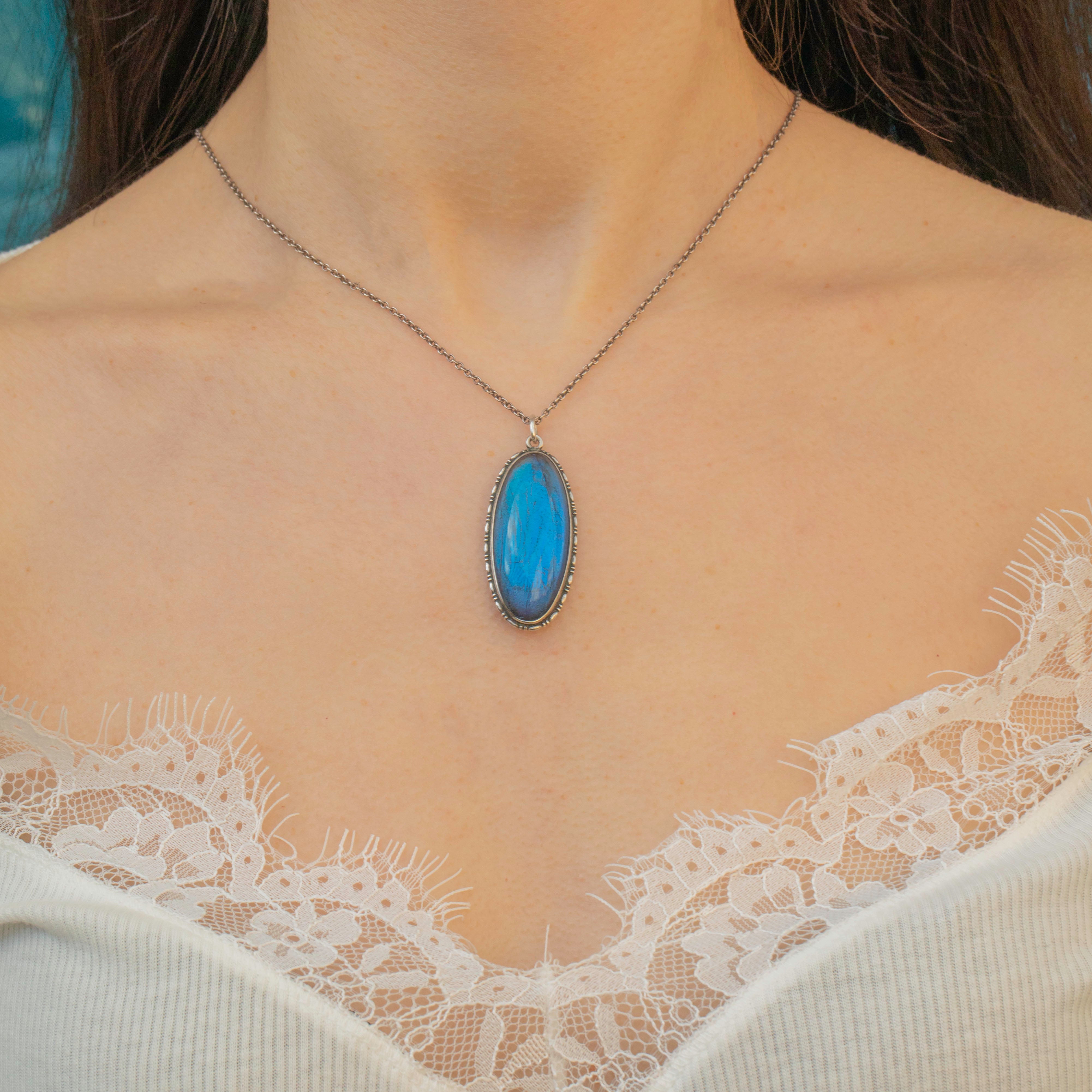 Sure to flutter straight into your jewellery collection, this butterfly wing pendant will swoon you with its iridescent blue hue!