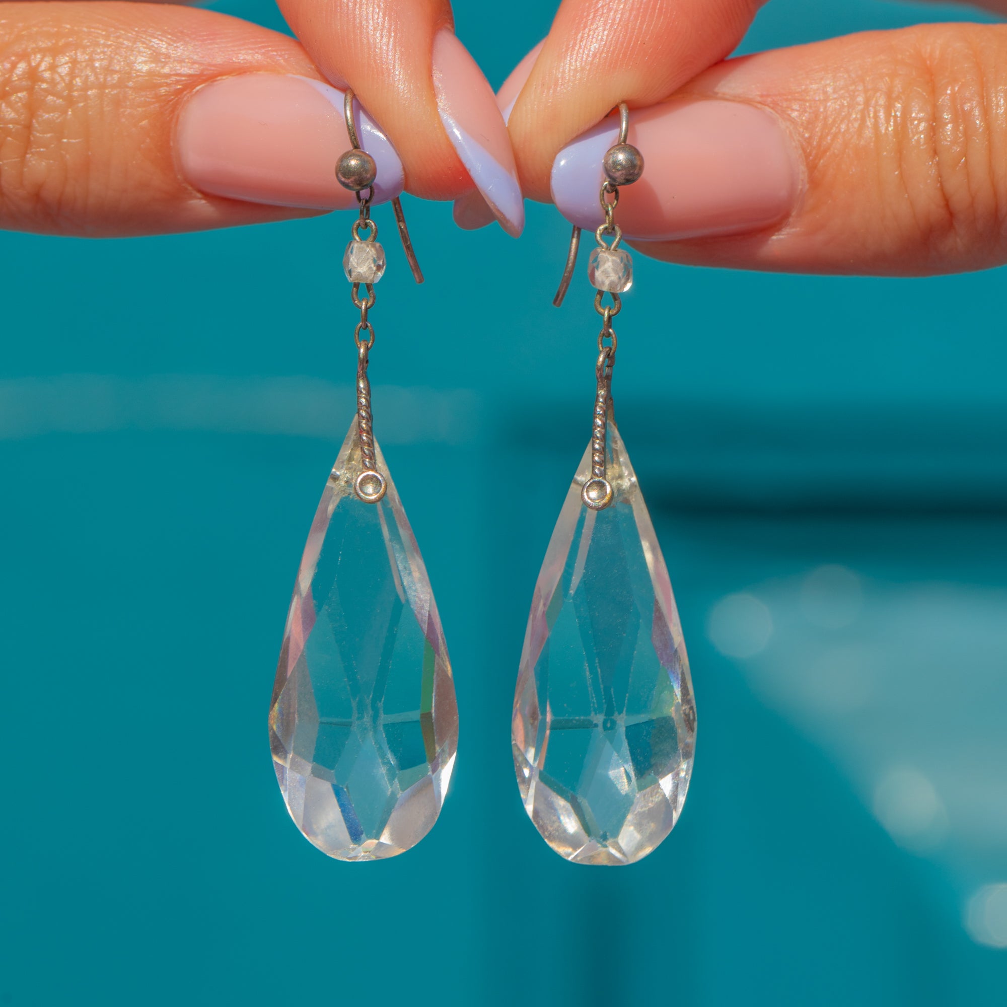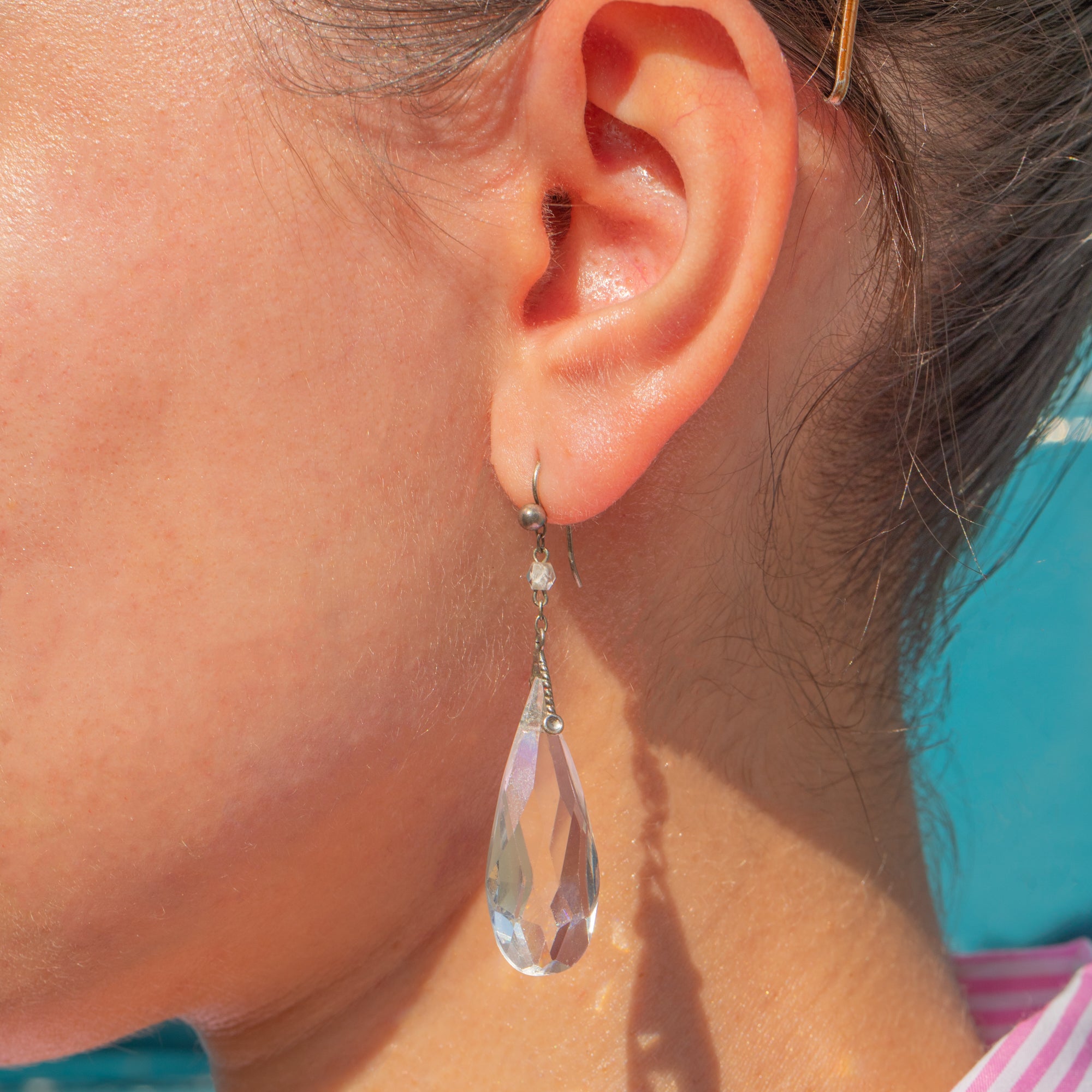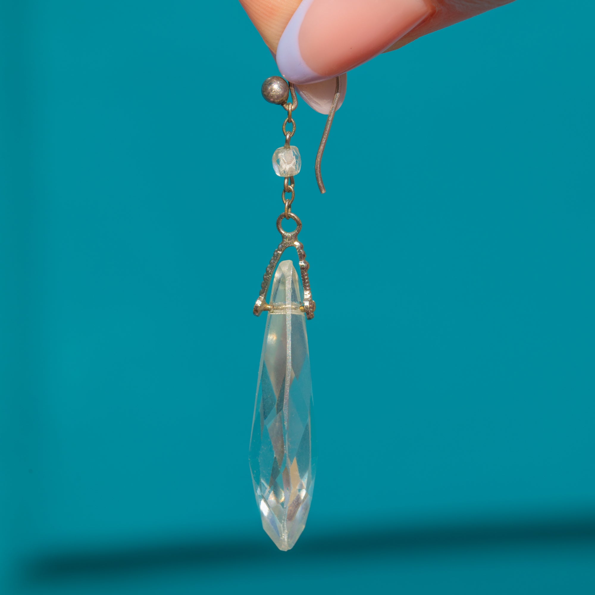 VERY GOOD-EXCELLENT: These Art Deco Silver faceted glass drop earrings are in wonderful condition. Each glass drop is faceted wonderfully, with only fleabites to the glass which are difficult to spot without a loupe. With each hook well soldered, you can wear these Art Deco earrings with confidence.