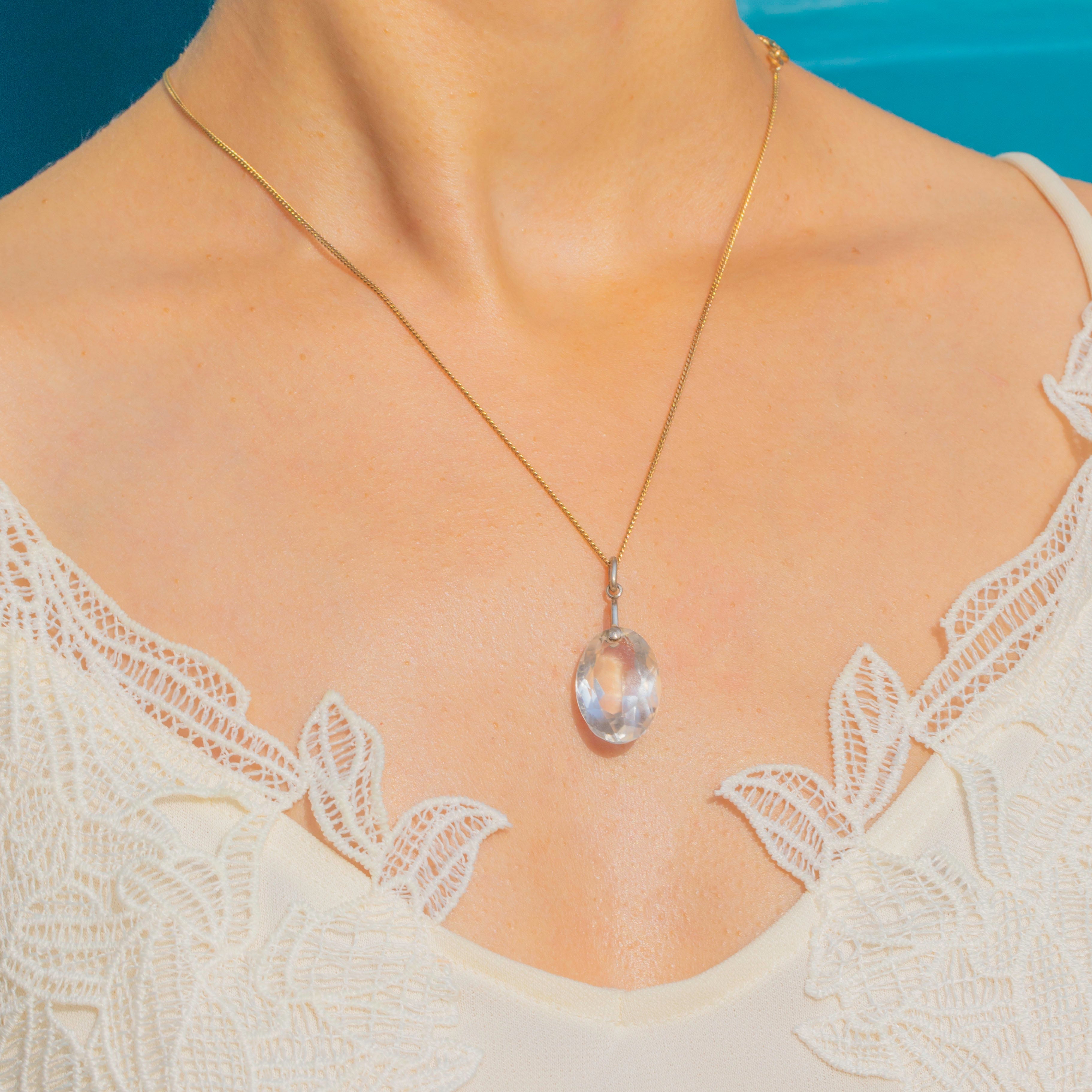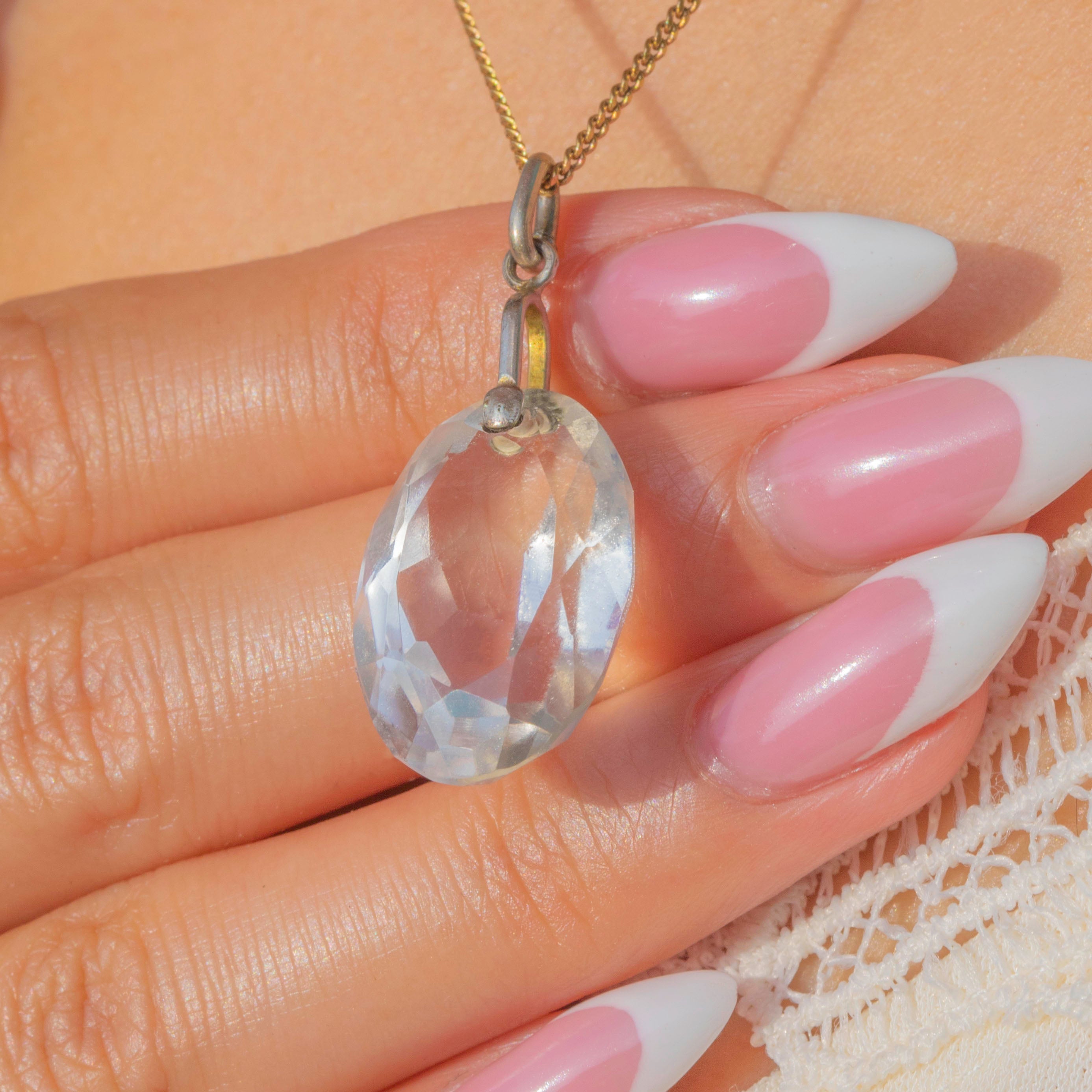 This Art Deco pendant showcases a beautifully faceted Rock Crystal, set in sleek Sterling Silver, boasting icy crisp tones.