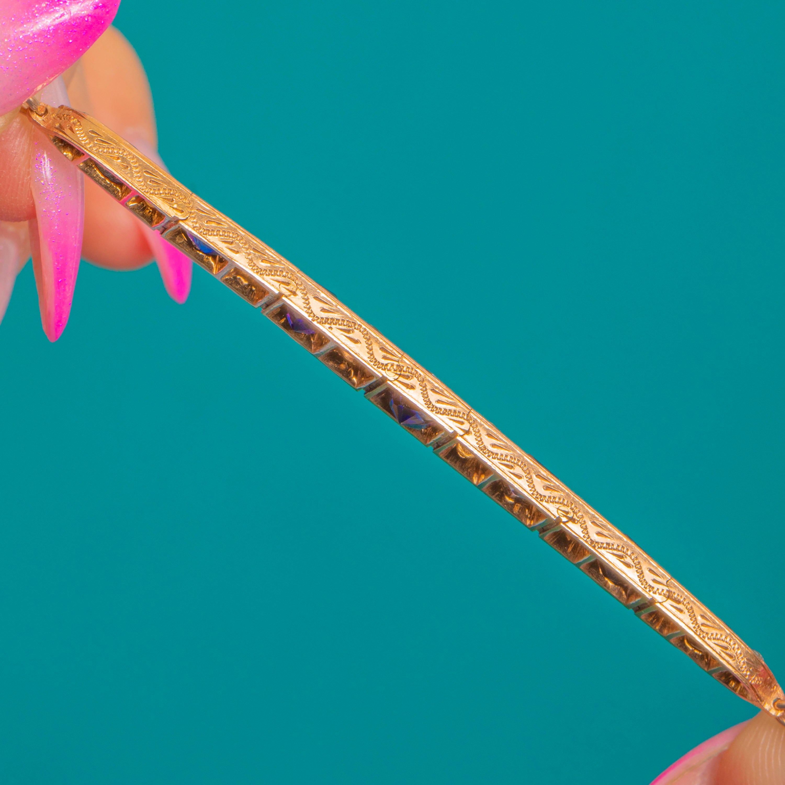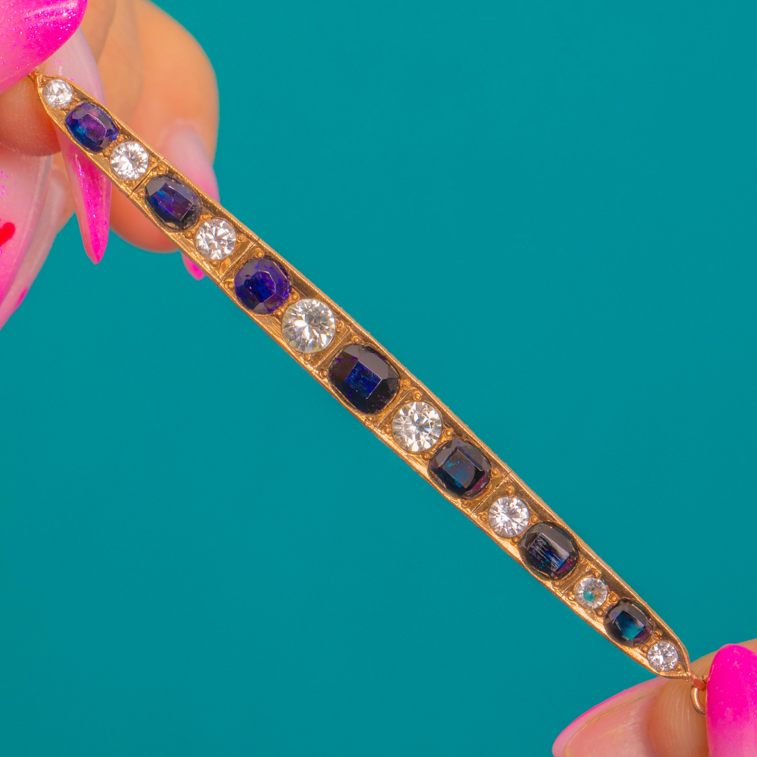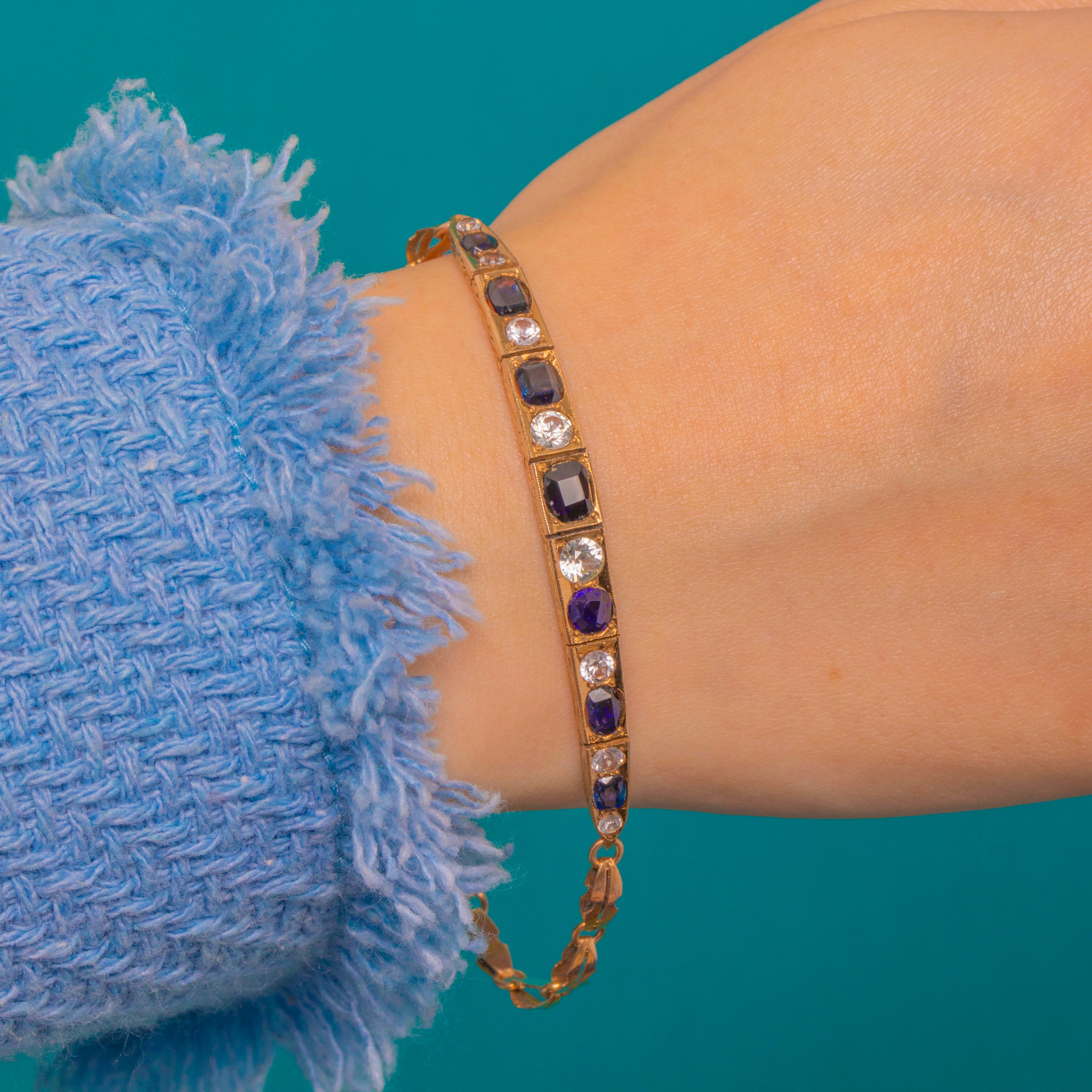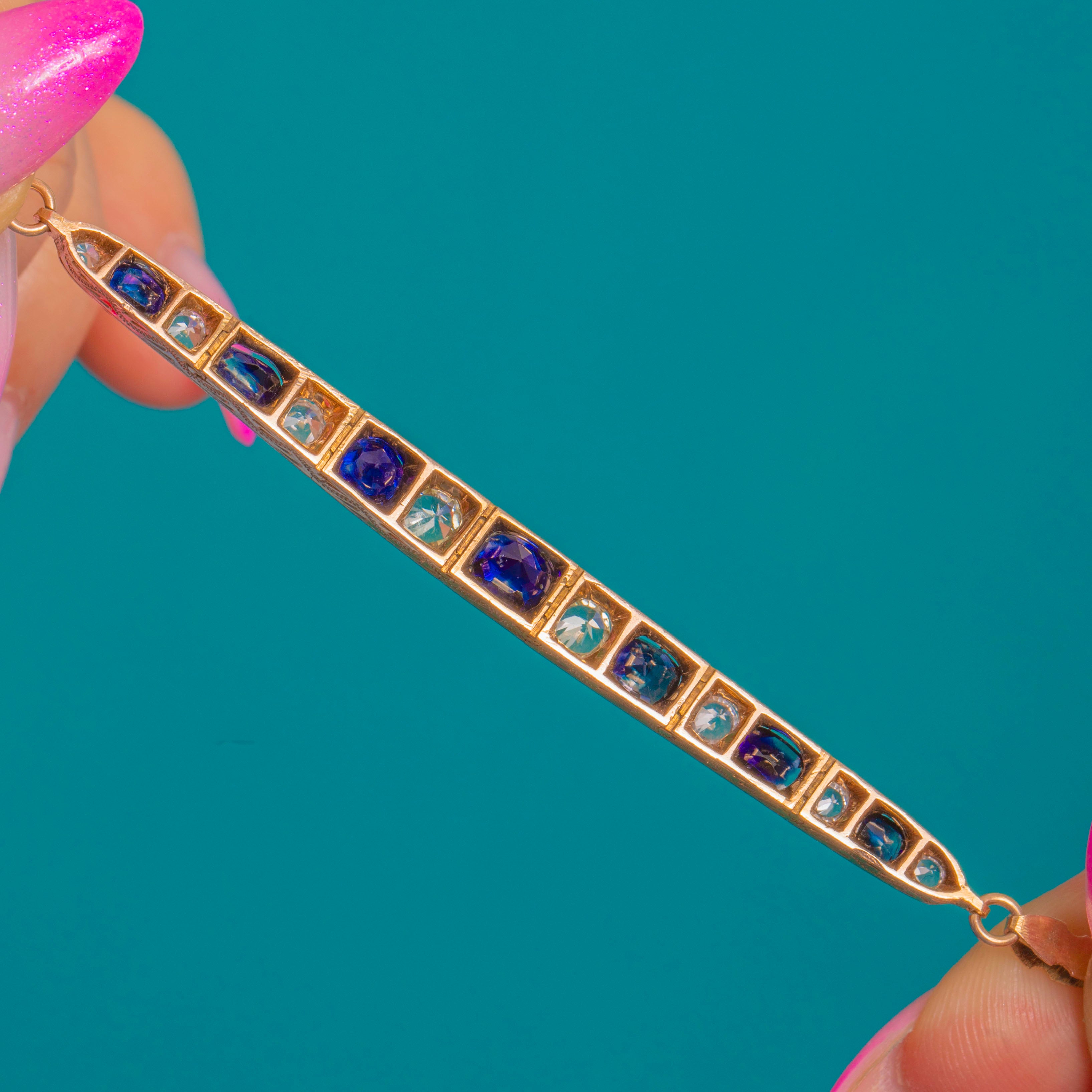 A refined Victorian bracelet in glowing 8ct Gold, set with an elegant rhythm of deep Blue Sapphires alternating with scintillating White Sapphires. The articulated bar design sits gracefully along the wrist, each rectangular Blue Sapphire framed by a petite round White Sapphire for a crisp, architectural look.