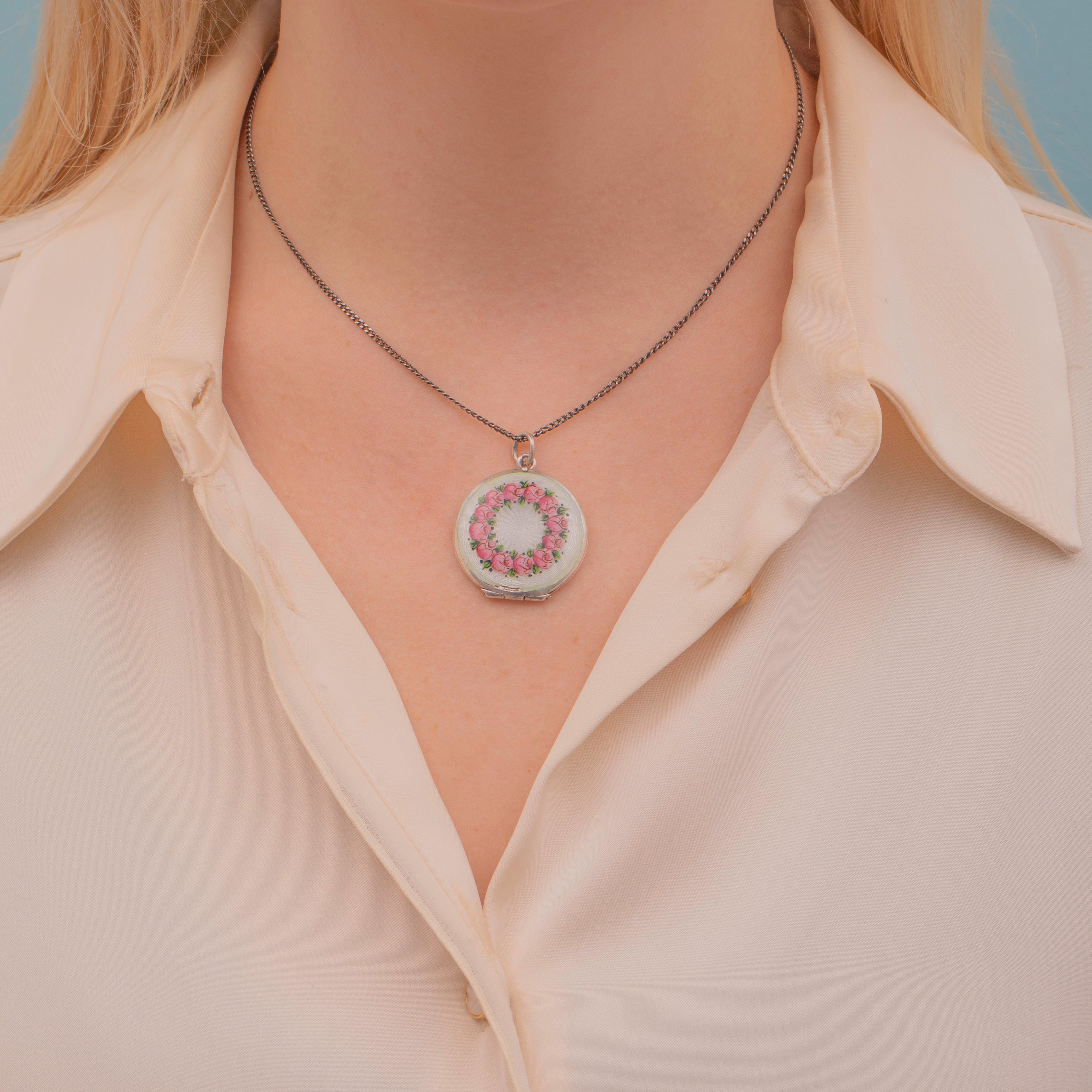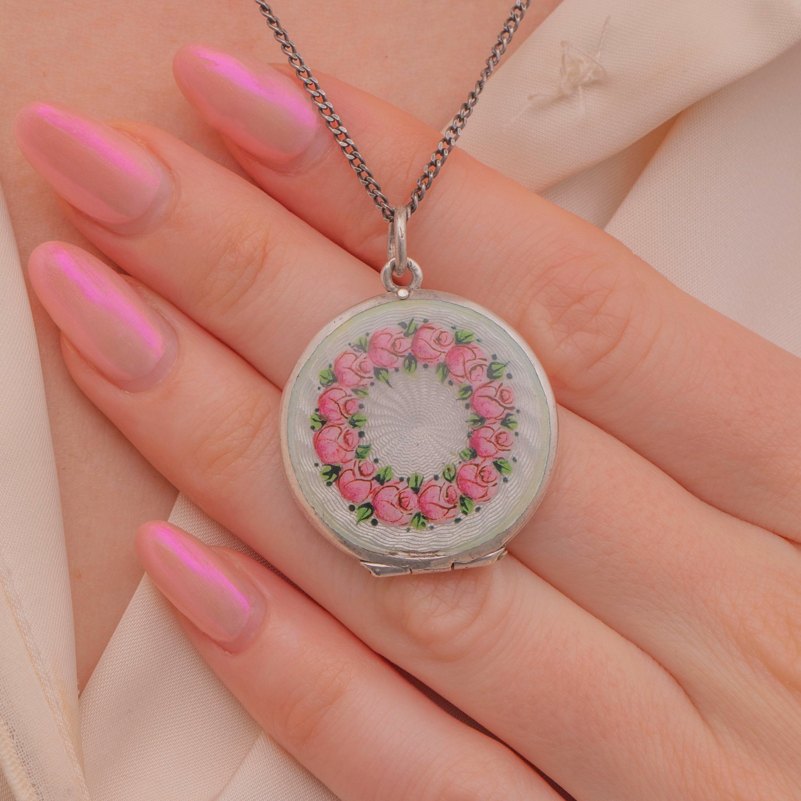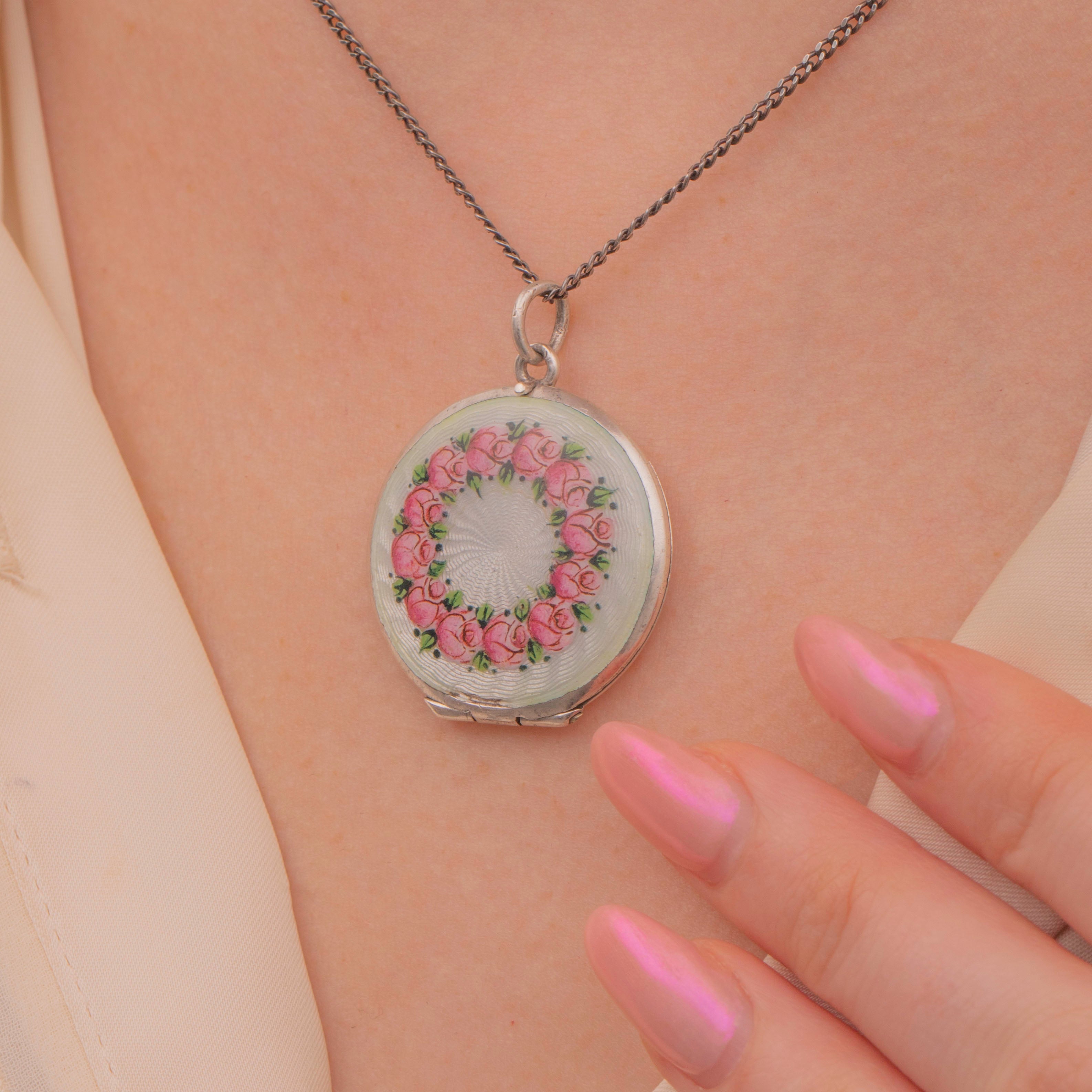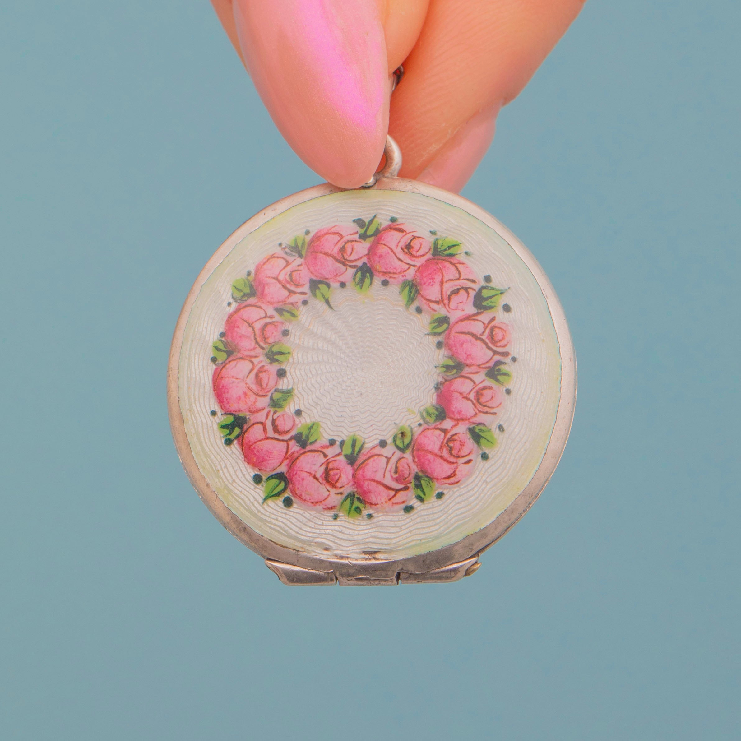 Art Deco Silver Guilloche Enamel Rose Garland Locket