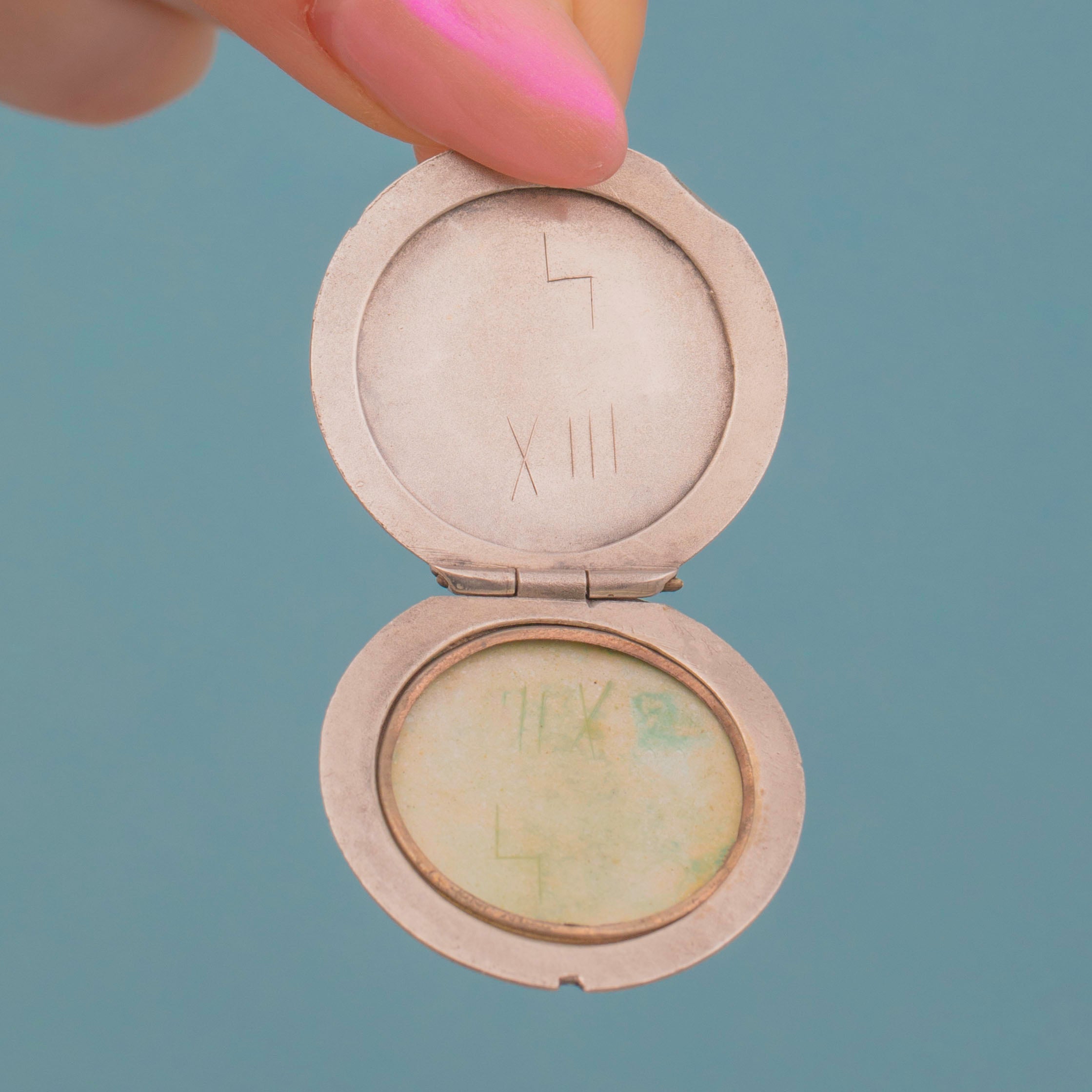 GOOD-VERY GOOD. This Art Deco Silver Guilloché Enamel locket is in very good condition. The Enamel is crisp and smooth with no chips or scuffs. The back of the locket does have some dings visible, but you can't see this when the piece is on the neck suspended from a chain. The inside of the locket is home to one frame, which will cover the Roman numerals etched on the inside. This is a gorgeous locket steeped in romantic sentiment!