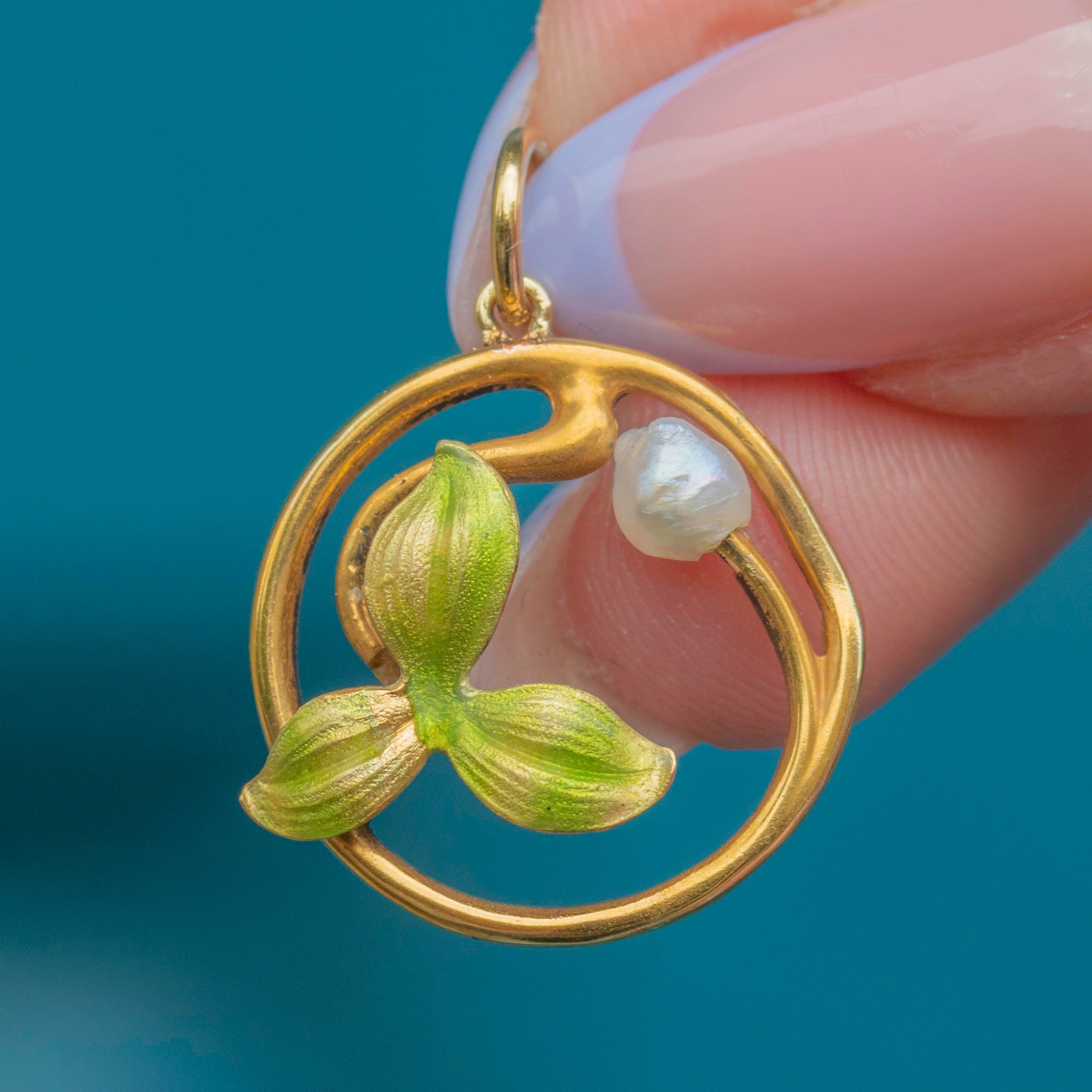 The pendant features an elegant sage green Enamel leaf motif, beautifully enhanced by the iridescent Pearl. They are displayed within curvaceous lines of saturated 14ct Gold, in quintessential Art Nouveau style, giving this lightweight pendant a resplendent sophistication.