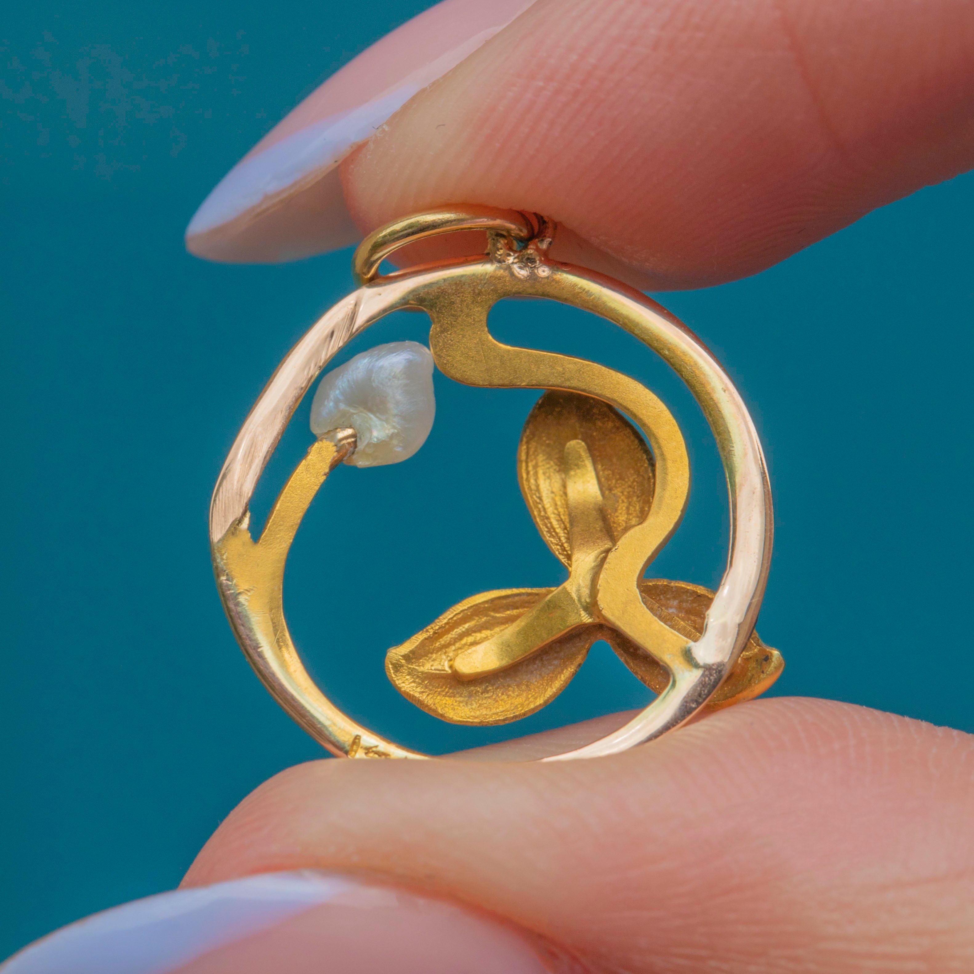 This Art Nouveau 14ct Gold Enamel Pearl pendant is a charming antique piece!