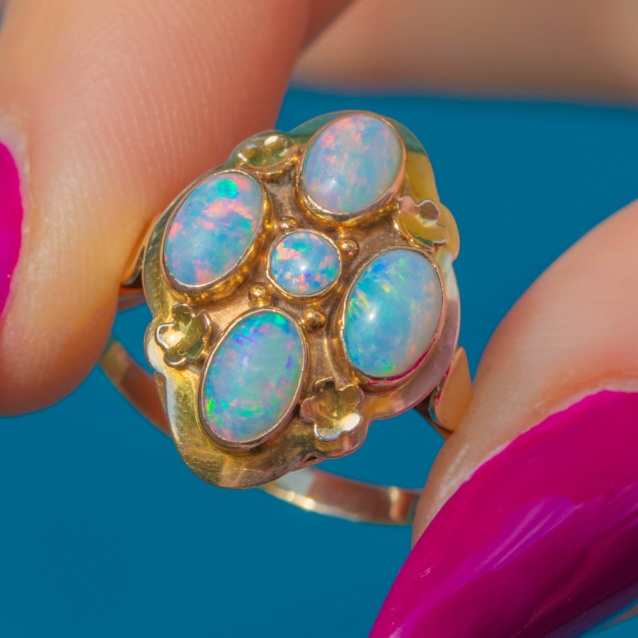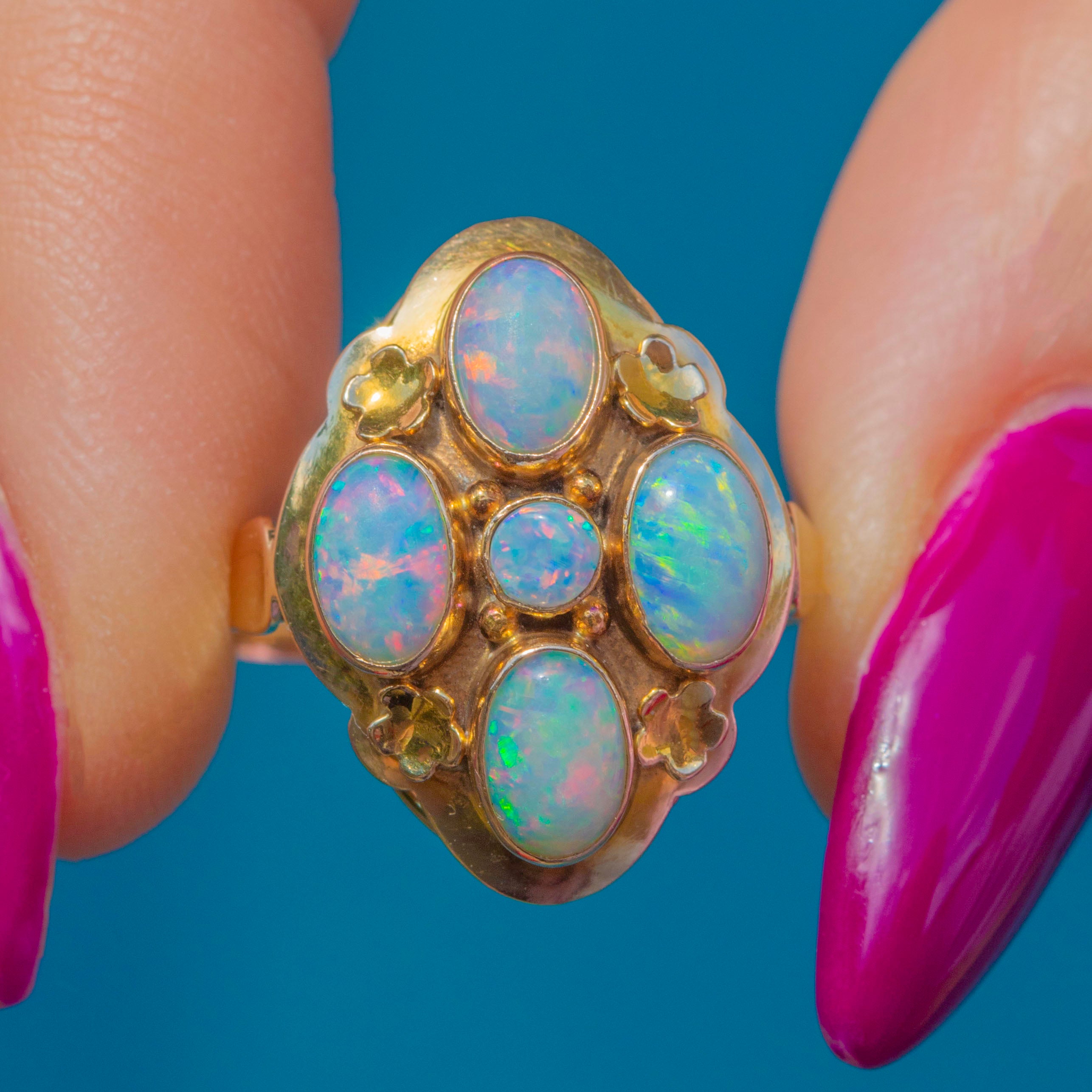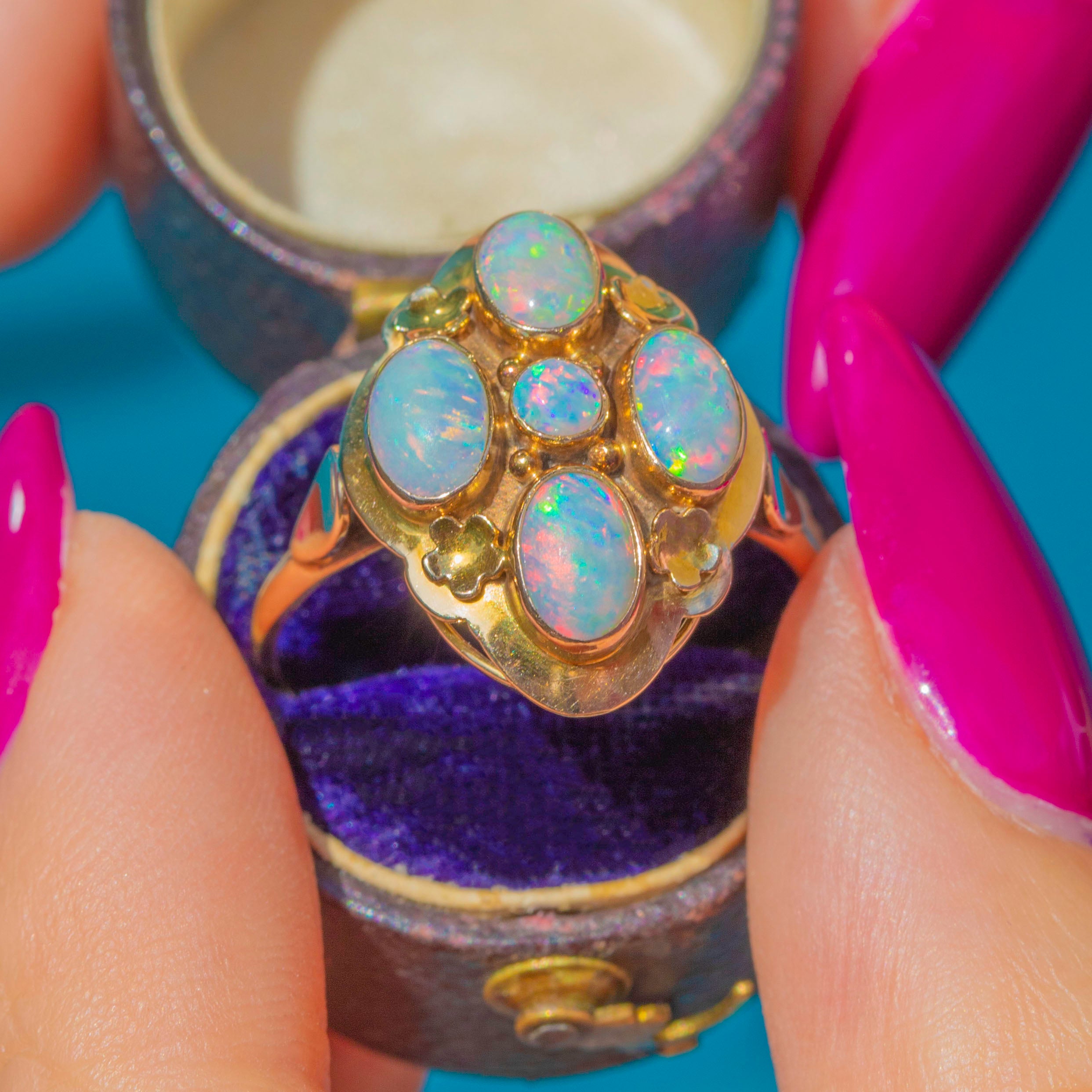 Made circa 1890, this Art Nouveau ring is a gorgeous example of the craftsmanship of the era! The ring is formed from solid 14ct Gold and displays five vibrant natural Opals accented by dainty floral motifs.