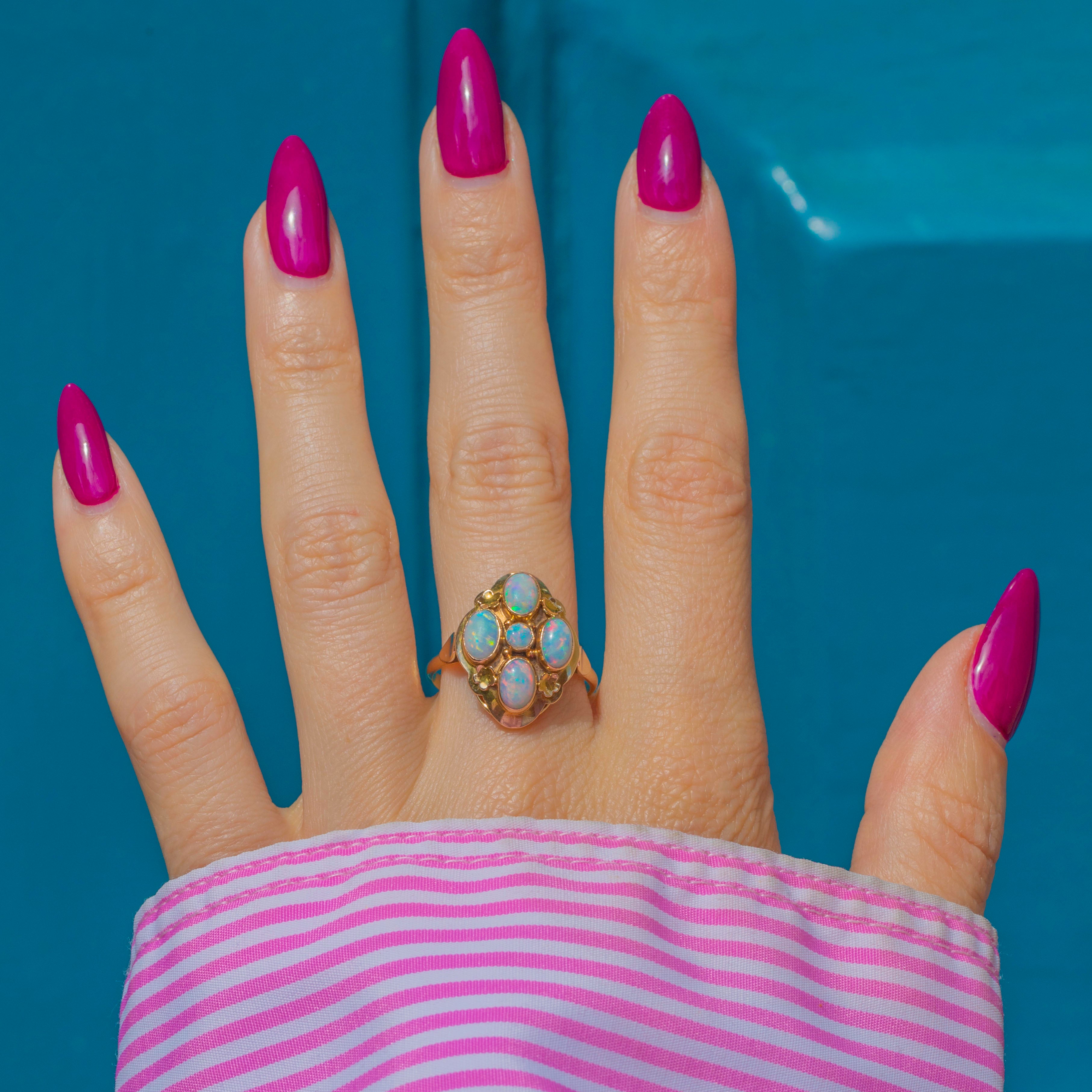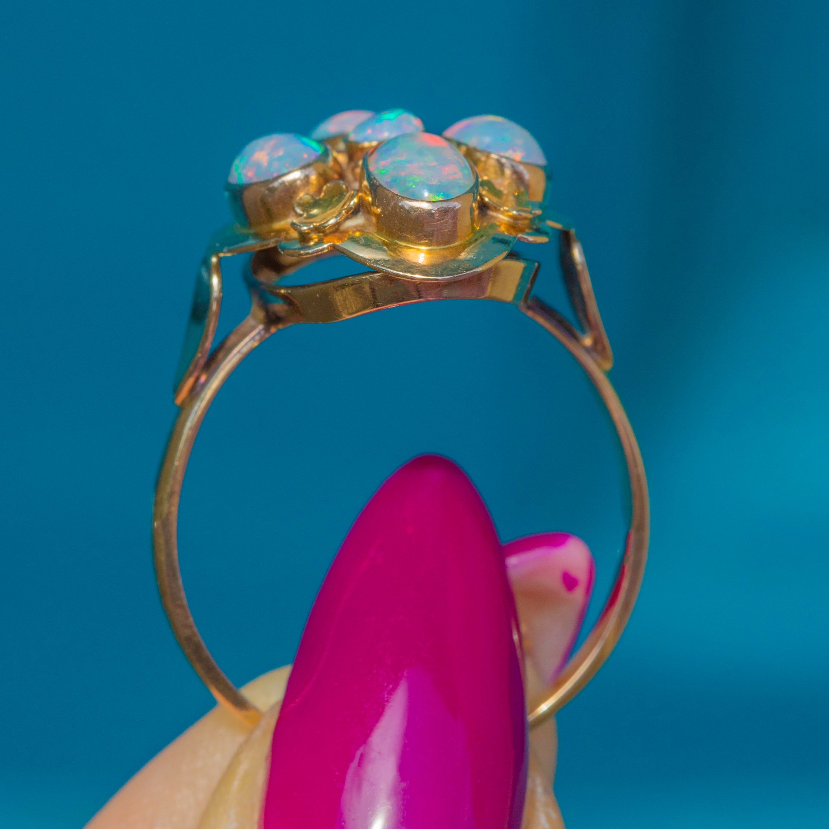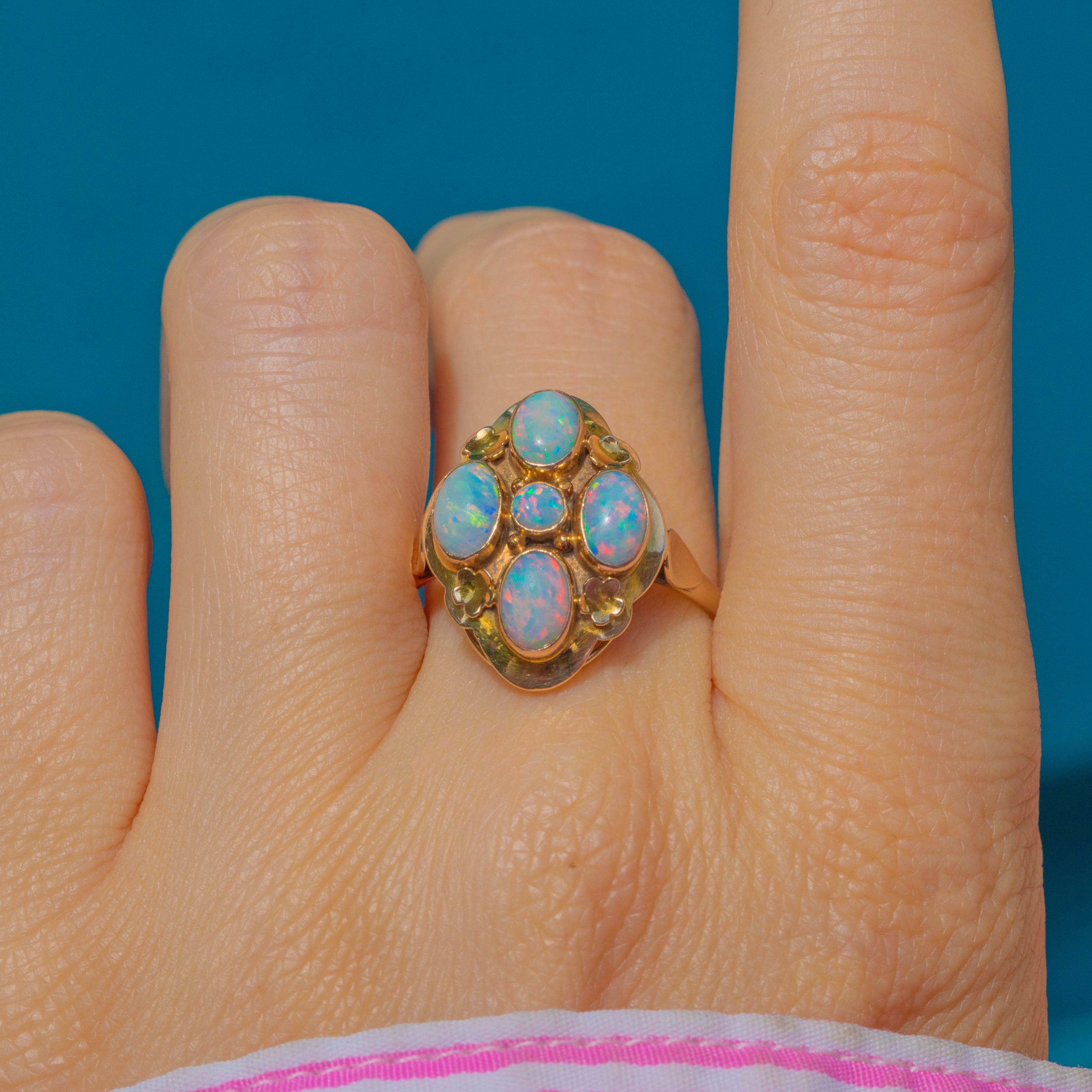 Made circa 1890, this Art Nouveau ring is a gorgeous example of the craftsmanship of the era! The ring is formed from solid 14ct Gold and displays five vibrant natural Opals accented by dainty floral motifs.