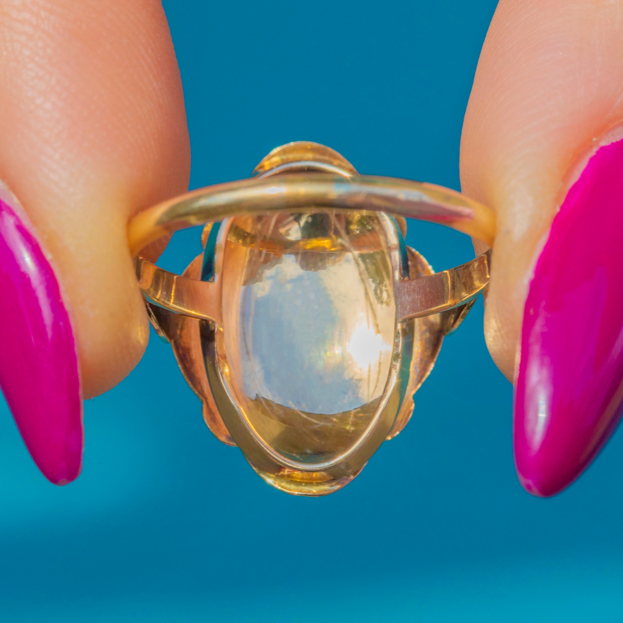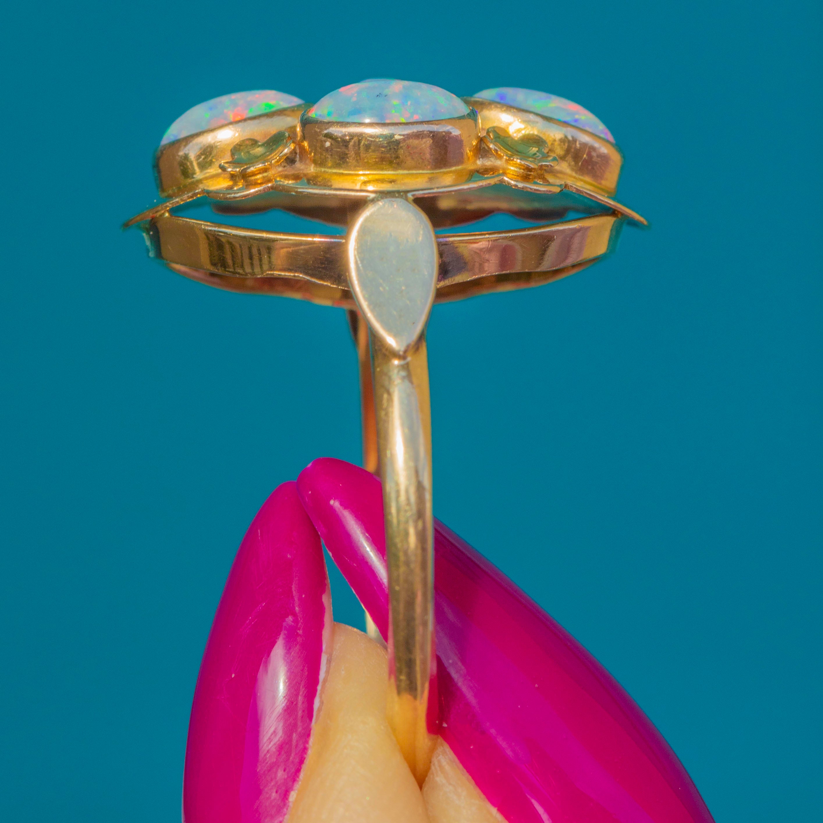EXCELLENT: The Opals are smooth and securely set within their bezels, free from chips or scuffs. The Gold is glossy and the ring has held its form well, with no dings or scuffs to note. With a smooth and robust shank, this Art Nouveau Opal ring promises many more years of wear and enjoyment!