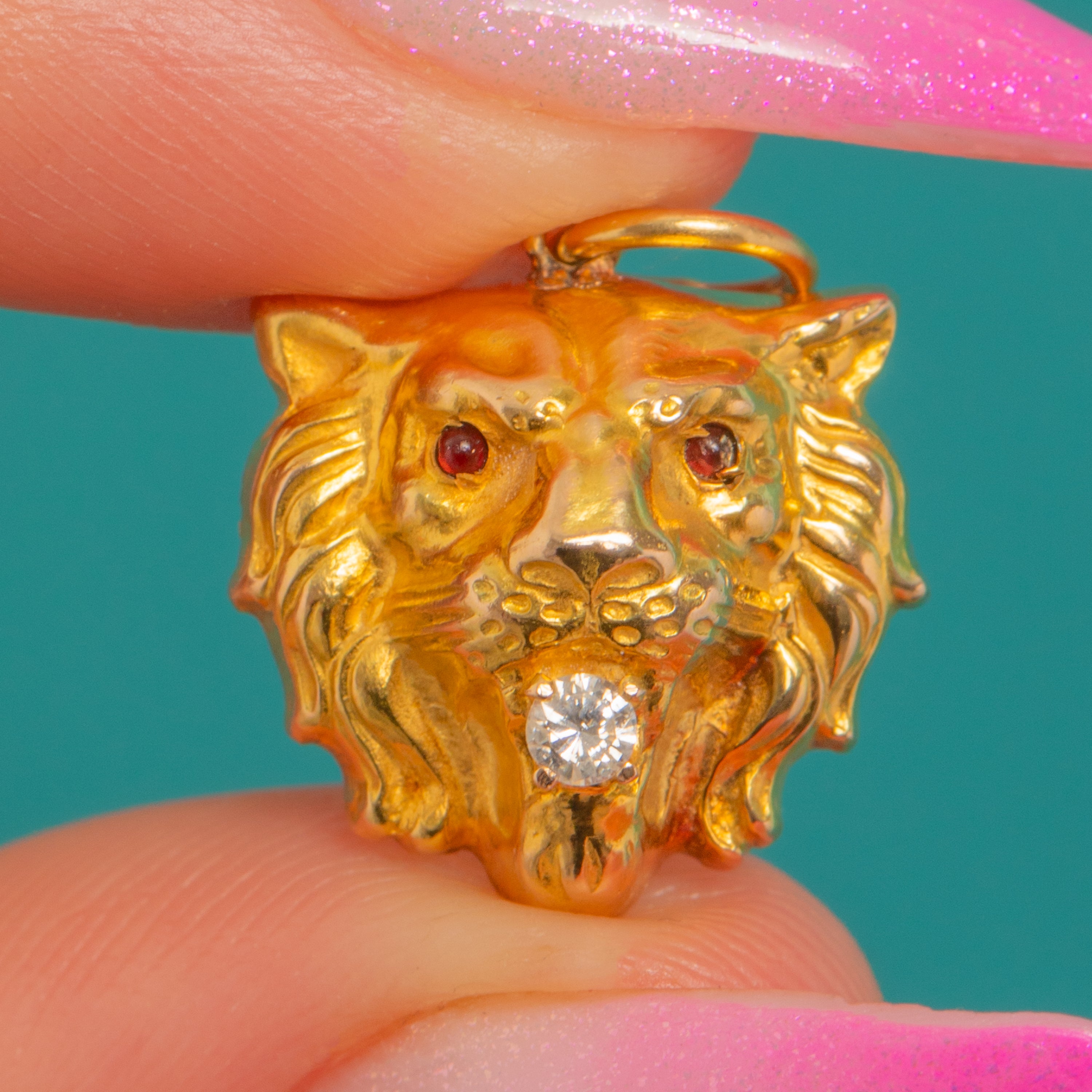 Art Nouveau 15ct Gold Lion Charm, Diamond Mouth & Ruby Eyes