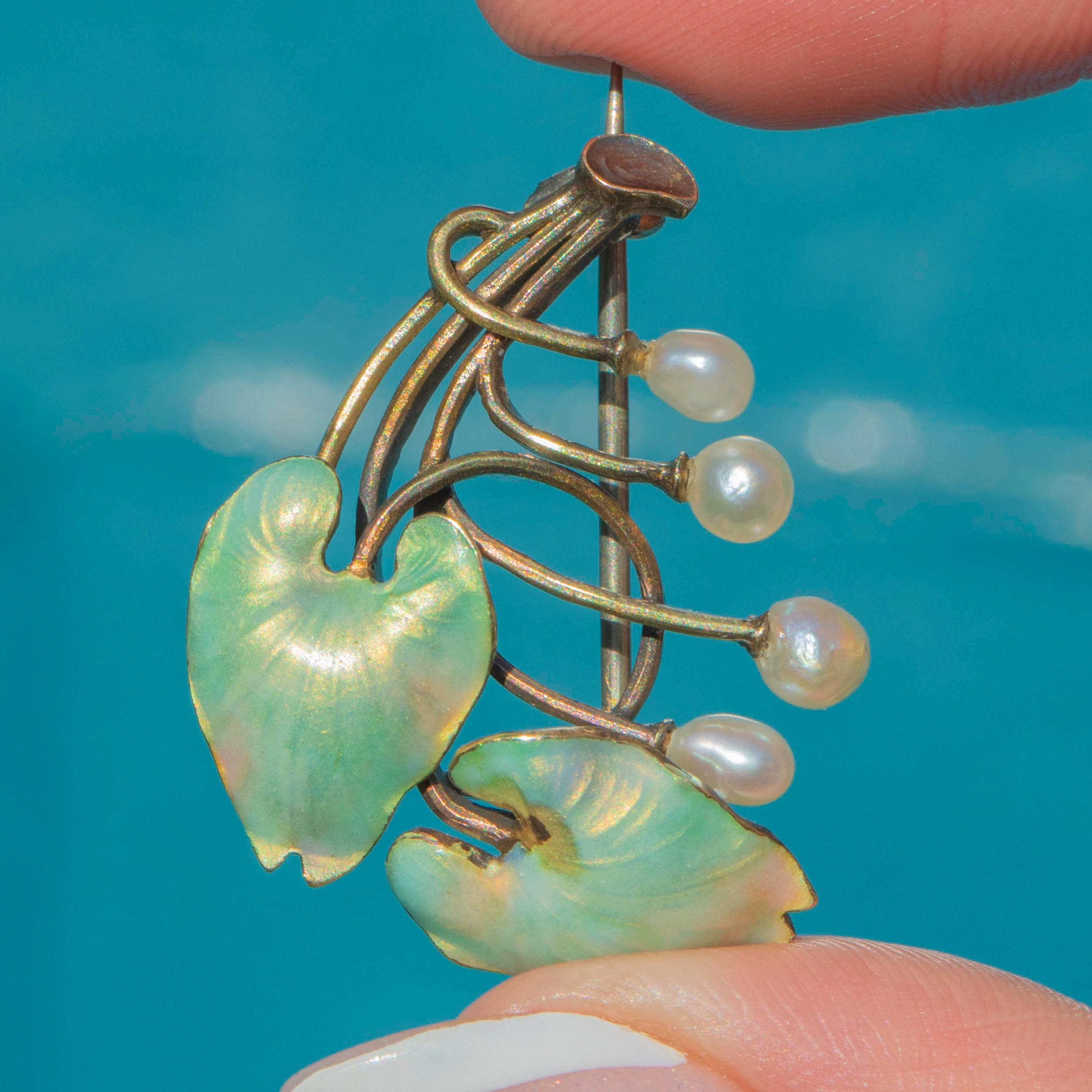 This Art Nouveau 18ct Gold Enamel Pearl brooch is a unique treasure! Curvaceous vines of 18ct Gold form this whimsical piece, proudly displaying shimmering white Pearls and striking Enamel lily pads.