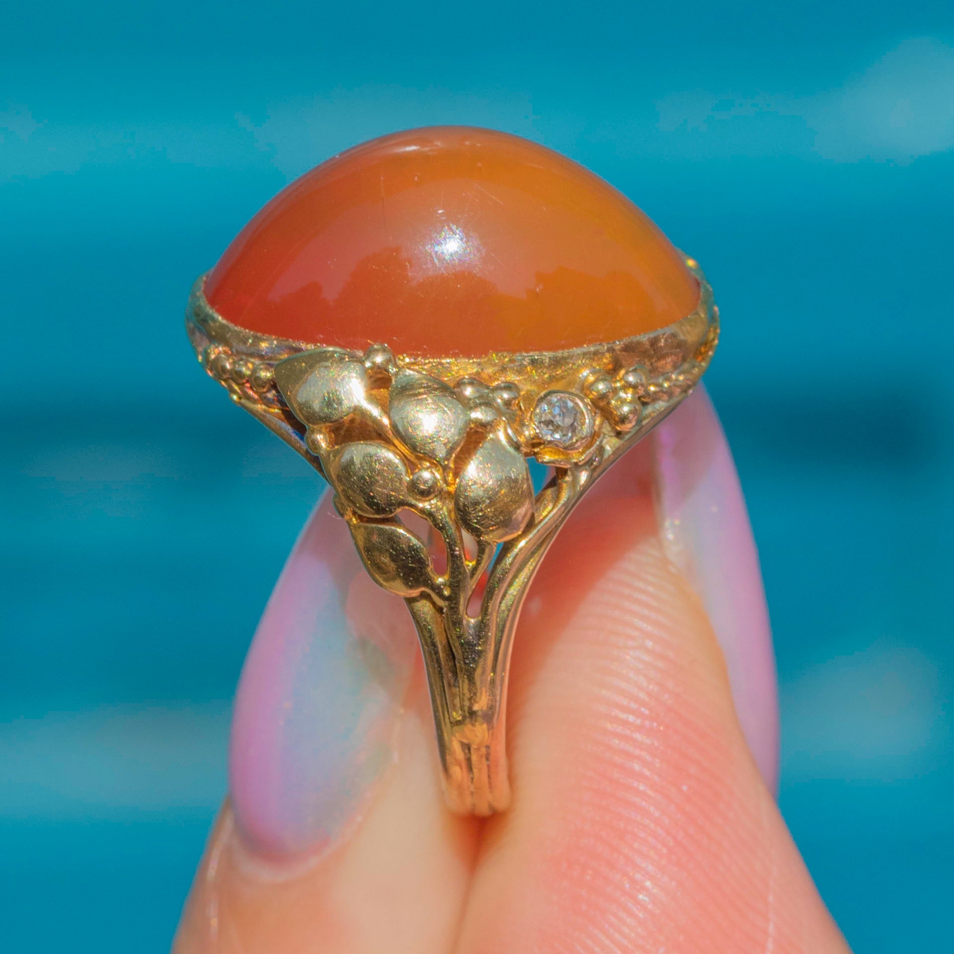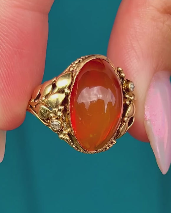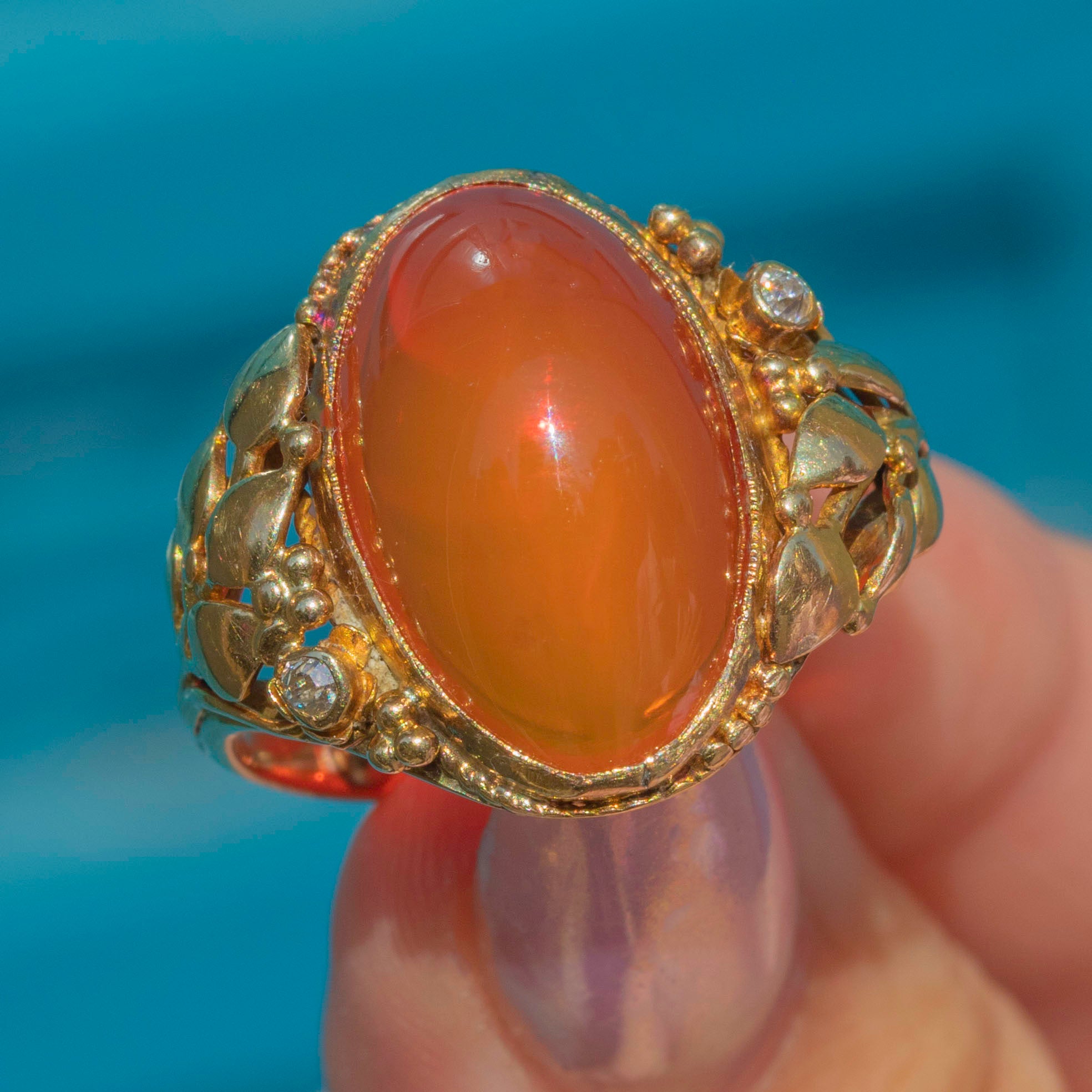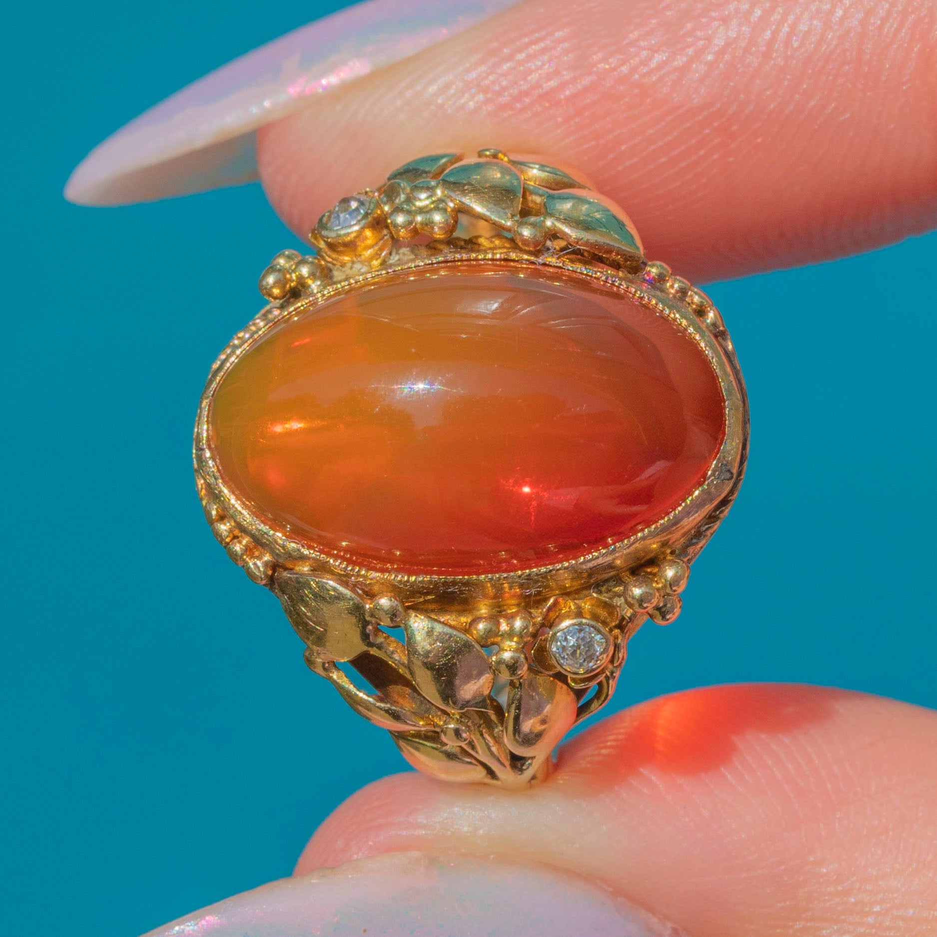 Art Nouveau 18ct Gold Fire Opal Cabochon Diamond Ring, 5.60ct Natural Solid Fire Opal Item added
