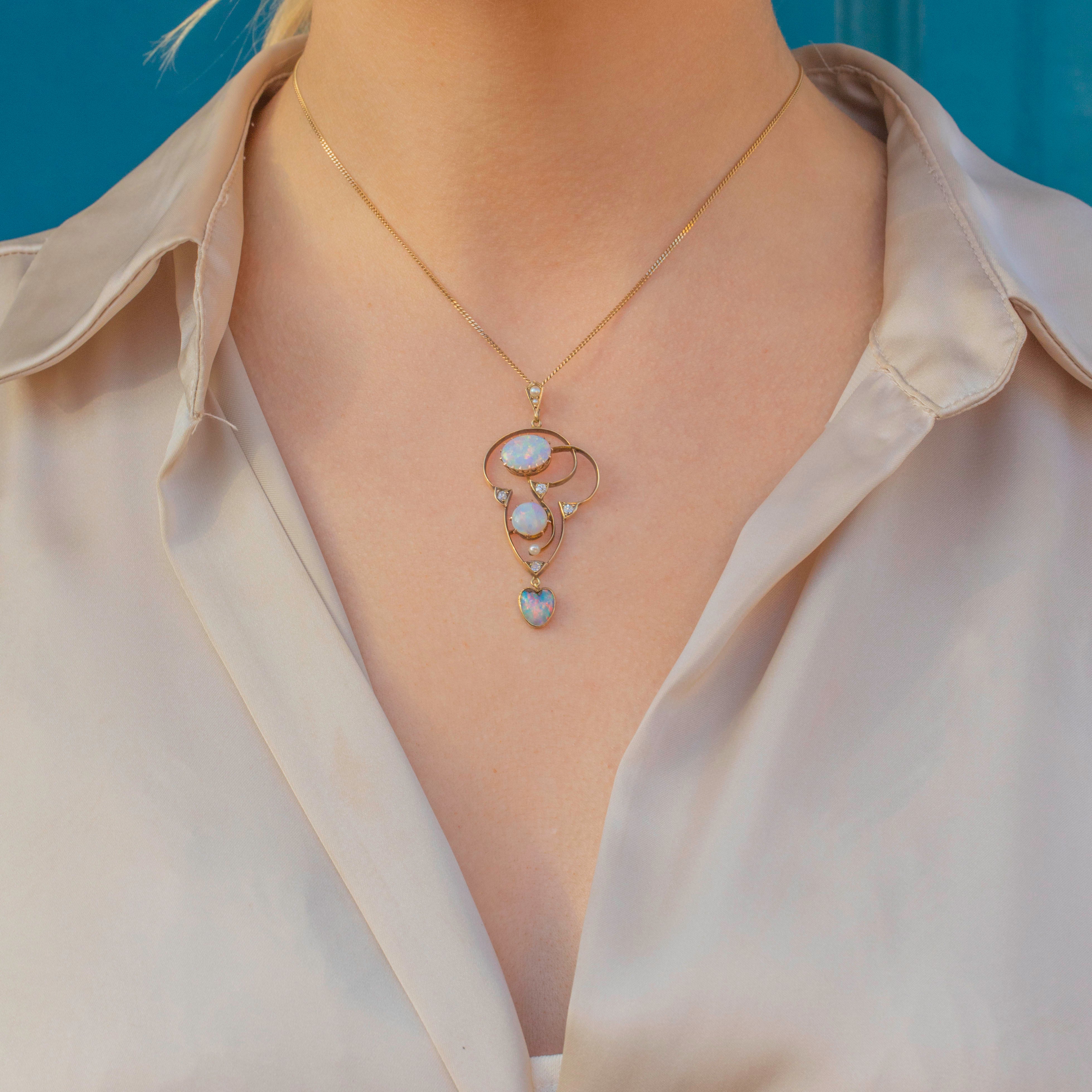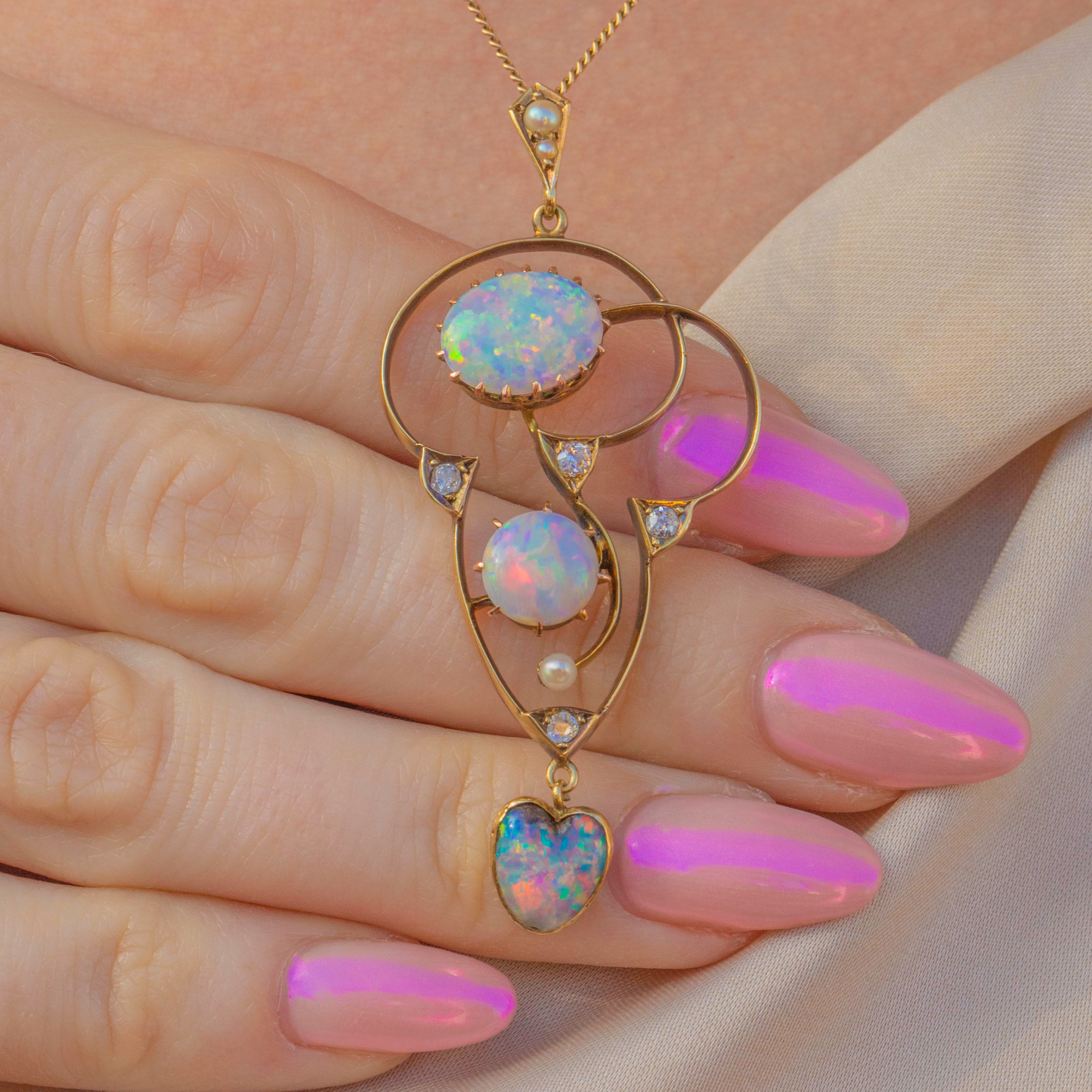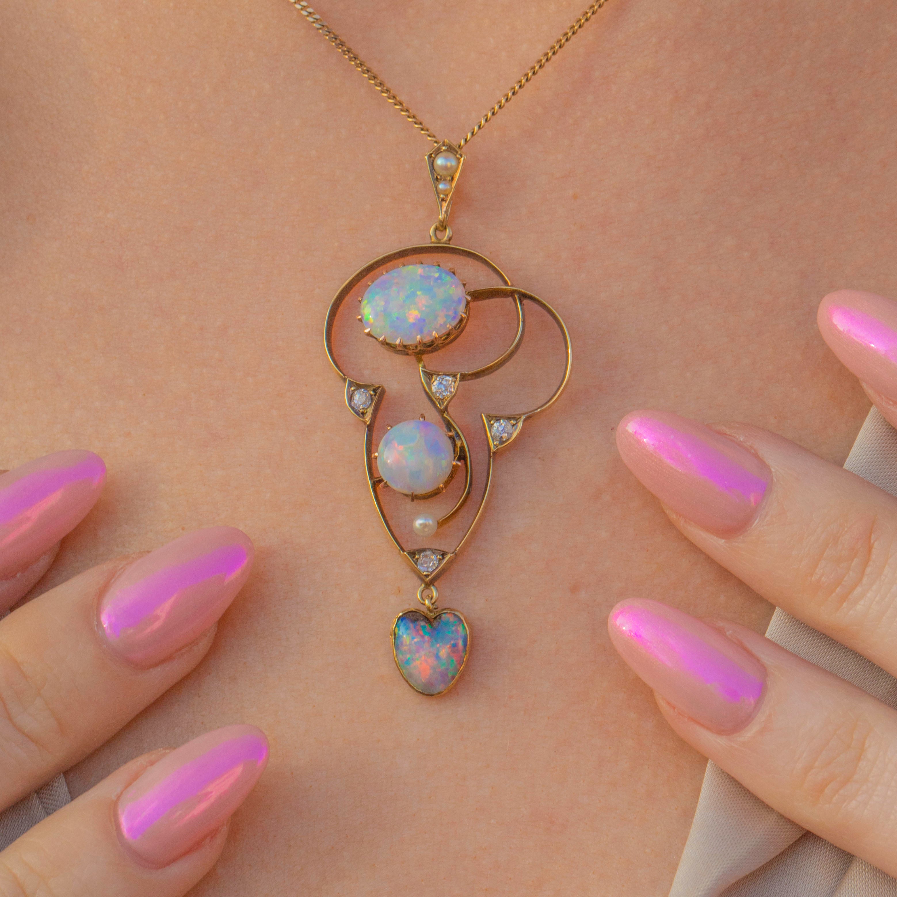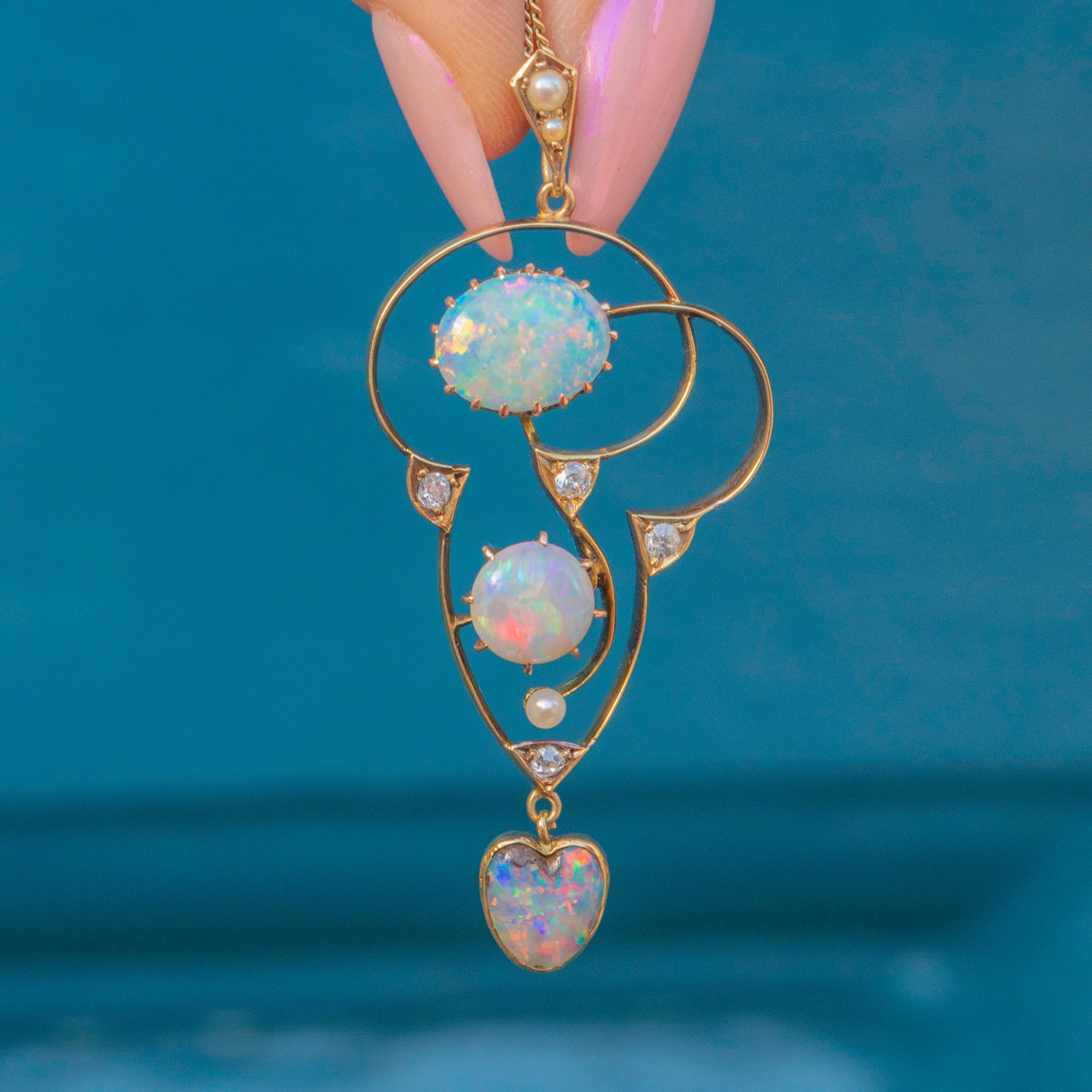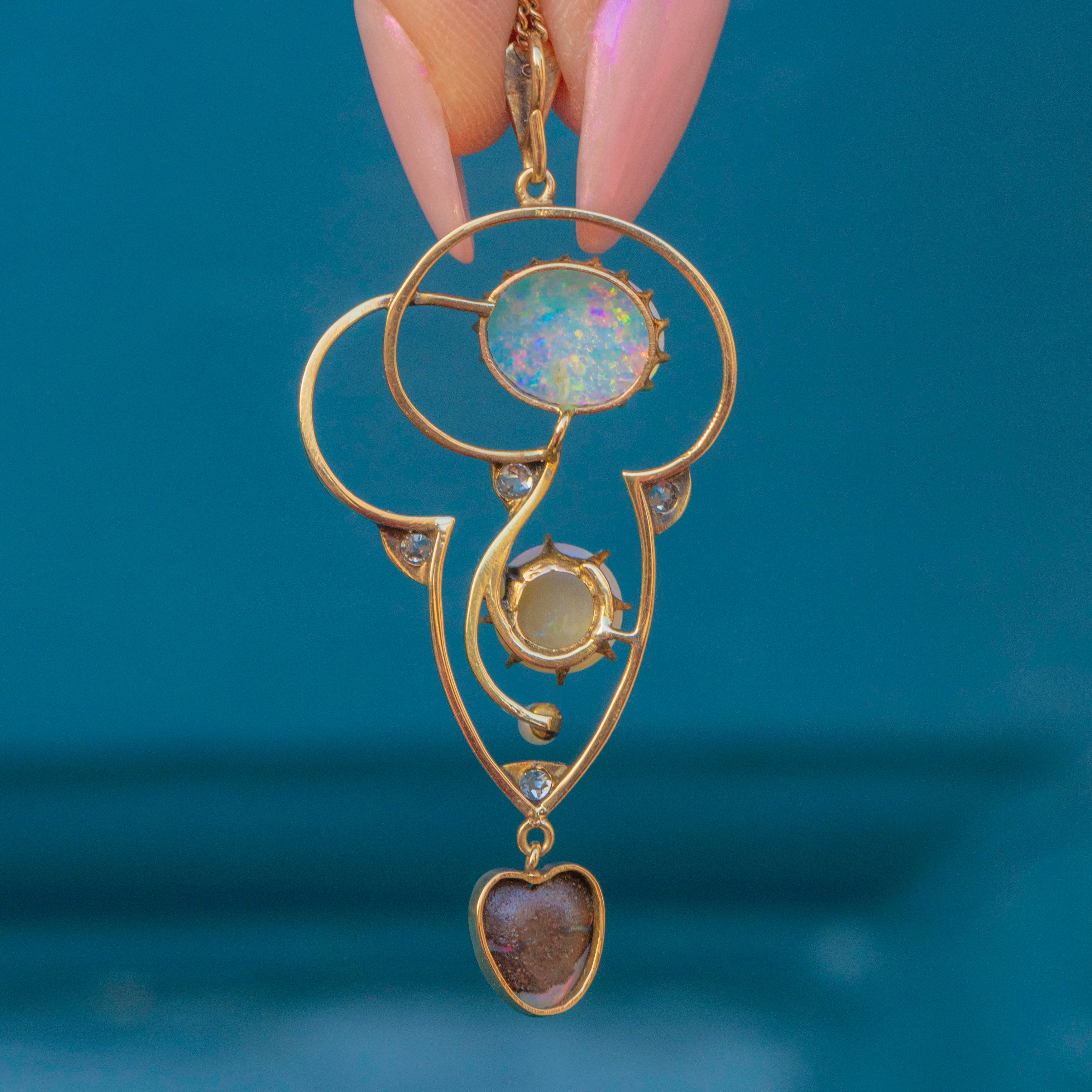 VERY GOOD. This Art Nouveau 18ct Gold Opal Diamond pendant is in very good condition. Her Opals are radiant and smooth, securely held within their bezel settings. There is some minor wear to the heart Opal commensurate with age, however this is not overly noticeable when wearing. The Pearls and Diamonds are all present and free from any wear. With its unique design and exquisite display of antique gemstones, this Art Nouveau drop pendant will become your newest obsession!