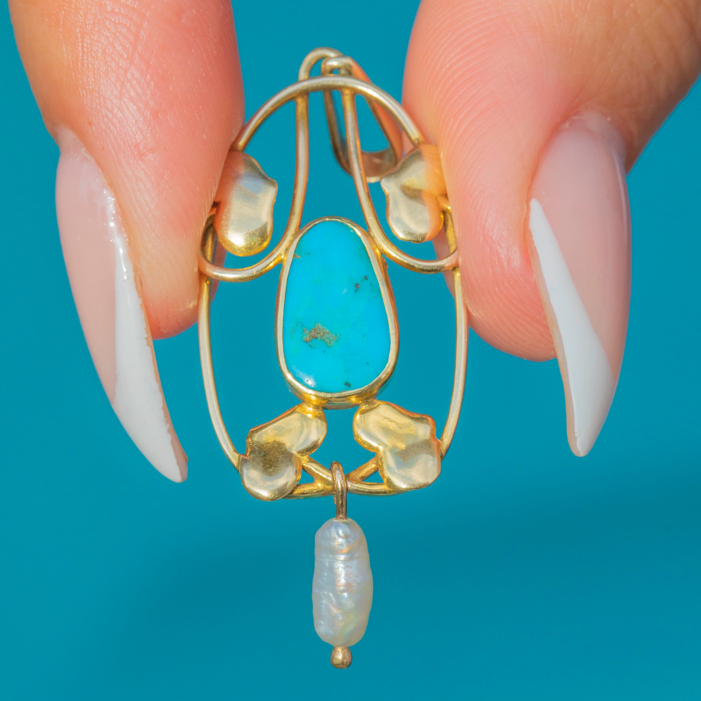 Art Nouveau 18ct Gold Turquoise Pearl Pendant  - Attributed to Murrle Bennett Item added