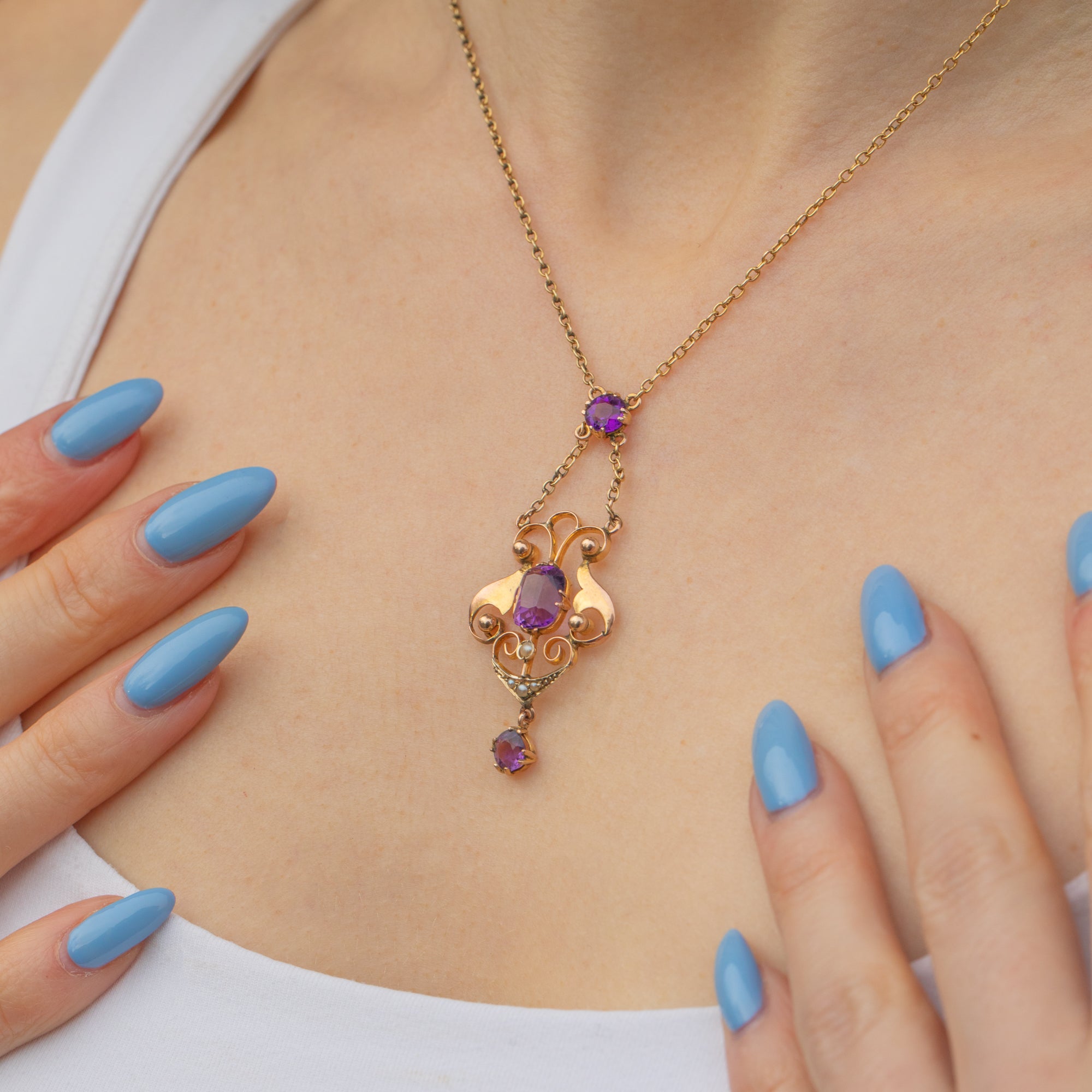 This Art Nouveau 9ct Gold Amethyst Pearl drop necklace is a wonderfully elegant piece to add to your collection.