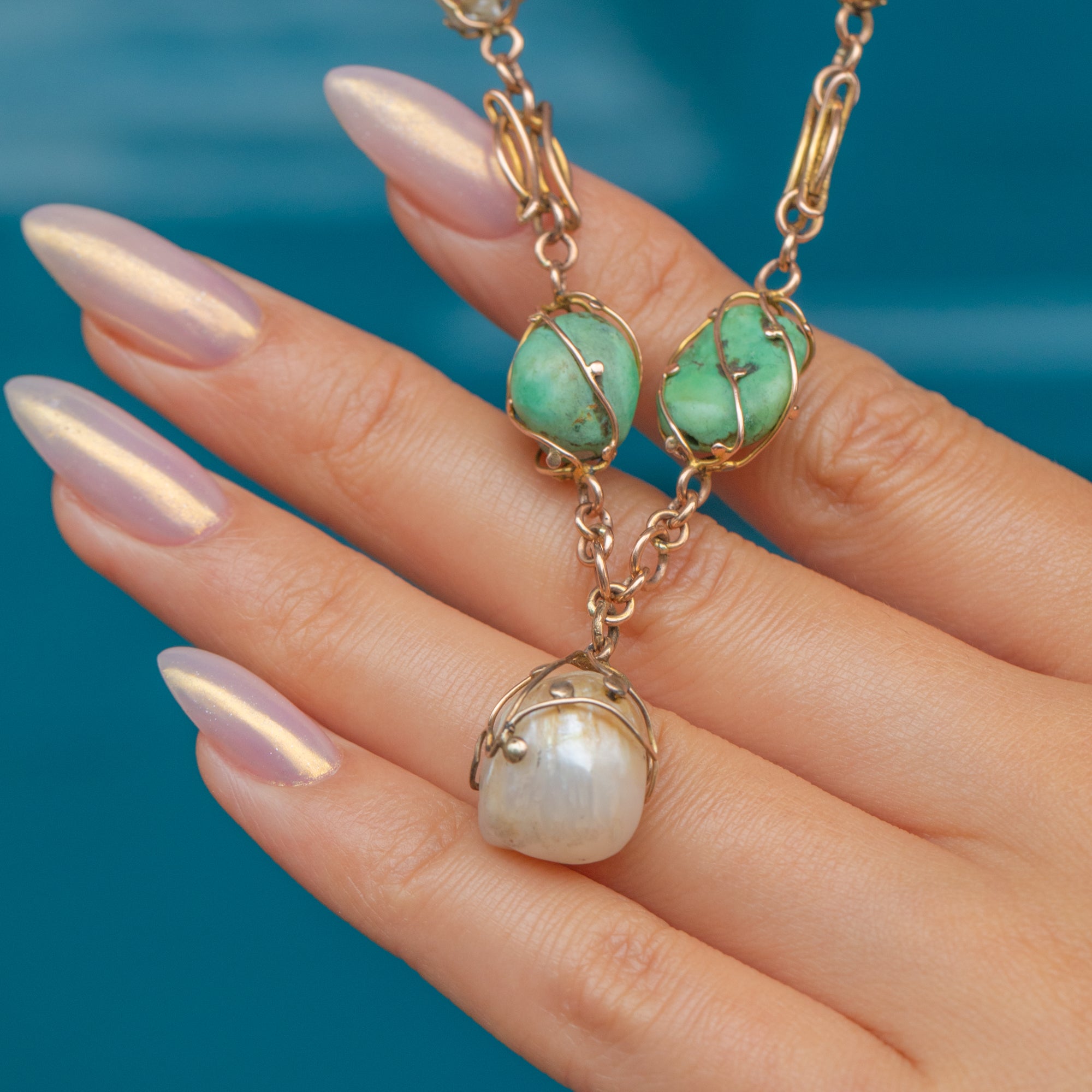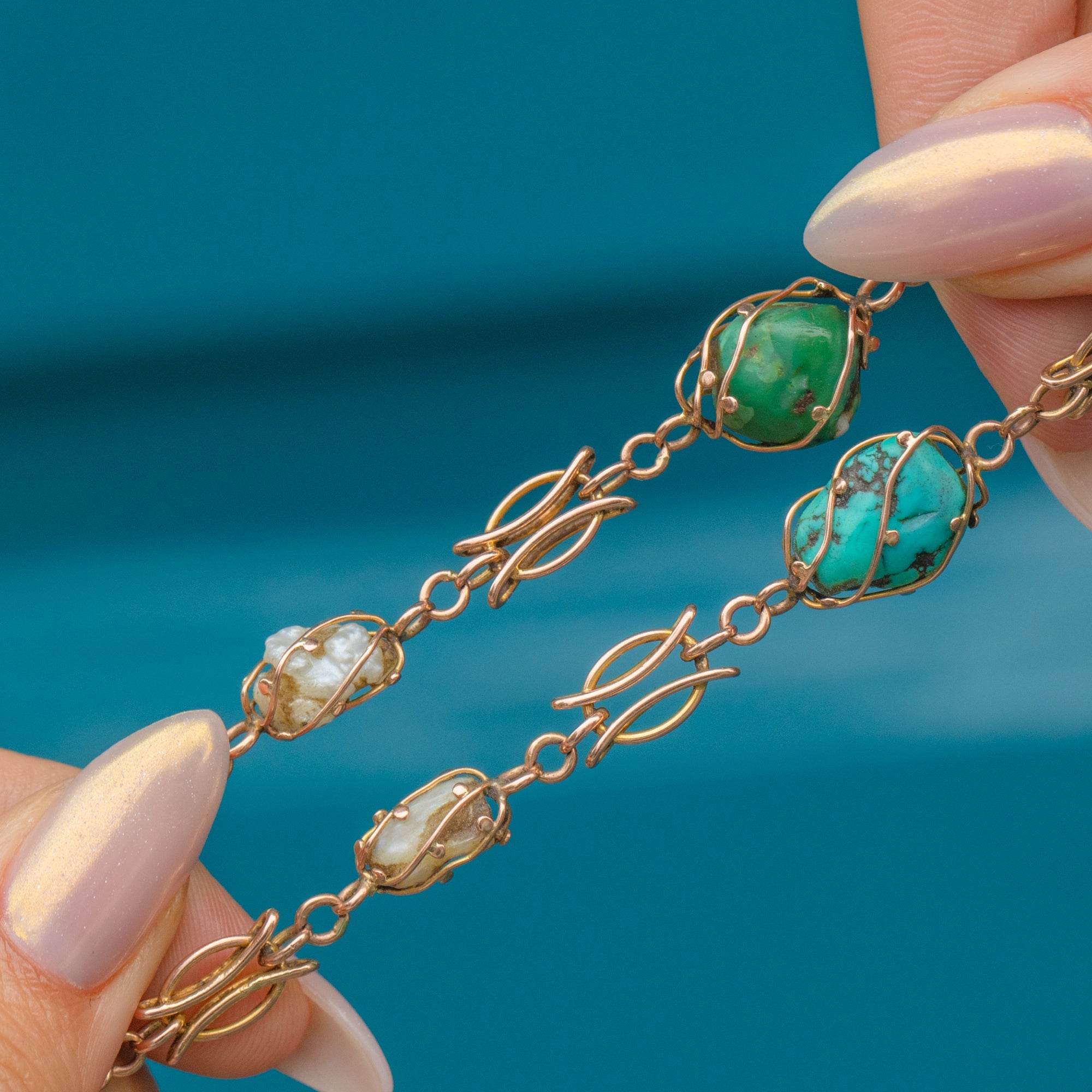 This Art Nouveau 9ct Gold necklace showcases a graceful arrangement of Matrix Turquoise and Baroque Pearls, beautifully graduating in size along the 16" chain.