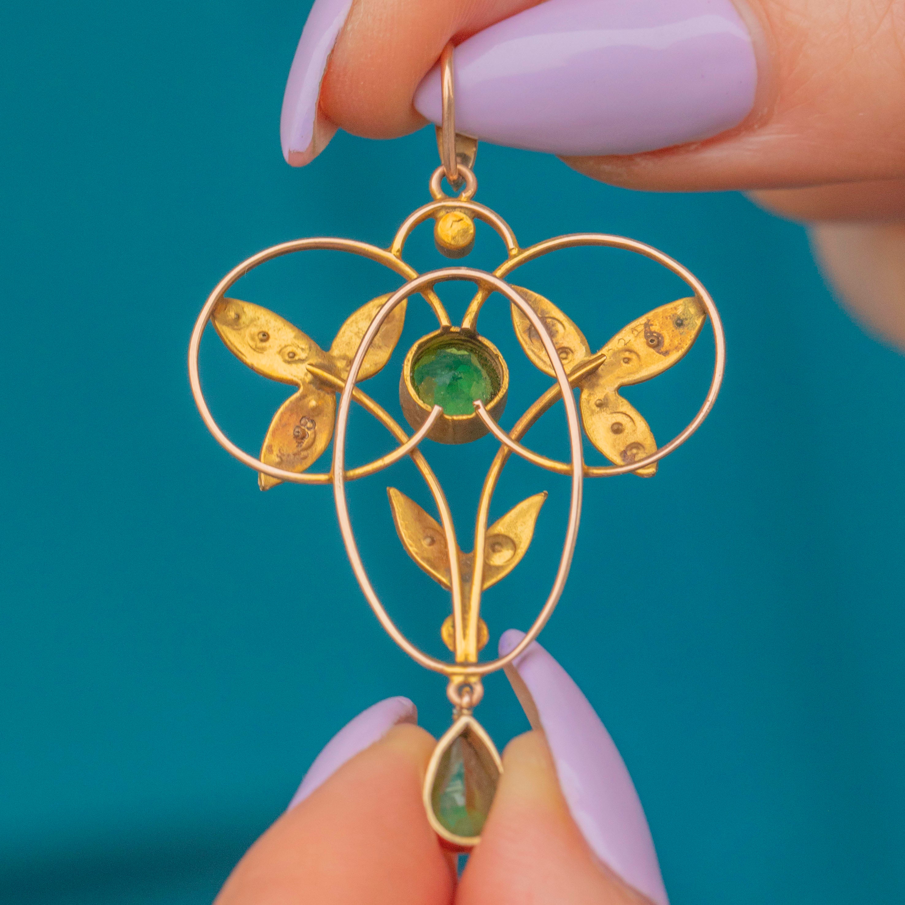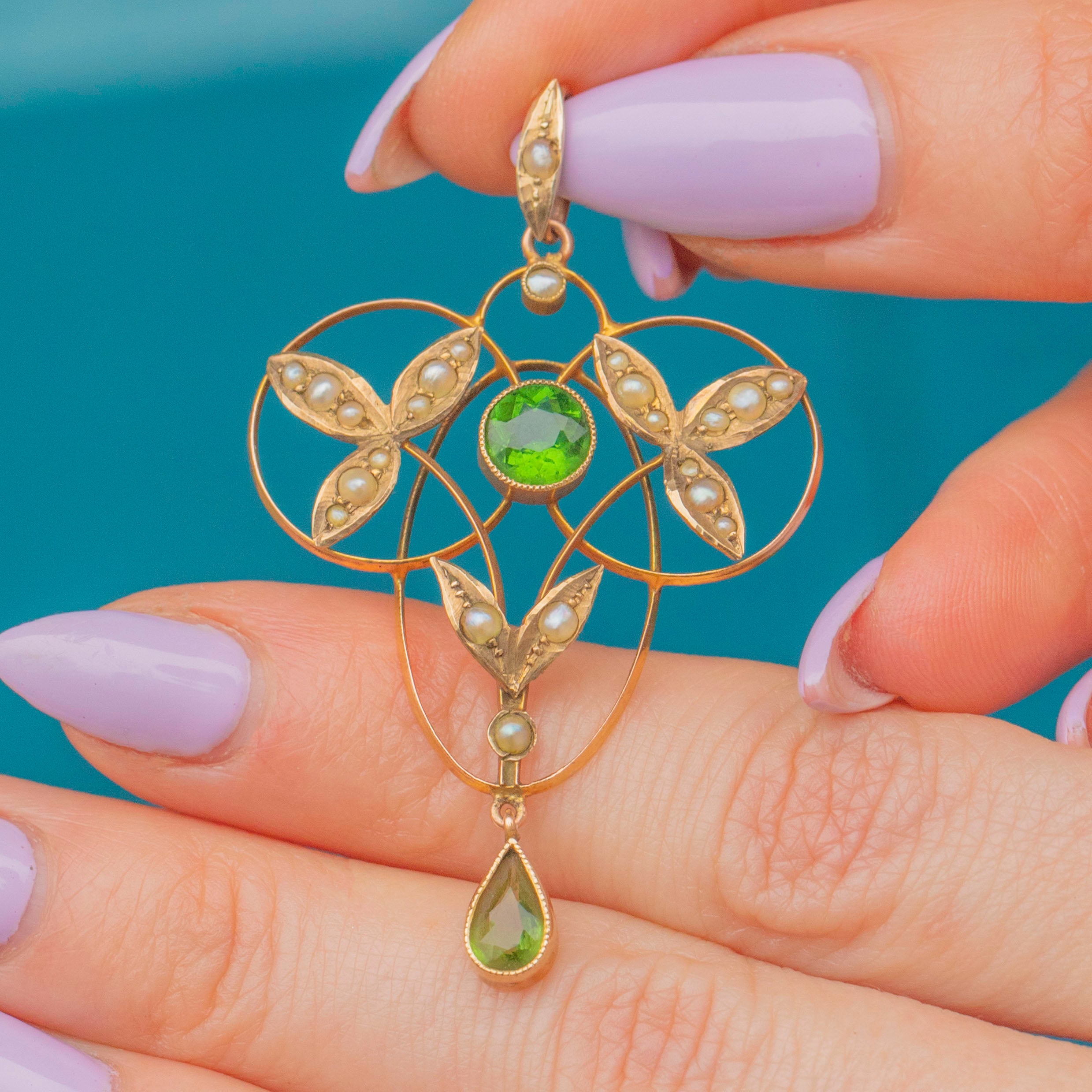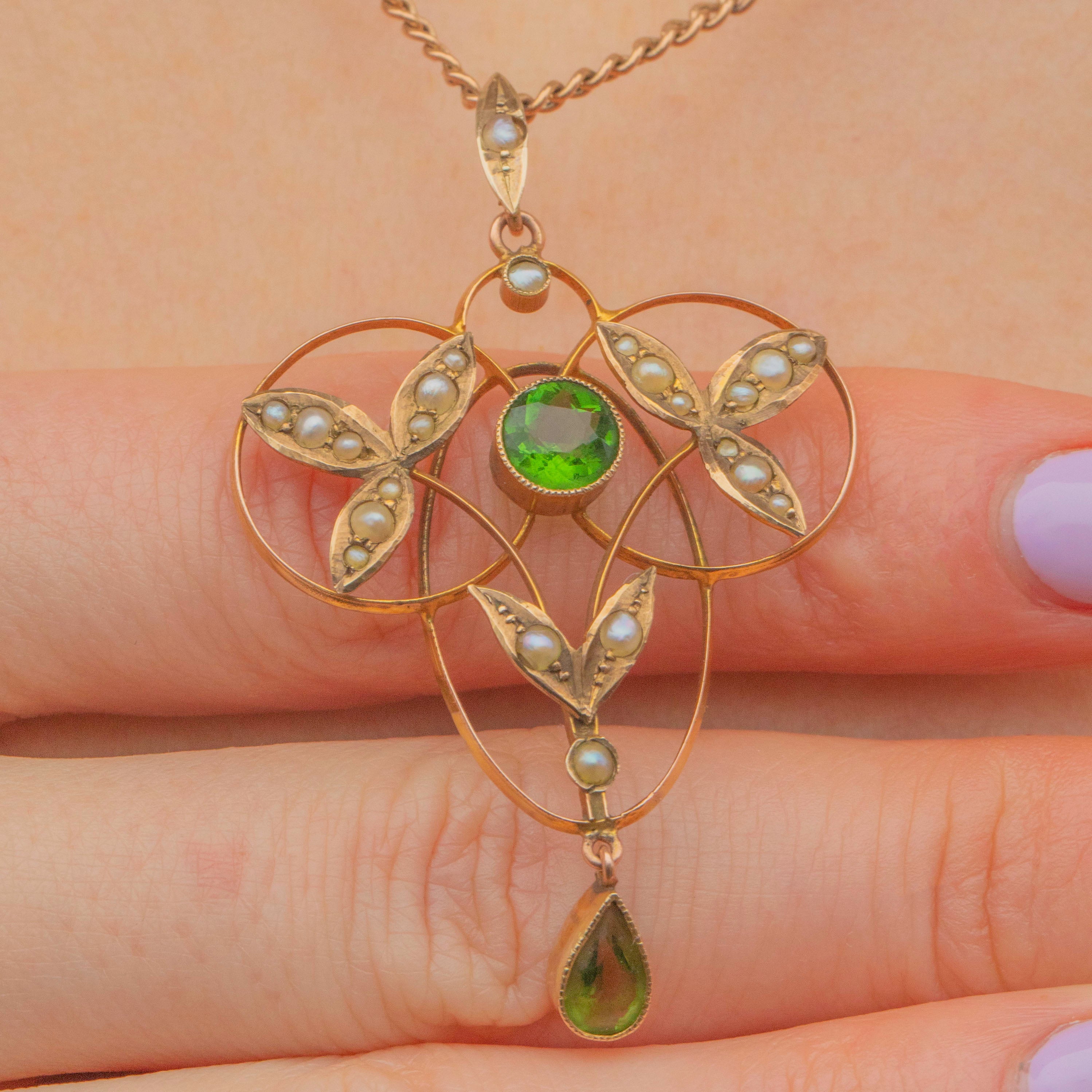 Art Nouveau 9ct Gold Pearl & Green Paste Lavalier Pendant