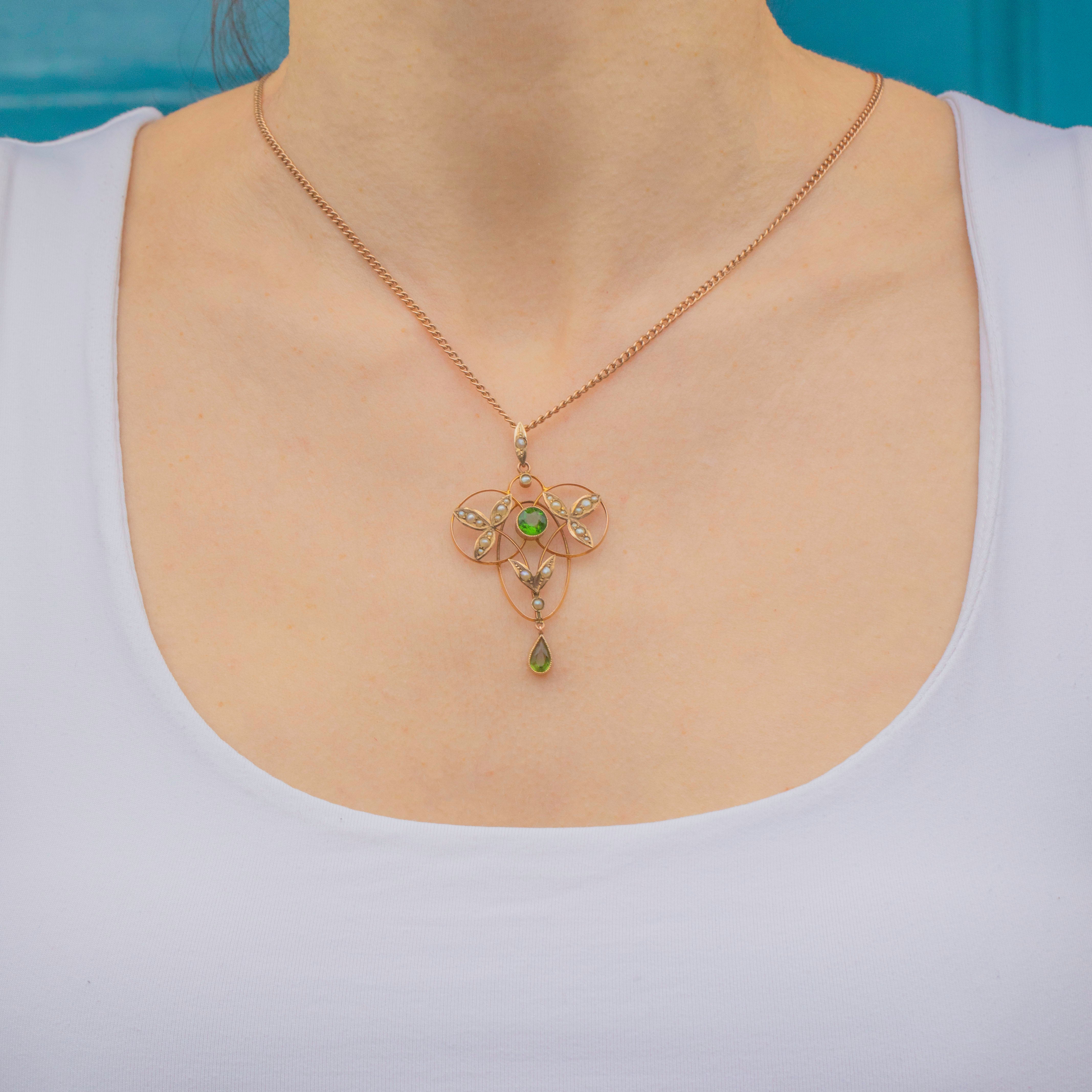 This striking Art Nouveau 9ct Gold Pearl & vivid green Paste Lavalier pendant will bring a touch of refinement to your collection! Bursting with eye-catching details and crafted from solid 9ct Gold, this Art Nouveau pendant is formed of sweeping curved lines and leaf details studded with a generous helping of gems.