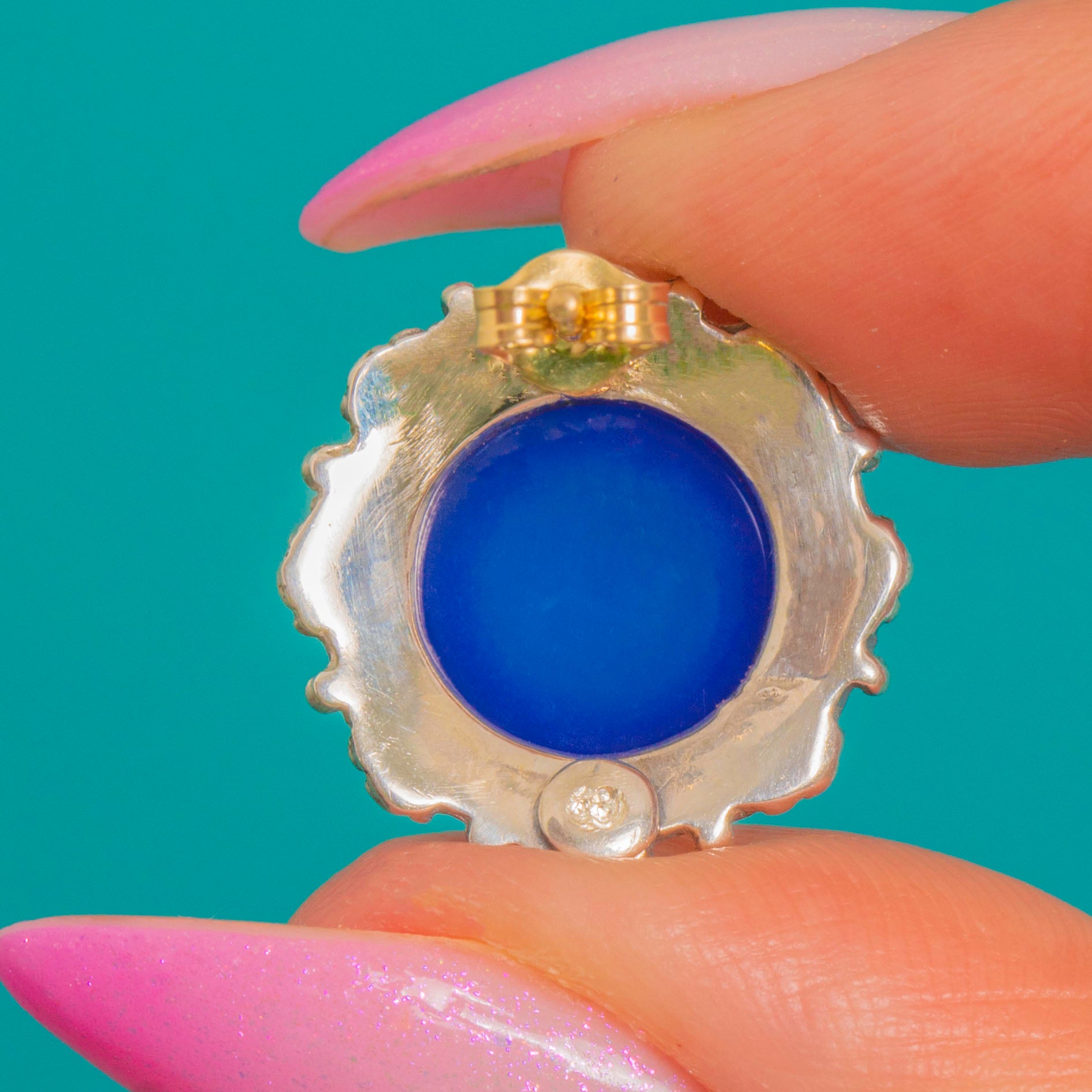 A striking pair, the glossy Blue Chalcedony glows beautifully against the sculpted Silver. Finished with 9ct Gold posts and butterfly backs for comfortable, secure wear, they’re a chic, everyday nod to turn-of-the-century craftsmanship.