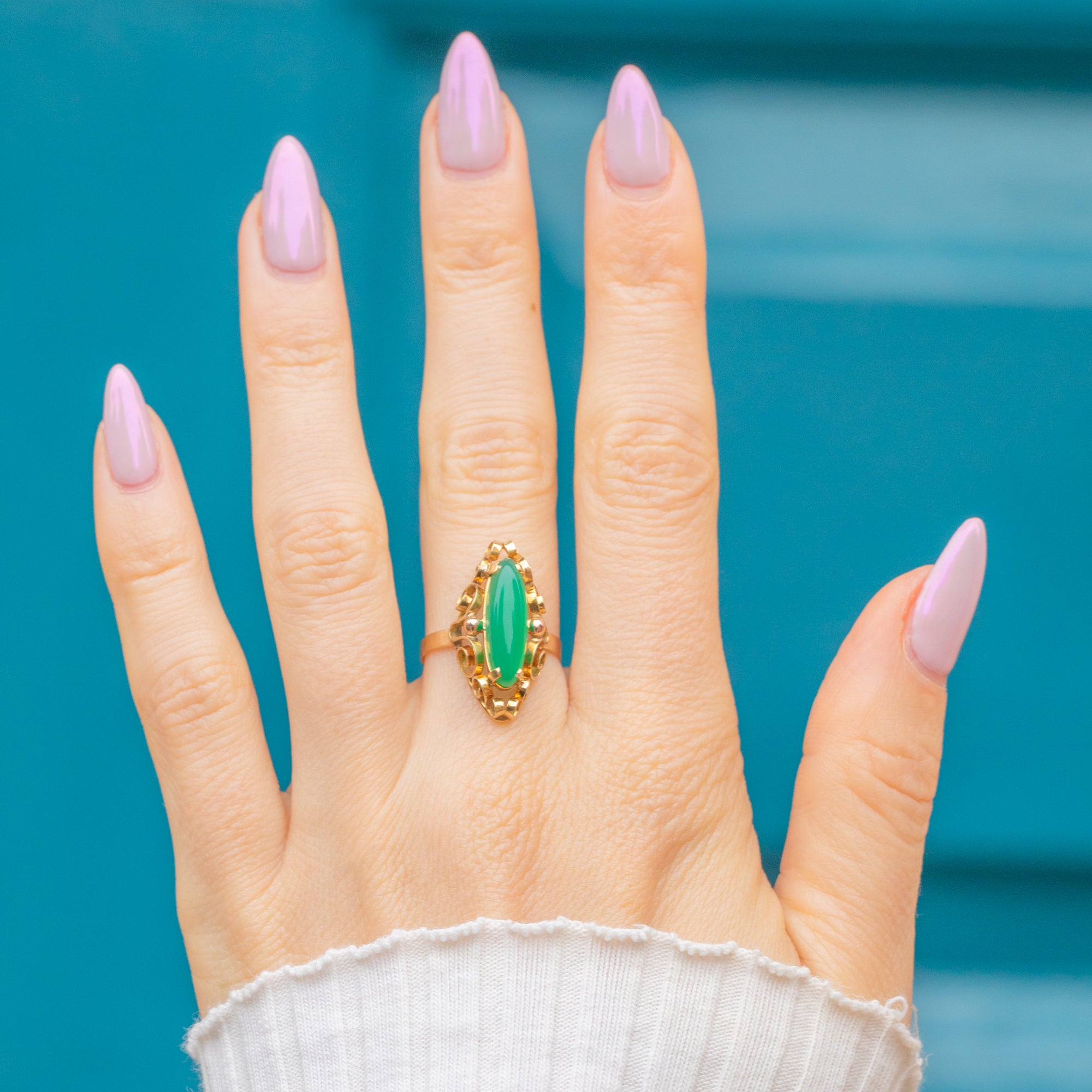 This elegant early 20th-century ring is crafted in 14ct Gold and set with a striking elongated Green Chalcedony. The smooth, polished stone displays a soft, luminous glow, typical of fine Austrian craftsmanship from the Arts & Crafts era. Its sleek silhouette and refined proportions give it a timeless, modern feel despite its antique origins.