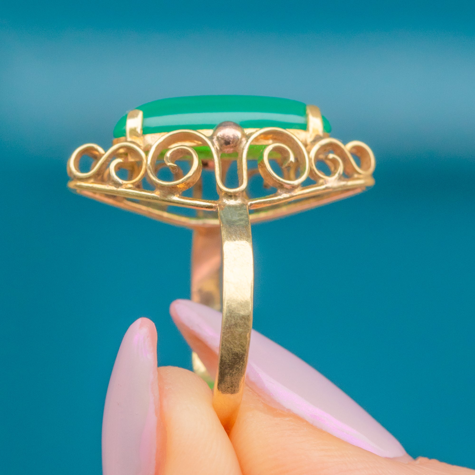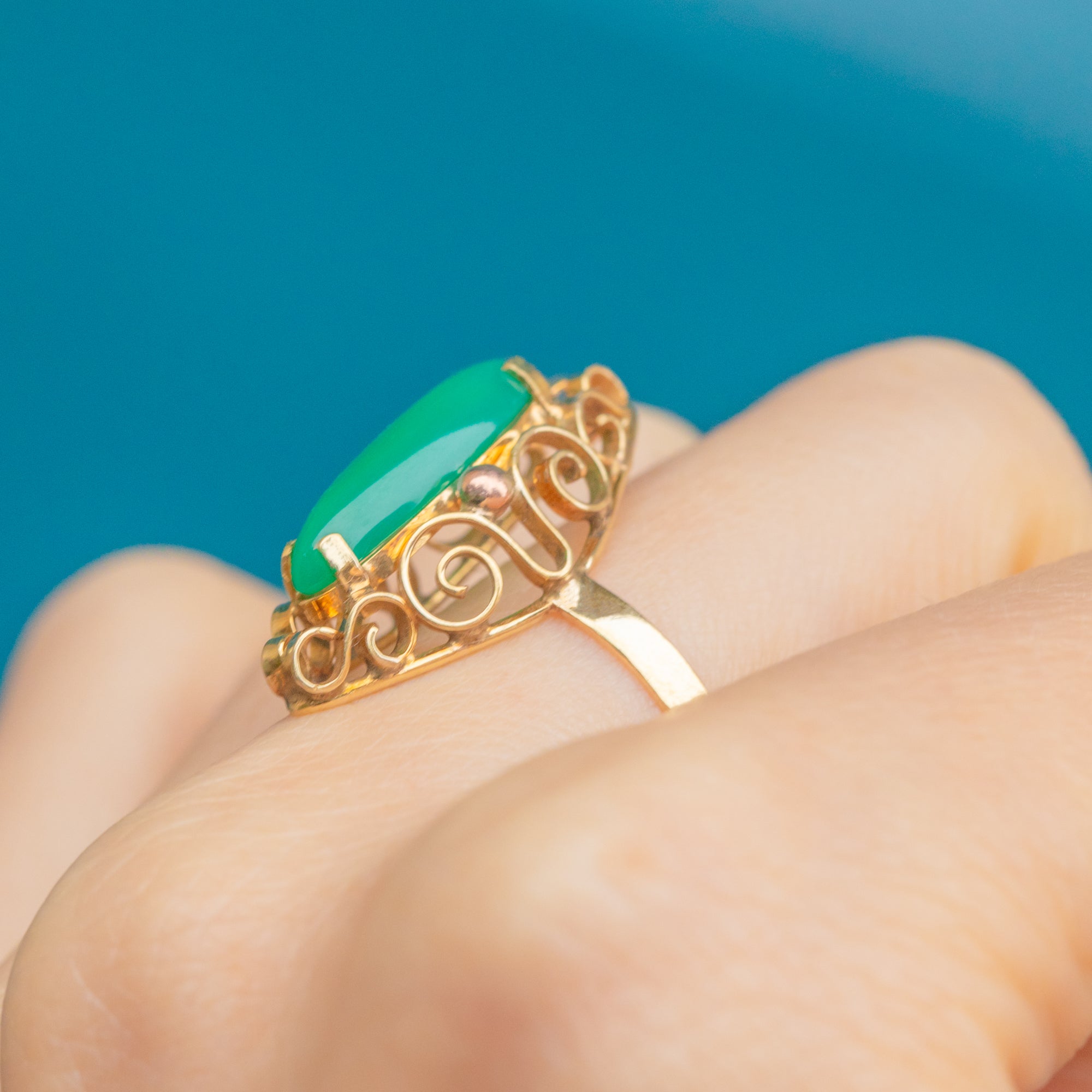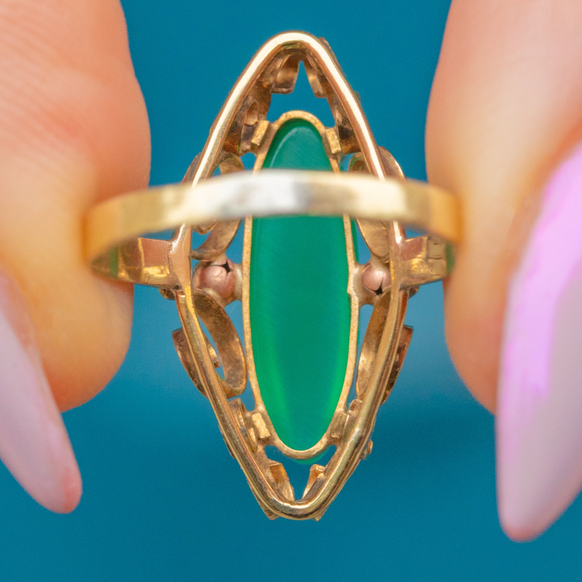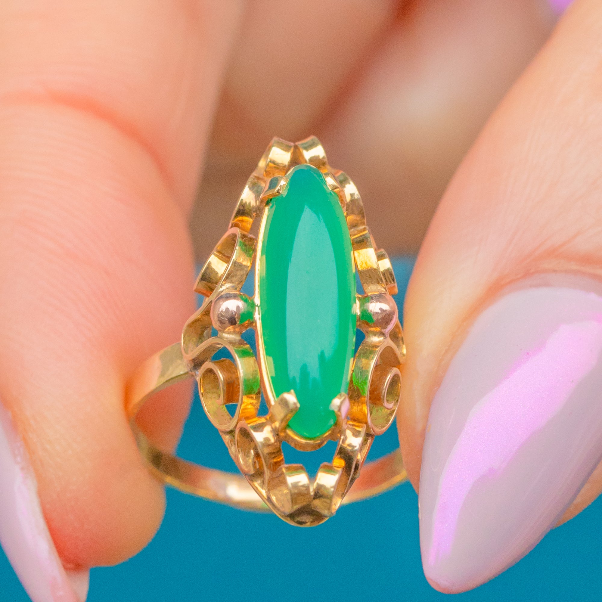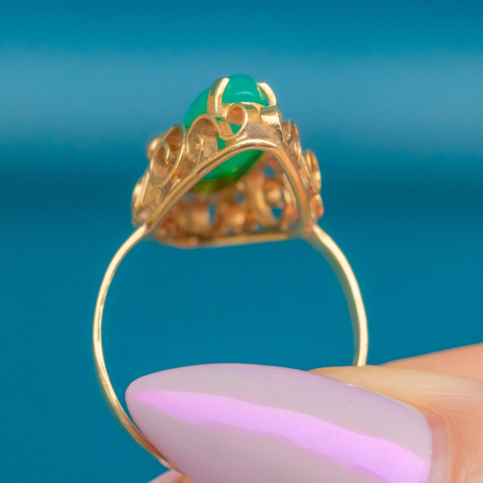EXCELLENT: The green Chalcedony is smooth, glossy and free from damage and glowing bright! The solid 14ct Gold band is well-shaped and polished  well with a gorgeous buttery yellow hue and no re-size marks or thinning to the band.