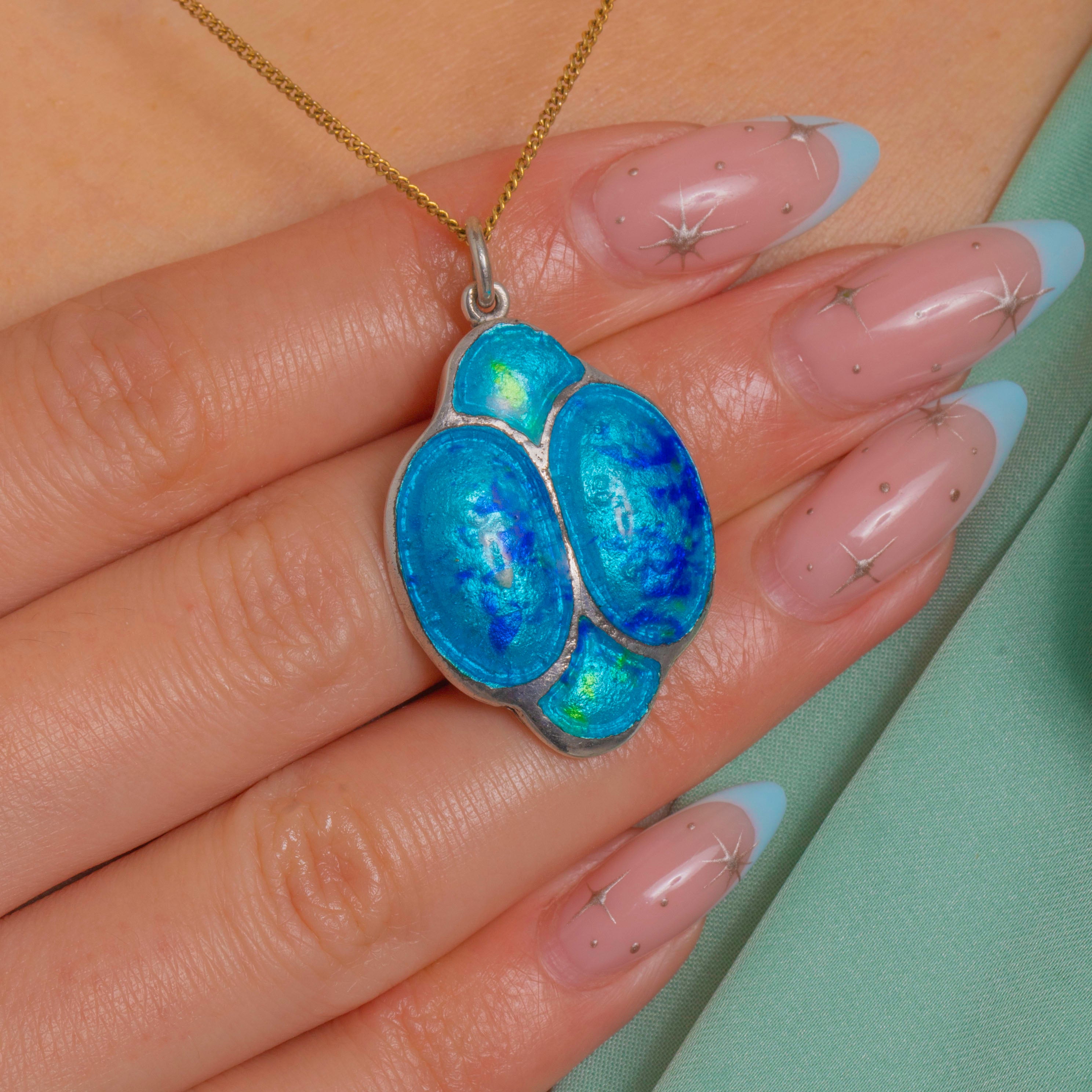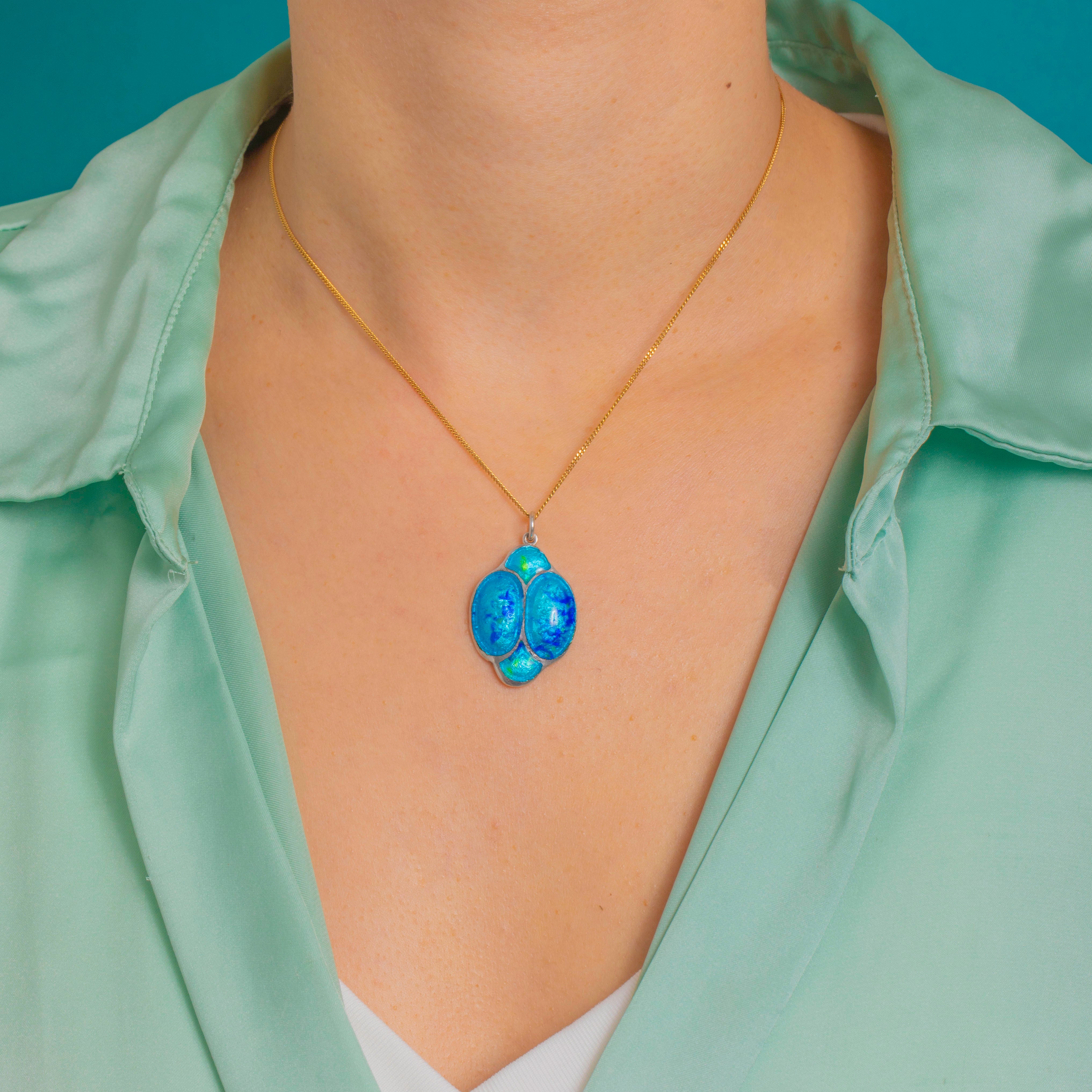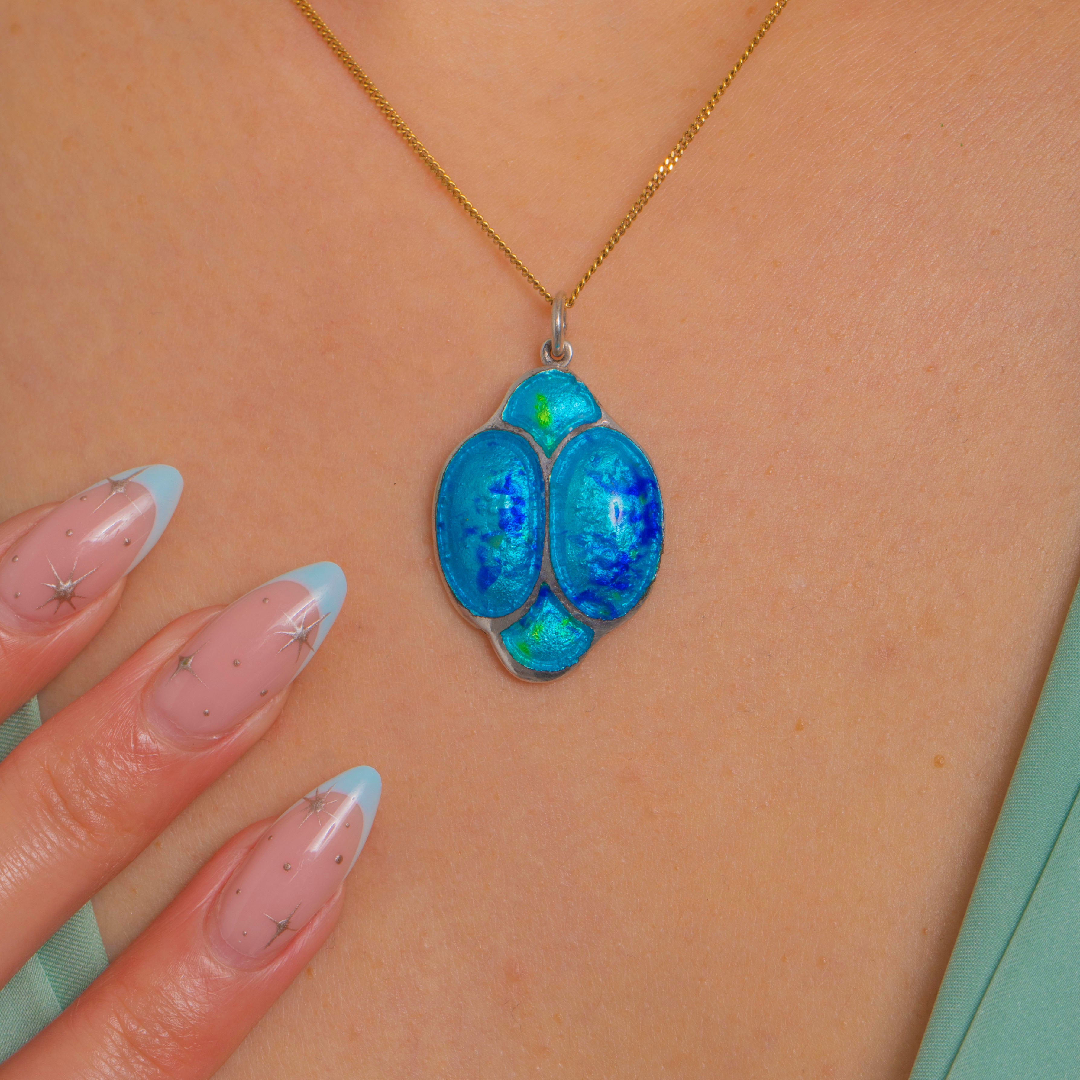 A striking Arts and Crafts Silver and Enamel pendant with a bold, sculptural presence. Four recessed Enamel cells are divided by raised Silver partitions, forming a stylised, biomorphic motif. The glossy Enamel shimmers in saturated turquoise and cobalt blues with lively green flashes, delivering a rich play of colour against the cool Silver frame.