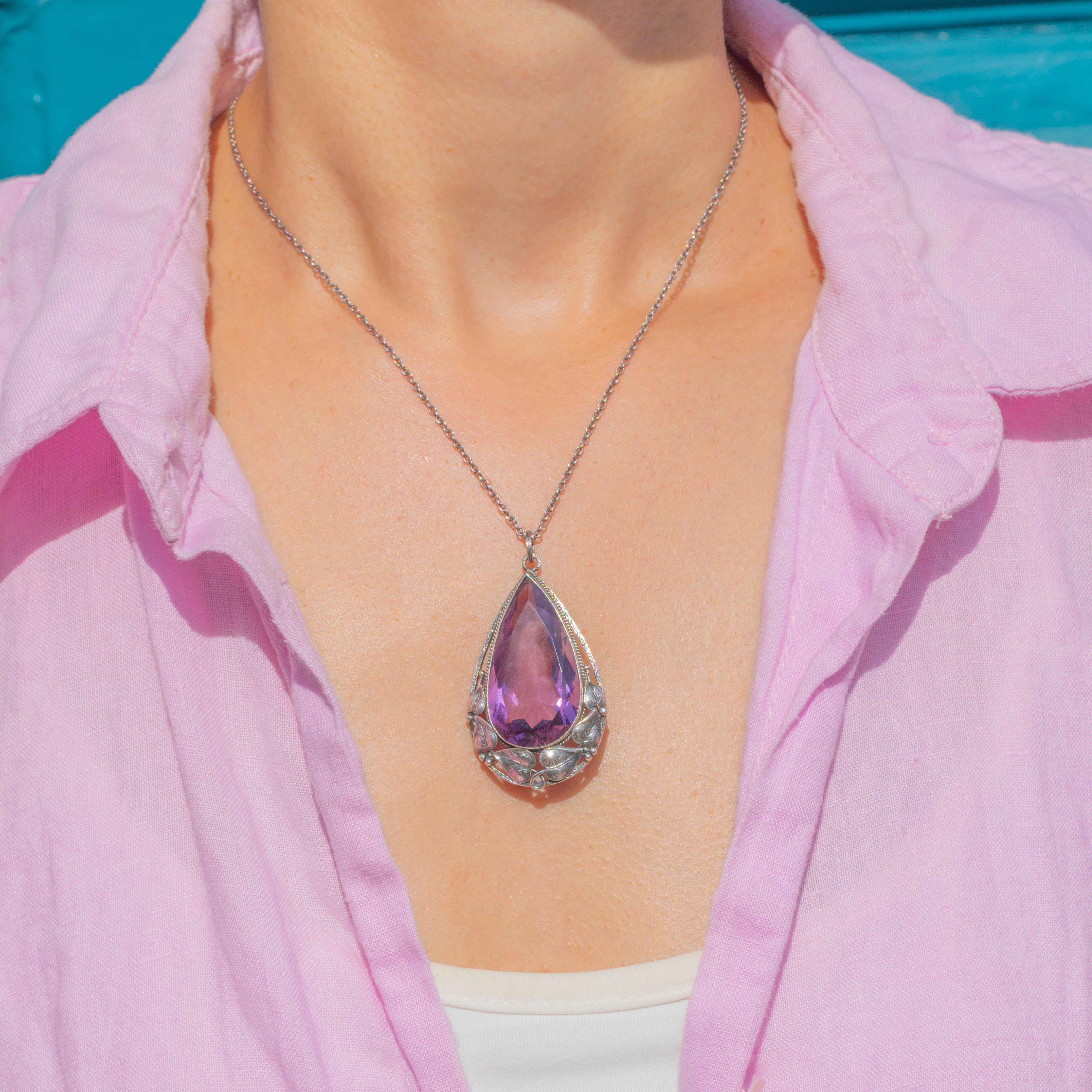 Arts & Crafts Silver Amethyst Pear Drop Pendant 22.50ct, Foliate Details