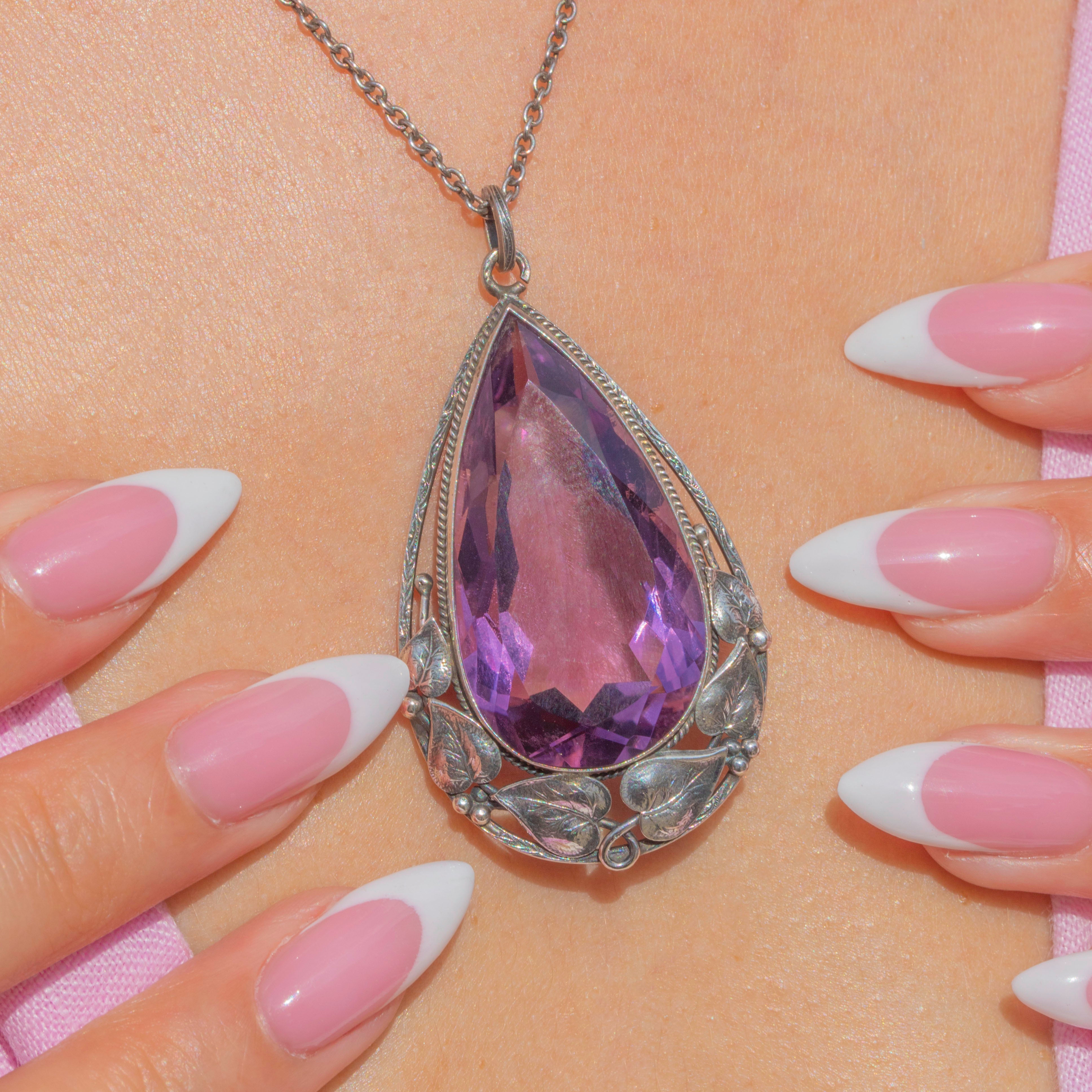 This striking antique pendant flaunts a large pear-cut Amethyst, boasting 22.50ct and radiating resplendent lavender and lilac hues from its crisp facets. The gemstone is set in lustrous Silver settings, adorned with foliate details which provide a gorgeous texture and depth.